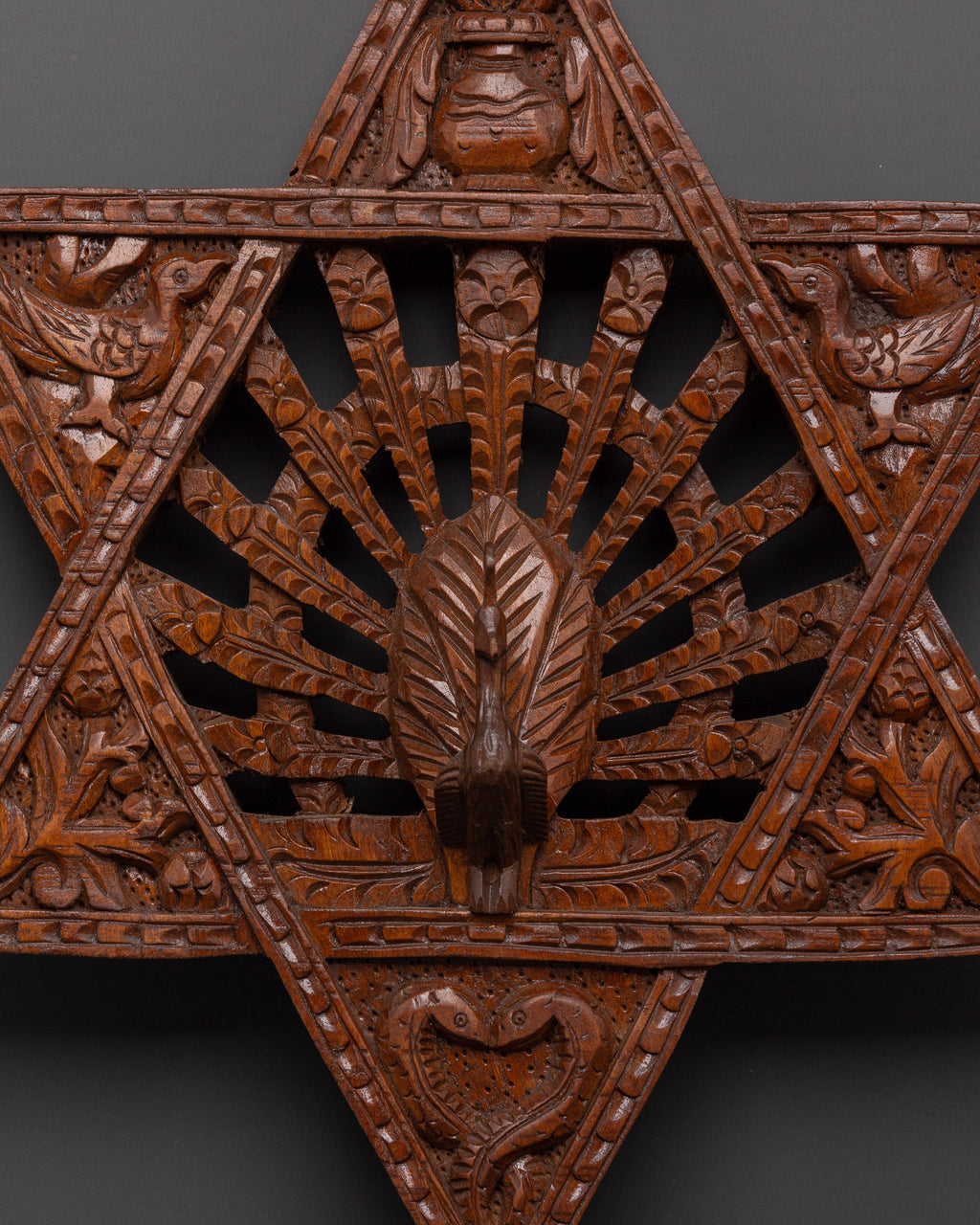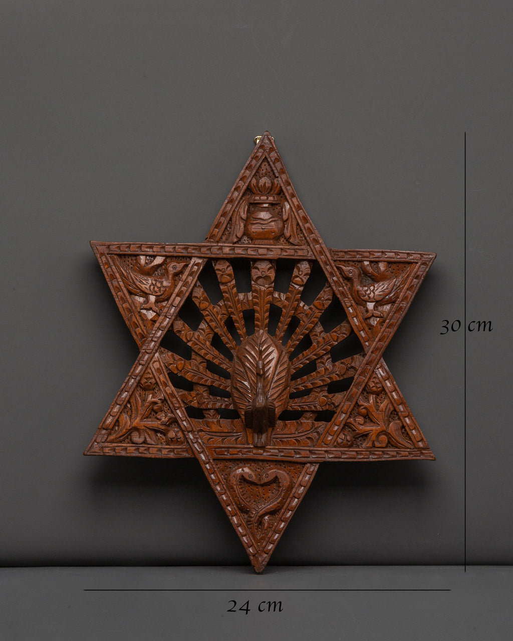 The star shape of the piece enhances its visual impact, with the peacock intricately carved at the center. Surrounding the peacock are detailed carvings of natural elements, such as leaves and vines, symbolizing life and growth. The hand-carved craftsmanship of this artwork allows every detail, from the peacock's feathers to the radiant star rays, to be finely displayed. The wood material adds warmth and organic beauty to the design, while its intricate patterns represent the connection between the natural world and spiritual enlightenment.