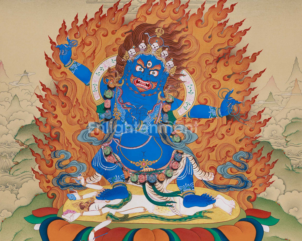 The Traditional Thangka of Buta Damara With Mitrupa is a powerful sacred artwork, hand-painted on fine cotton canvas using natural colors from Lhasa stones and finished with 24K gold. It is blazing with tantric force and wrathful compassion. The composition, in the elegant Karma Gadri style, balances a powerful central figure with expansive landscape elements.