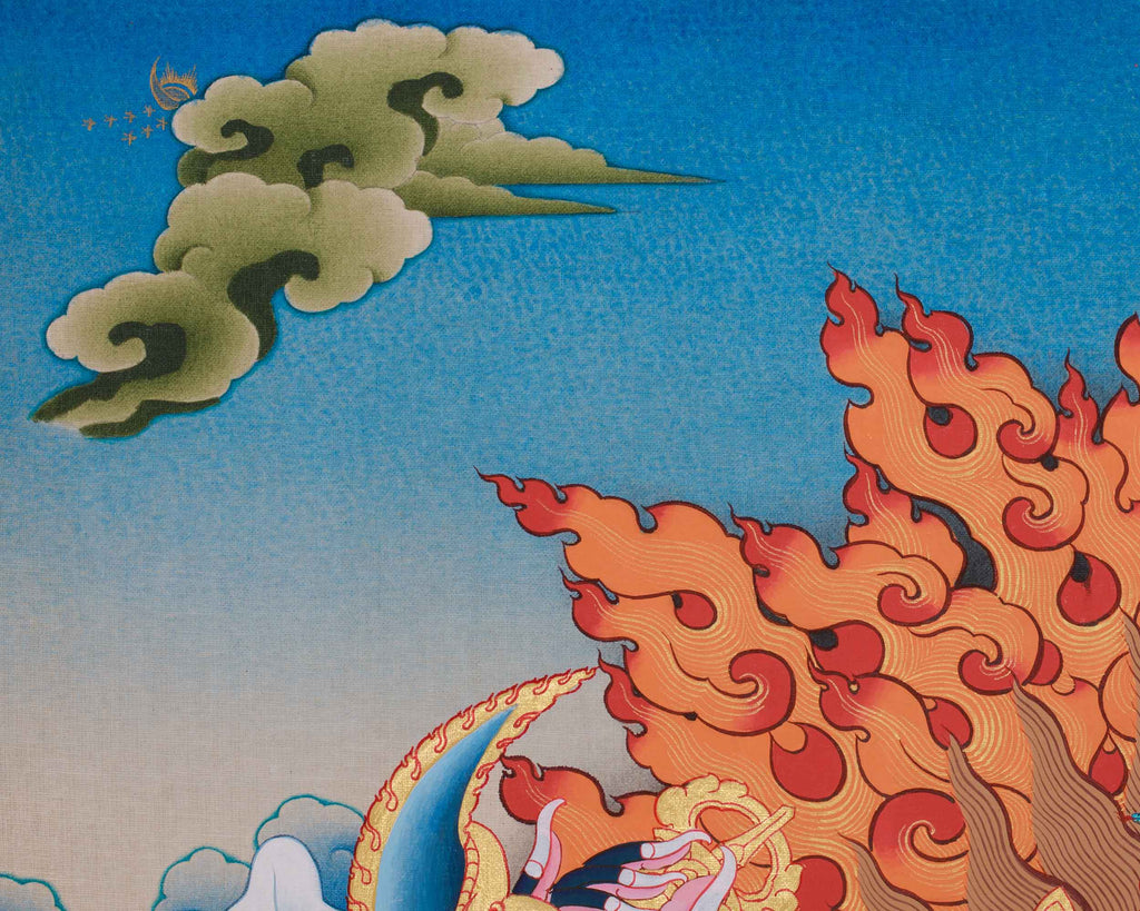 One of the main protectors of the Karma Kagyu tradition of Tibetan Buddhism is Mahakala Bernagchen, also referred to as the "Great Black Cloaked One." He is a ferocious manifestation of compassion who takes on a fierce form to protect the Dharma and vanquish obstacles that stand in the way of enlightenment. Vajrayana teachings state that Mahakala transforms kindness into a potent defensive force by emerging from the compassionate spirit of Avalokiteshvara. His terrible visage represents the brave annihilation of ignorance, ego, and negative influences that impede spiritual development. He acts as a spiritual bodyguard who aggressively defends loyal practitioners, but his essence is sympathetic despite his angry demeanor. In this thangka, Mahakala Bernagchen is depicted with symbolic attributes, including a skull crown, a flaming aura, and a skull cup, symbolizing the transformation from ignorance to wisdom. His wrathful eyes and vajra-handled curved knife highlight his protective role in removing obstacles to enlightenment. Seated on a lotus and sun disc, his image exudes strength and protection, embodying Tibetan artistry and tantric symbolism. This thangka is a significant artistic treasure with roots in the Himalayan tradition as well as spiritual protection. Bring this sacred work of art into your home today to welcome fearless protection and potent spiritual energy.