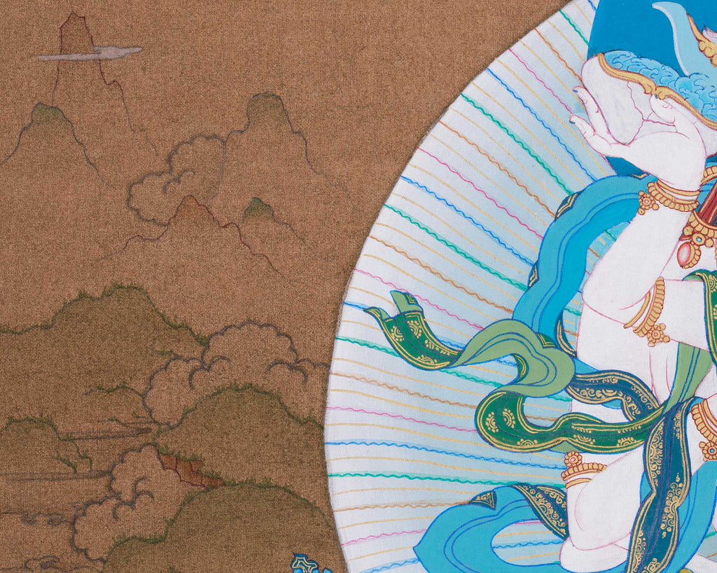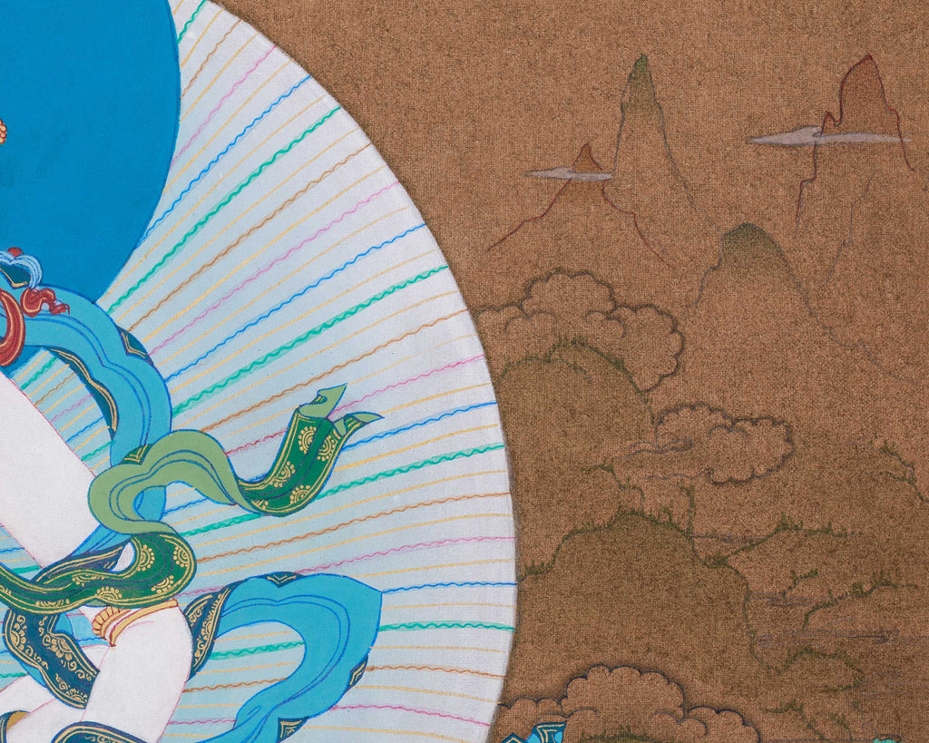 Vajrasattva, with his consort, holds a profound place in Buddhist history and tantra. Vajrasattva is revered as the embodiment of primordial purity and the supreme deity of purification, invoked to cleanse negative karma and restore spiritual clarity. Together with his consort, he embodies the unbreakable bond between wisdom and compassion, and between method and insight. This divine pairing originates from tantric traditions where enlightenment is realized through balance, making Vajrasattva practice essential in Vajrayana lineages. This Vajrasattva thangka depicts him with his consort in a serene embrace, seated on a lotus and moon disc symbolizing purity and stability. He holds a vajra and bell, representing skillful means and wisdom, with flowing scarves and a radiant halo that evoke awakened movement. Painted in the Karma Gadri style, it feels spacious and harmonious, suitable for meditation spaces or altars. Invite purification and clarity—bring this powerful piece home to deepen your practice.