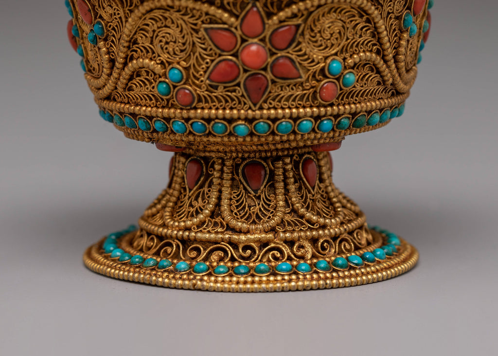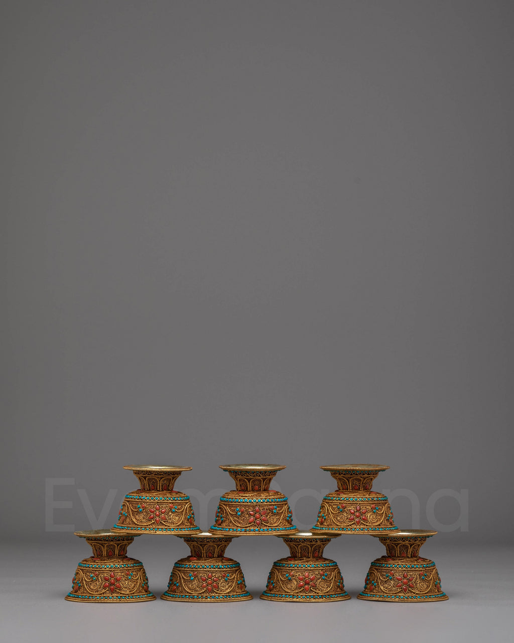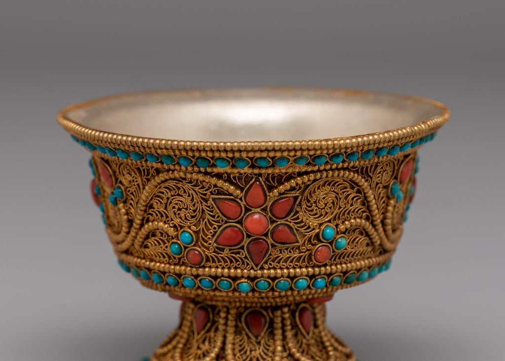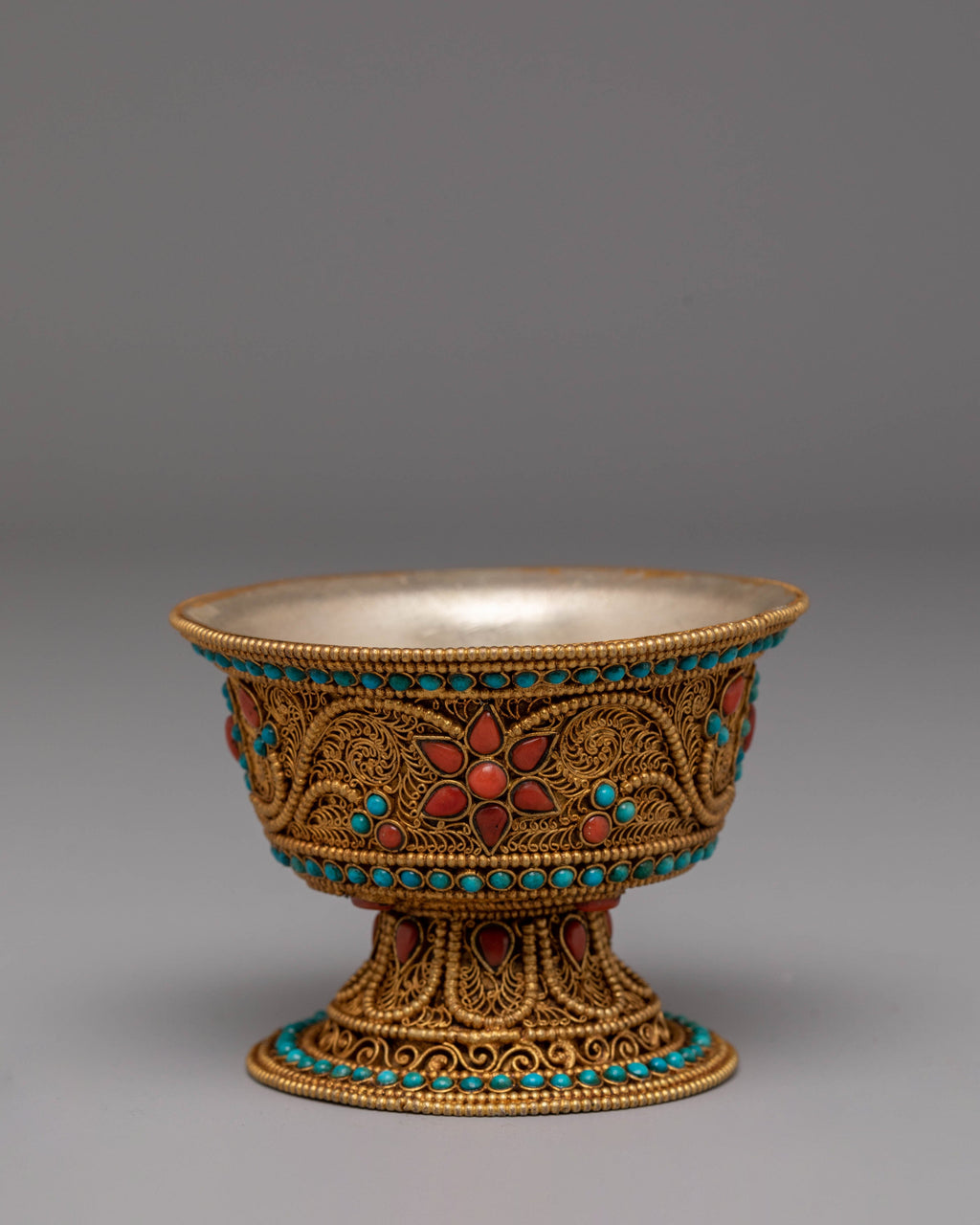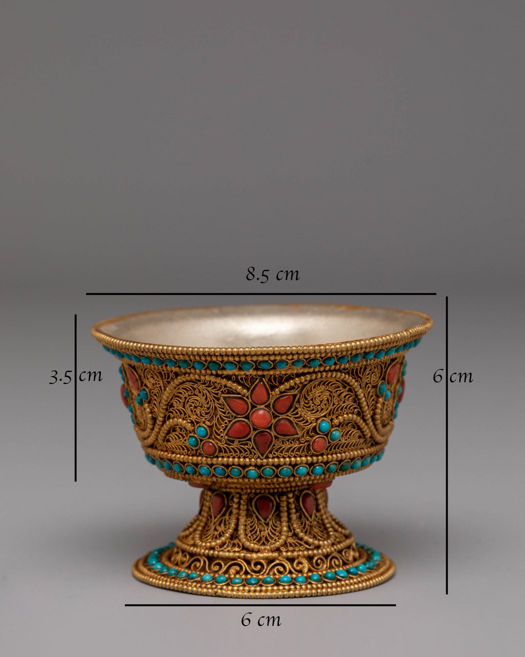 The delicate coral and turquoise stones embedded around the rim of each bowl add rich symbolism—coral represents vitality and protection. In contrast, turquoise is known for its healing and spiritual energy. The finely detailed filigree work on the bowl reflects traditional Tibetan artistry, representing spiritual purity, divine protection, and the richness of Buddhist symbolism. The inner depth of 3.5cm allows offerings, such as water or symbolic items, during meditation or rituals, making these bowls perfect for ceremonial practice or as decorative additions to your altar.