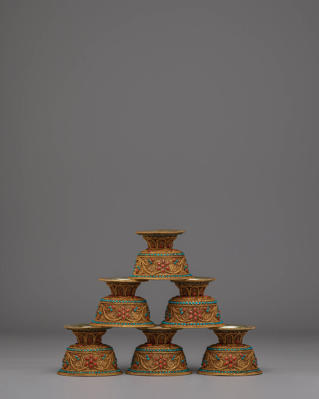 This Traditional Tibetan Buddhist Offering Bowl is a beautifully handcrafted ritual item that elevates your spiritual practices. Standing 6cm tall with a base diameter of 8.5cm, each bowl is meticulously made from a copper body, showcasing intricate filigree work and adorned with coral and turquoise artificial stones. Each bowl weighs 0.17kg, with a total weight of 1.16 kg for the complete set, making it a substantial yet manageable piece for ceremonial use.