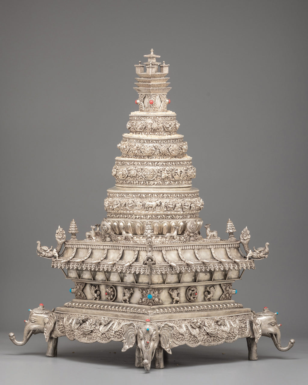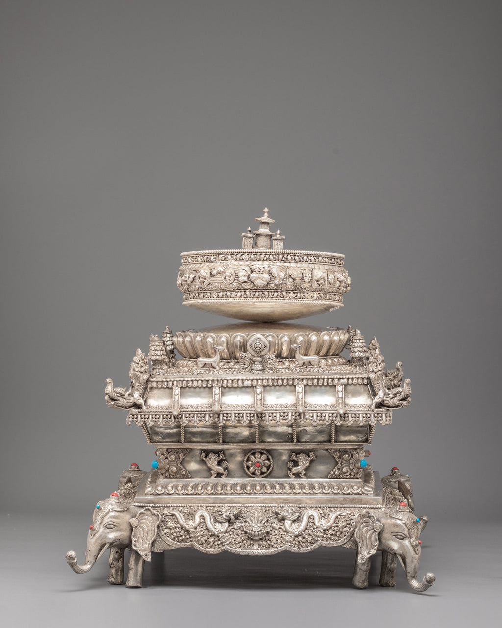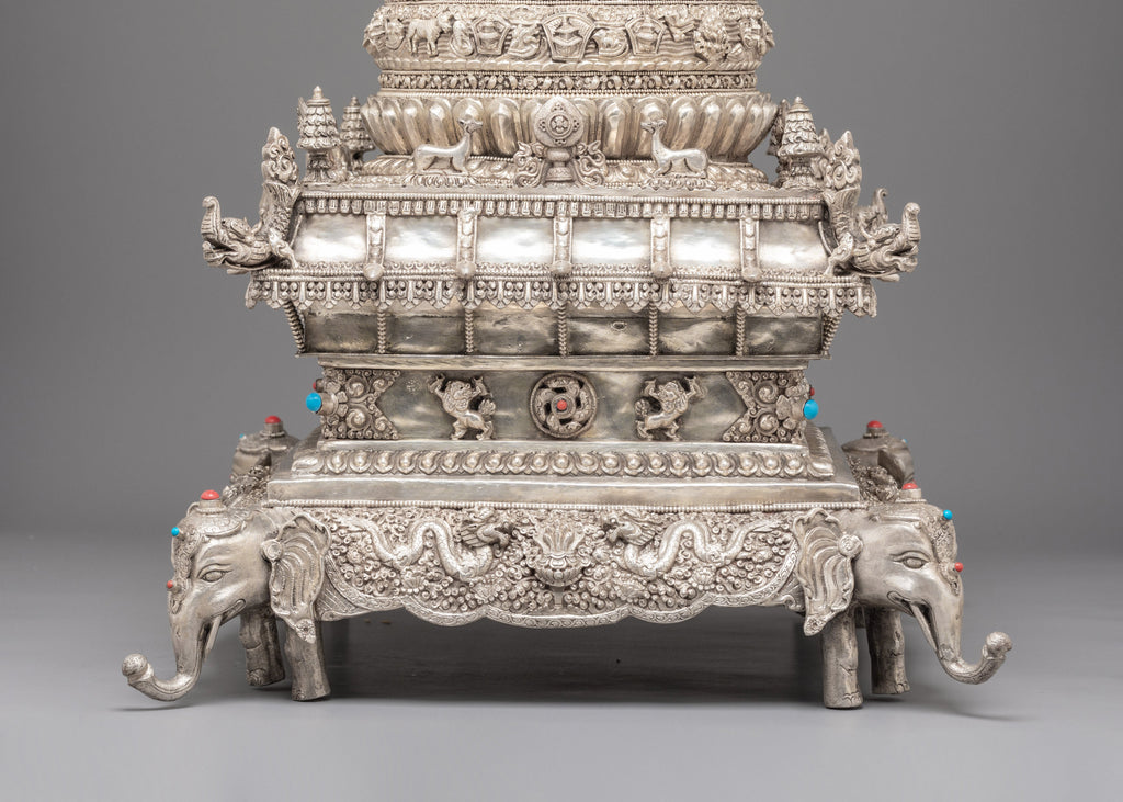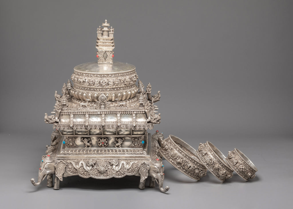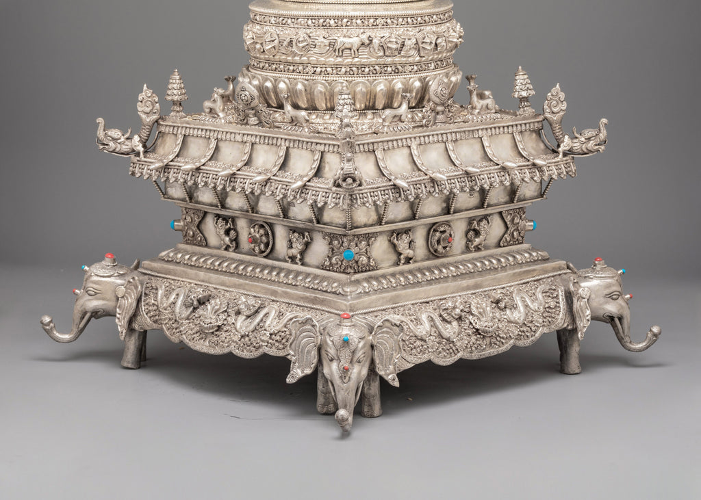 Every layer of this silver mandala set is decorated with intricate motifs inspired by ancient Tibetan craftsmanship. The lower sections feature guardian elephant figures, auspicious emblems, and traditional floral patterns that highlight the artisan’s skill. Each tier is shaped to represent sacred Buddhist cosmology—concentric realms rising toward the pinnacle of awakened clarity. The decorative stone inlays and refined silver details enhance its spiritual elegance, making it a standout ritual object for practitioners, collectors, and spiritual home décor enthusiasts.