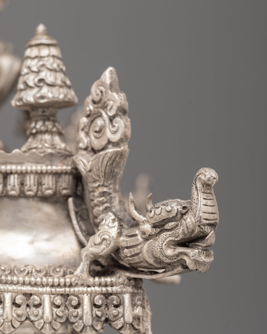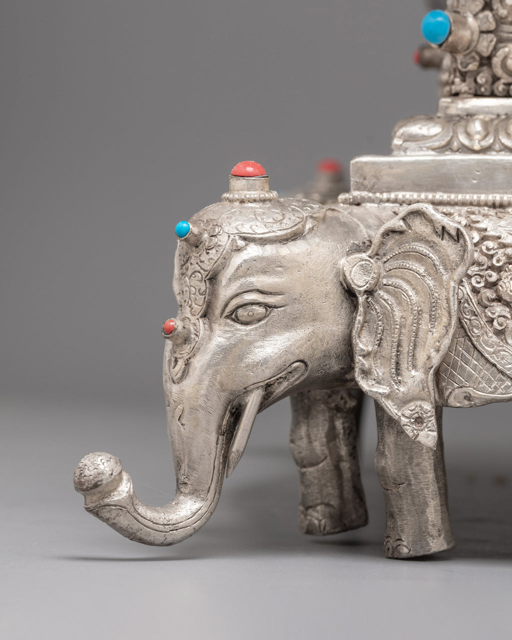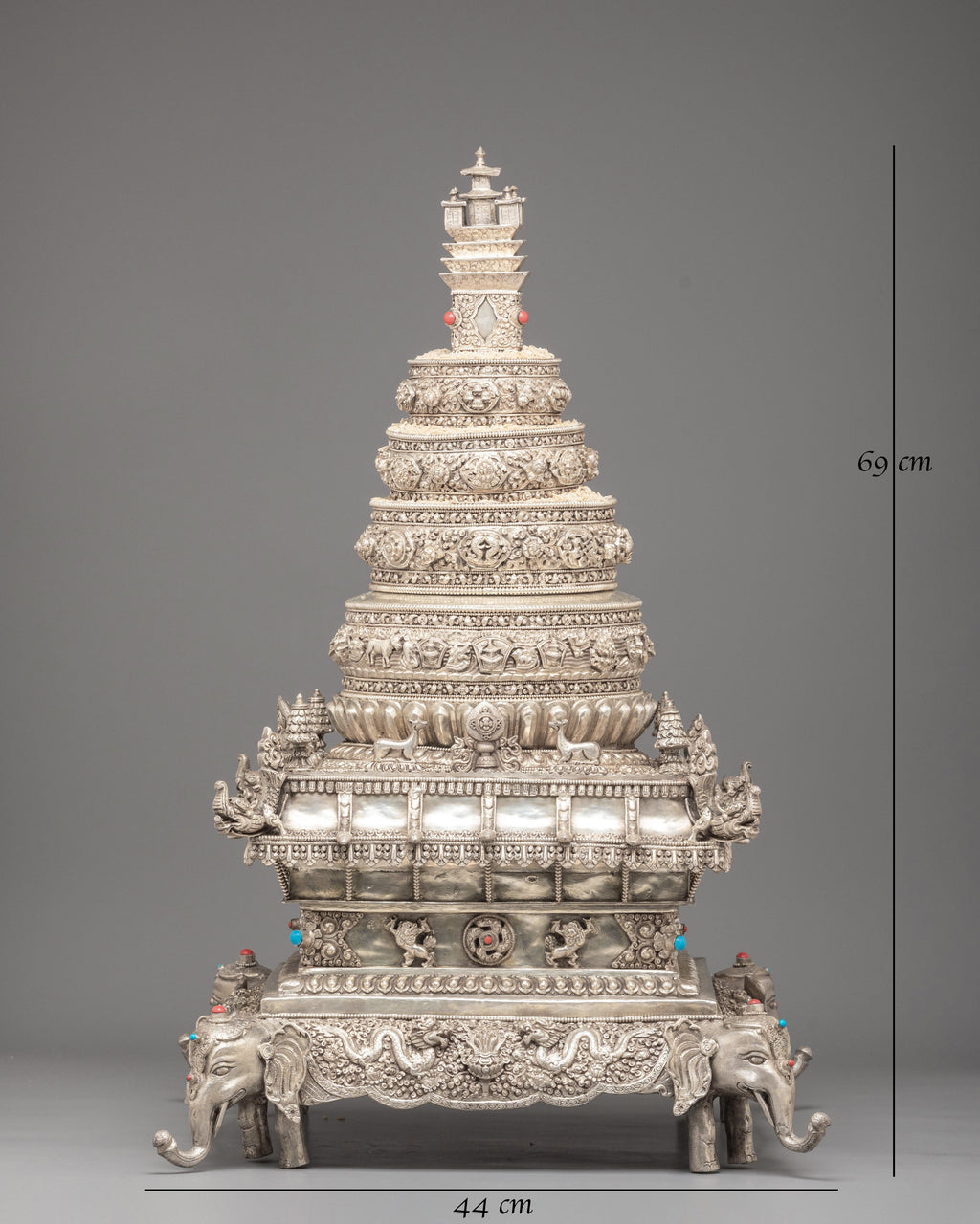 Every layer of this silver mandala set is decorated with intricate motifs inspired by ancient Tibetan craftsmanship. The lower sections feature guardian elephant figures, auspicious emblems, and traditional floral patterns that highlight the artisan’s skill. Each tier is shaped to represent sacred Buddhist cosmology—concentric realms rising toward the pinnacle of awakened clarity. The decorative stone inlays and refined silver details enhance its spiritual elegance, making it a standout ritual object for practitioners, collectors, and spiritual home décor enthusiasts.