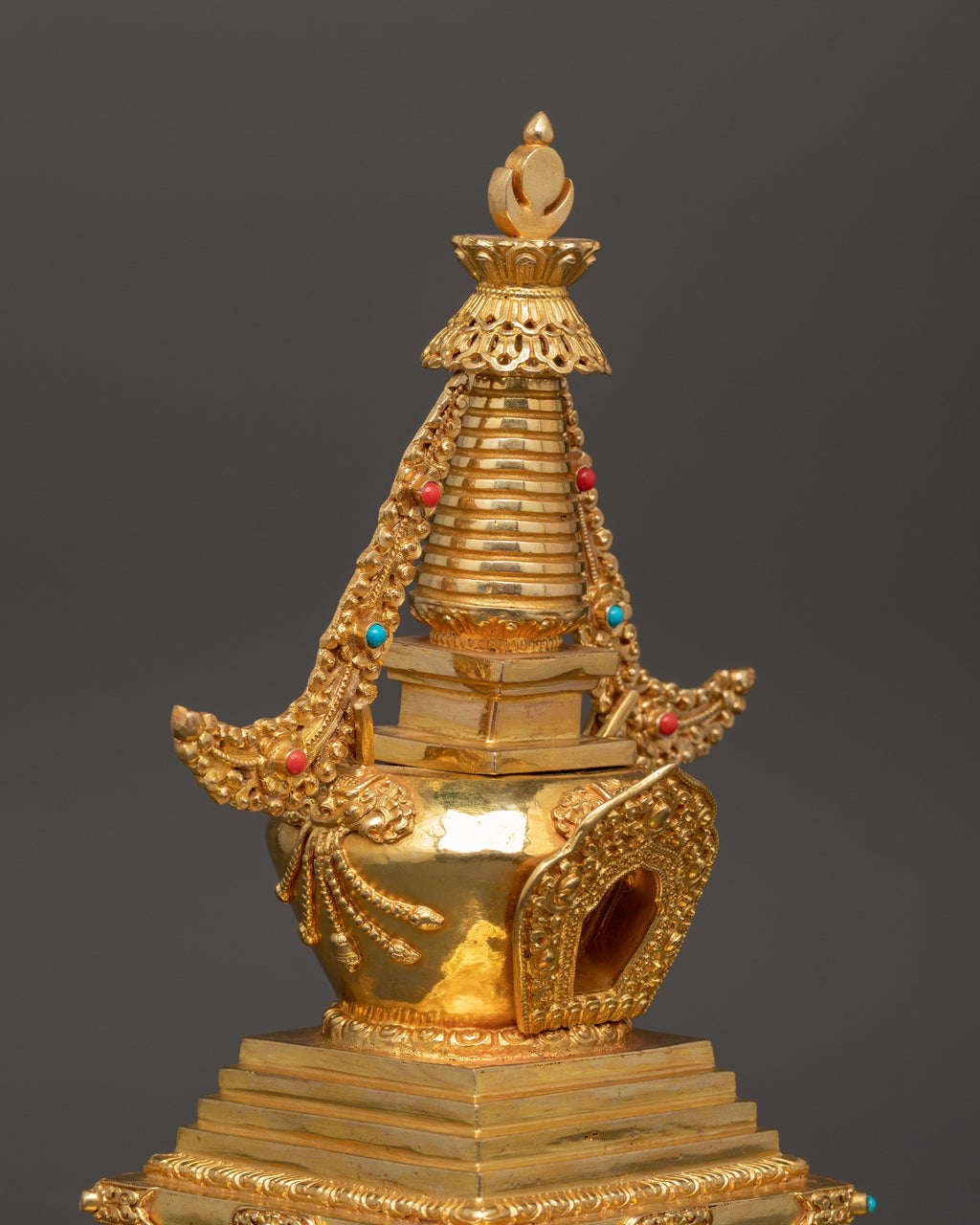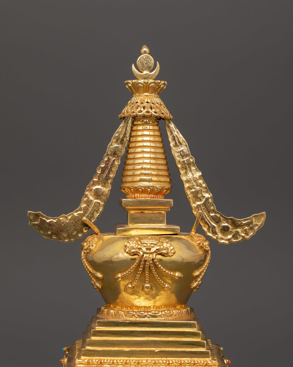 The addition of artificial coral and turquoise stones enhances the stupa's aesthetic, bringing vibrant color and energy into your space. Coral is often associated with vitality and emotional healing, while turquoise is considered a stone of spiritual protection and balance. Together, these stones create a harmonious energy flow that is believed to promote positive transformations and spiritual growth. These stones also add a touch of elegance, elevating the stupa’s divine beauty. The stupa is not merely a decorative object but a powerful spiritual symbol that fosters an atmosphere of calm and contemplation.