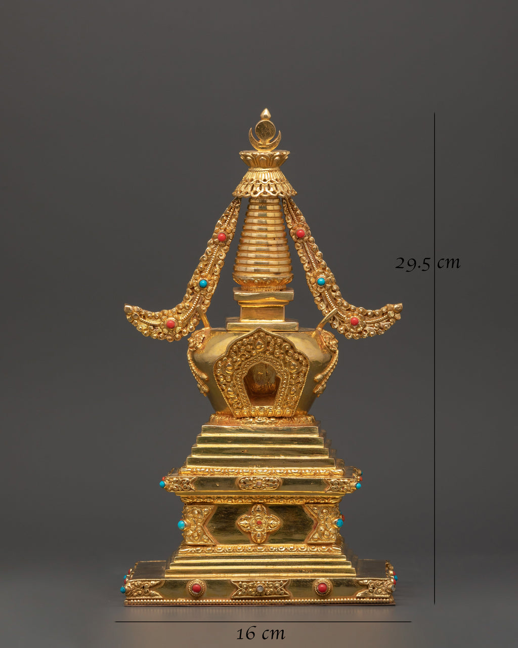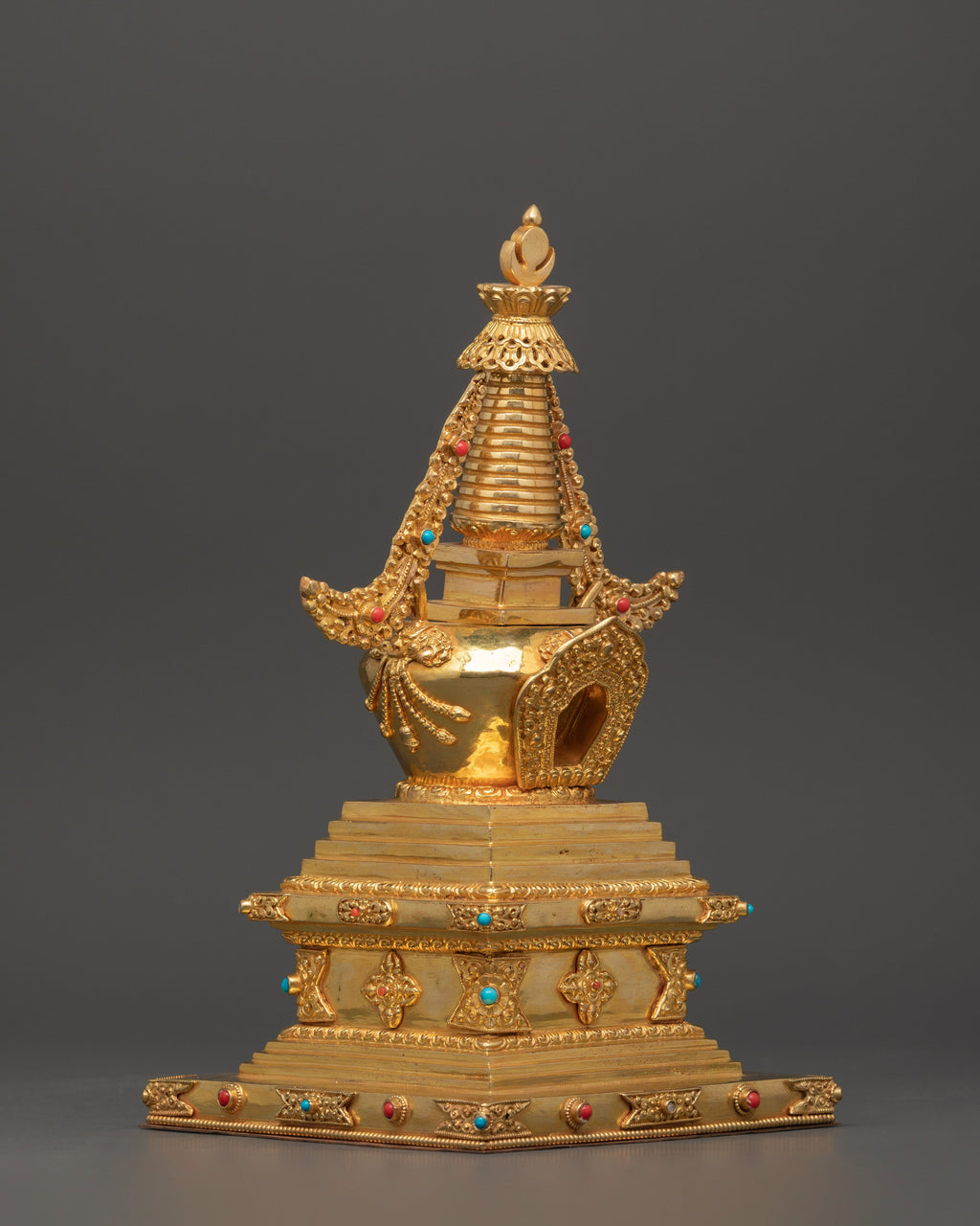 This Traditional Tibetan Stupa Art is a stunning piece that embodies the spiritual essence of Tibetan Buddhist culture. Meticulously crafted from copper with a beautiful gold-plated finish, the stupa features intricate carvings and symbolic motifs that convey profound spiritual meanings. The towering spire and ornate design reflect the sacred path toward enlightenment, while the detailed base represents the stable foundation of spiritual practice. Every curve and design element is imbued with sacred significance, representing protection, peace, and the interconnectedness of all beings.