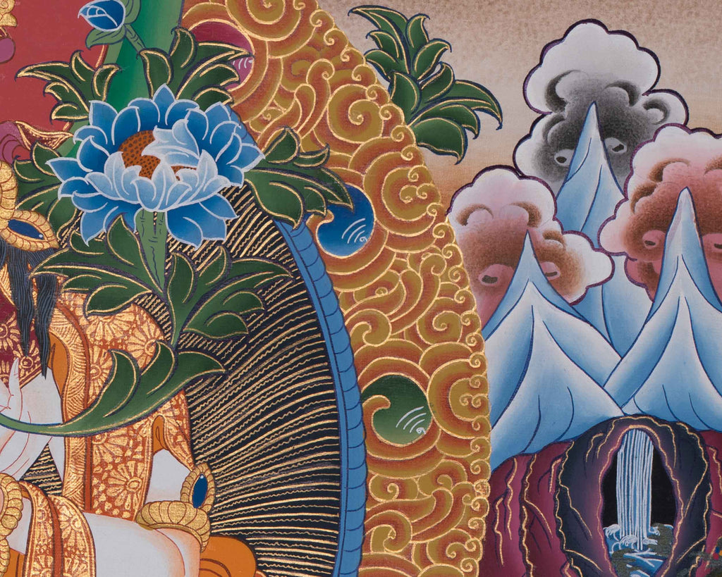The delicate brushwork, vivid colors, and intricate gold accents showcase Dava’s skill, fostering a peaceful, reflective ambiance. This traditional White Tara is more than just art; it serves as a portal to ancient wisdom and inner calm, ideal for enhancing your space and uplifting your spirit.