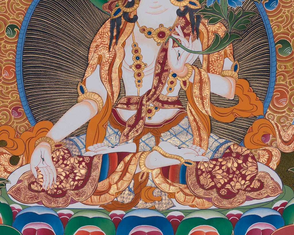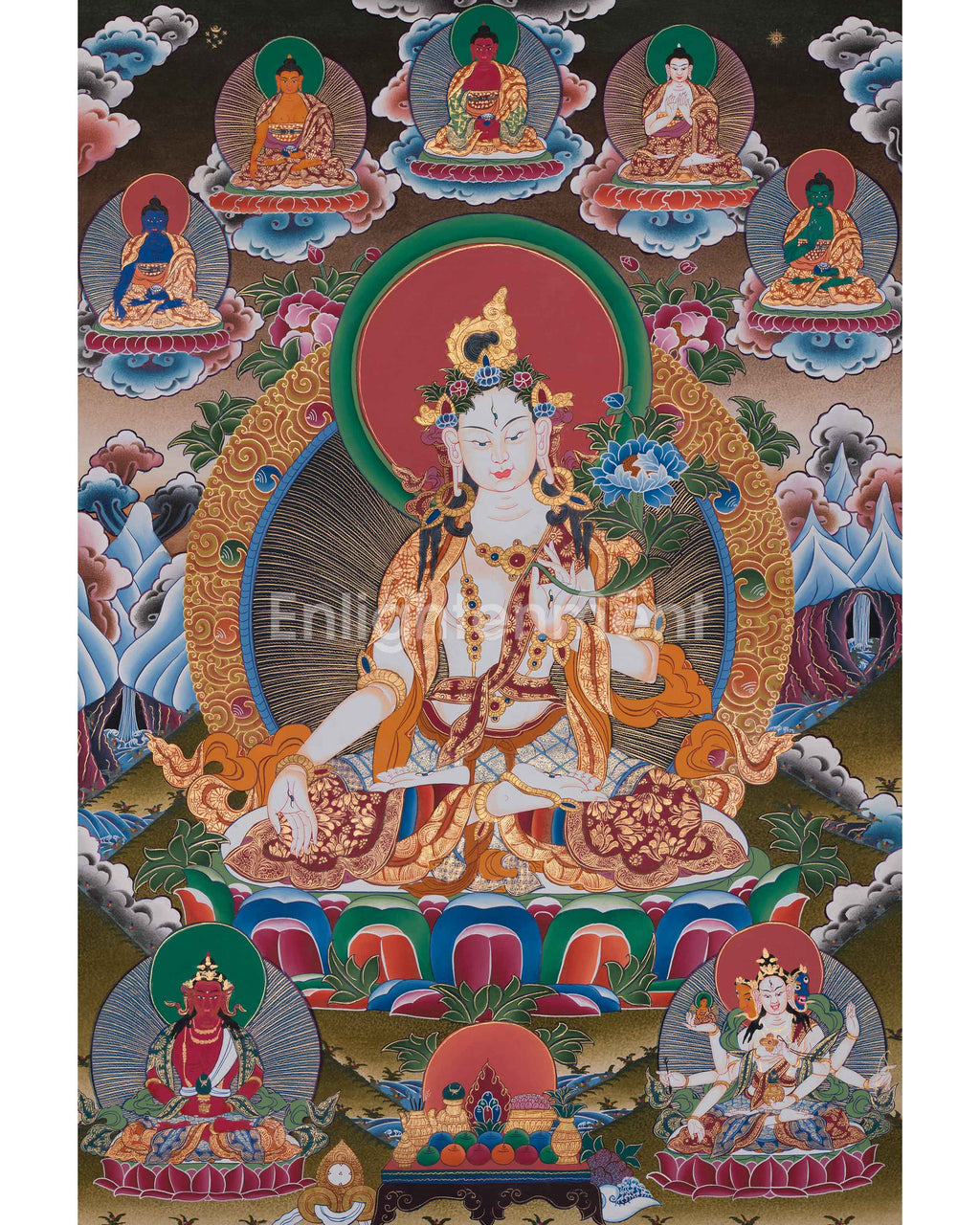 Traditional White Tara Artwork | Featuring Amitayus Buddha, Namgyalma, and Five Dhyani Buddhas