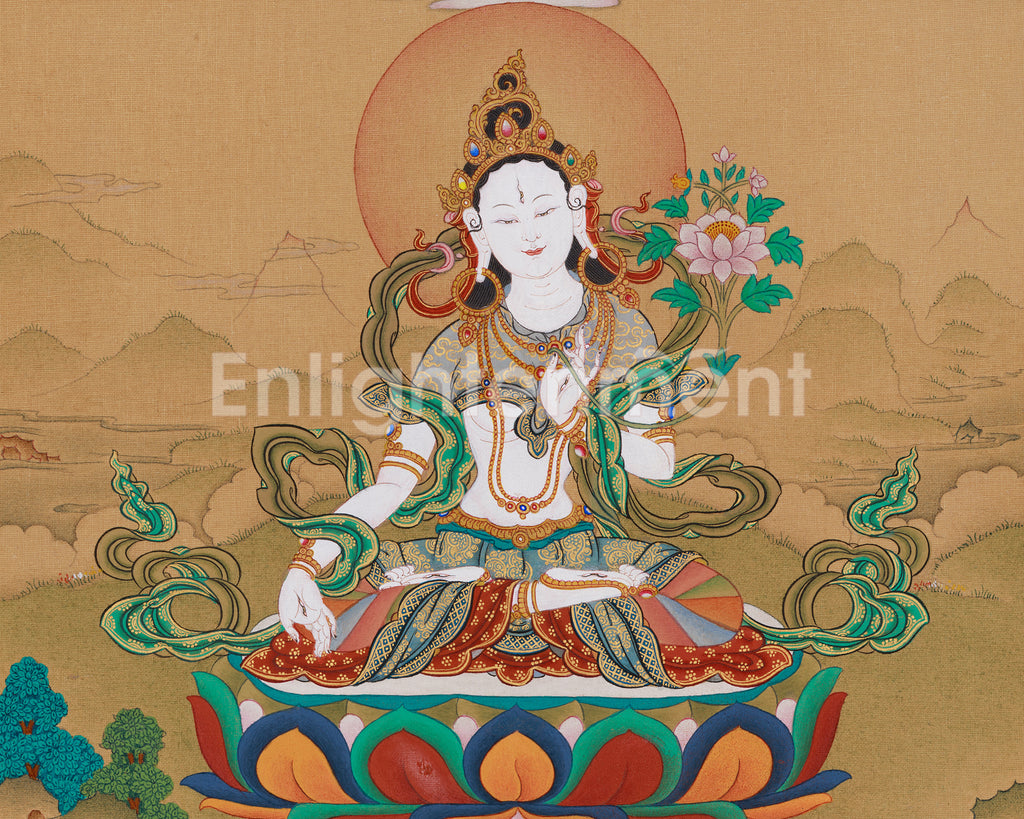 Hand-Painted Traditional White Tara Thangka with Amitabha Buddha | Tibetan Buddhist Art of Compassion and Infinite Light