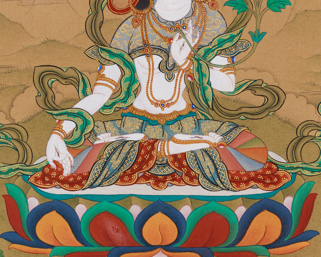 In this thangka, White Tara is portrayed in her serene and graceful form, wearing a five-jeweled crown and holding a Pundarika (lotus) between her thumb and ring finger, symbolizing purity and spiritual growth. Her ability to perceive and heal all beings is represented by her sitting in the Vajra posture with her eyes on the soles of her feet. A moon disc rests on a lovely lotus seat underneath her seated body, and a divine aura envelops her.