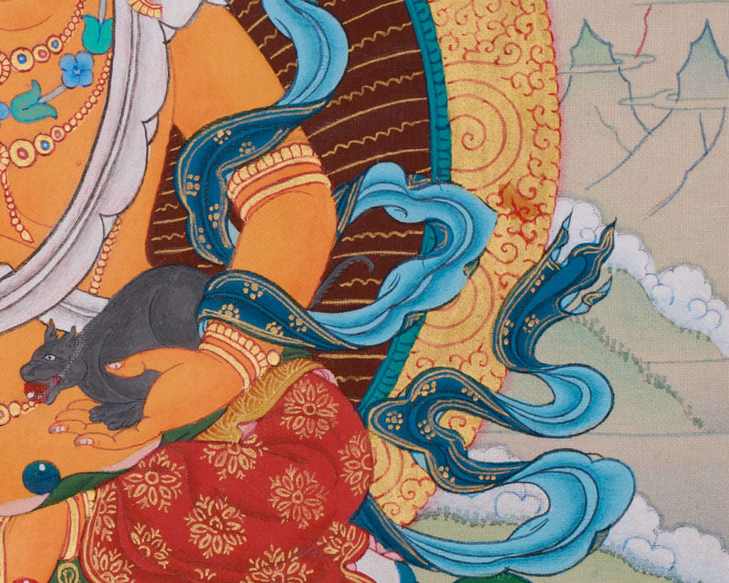 Dzambhala is honored in Tibetan Buddhism as the deity who provides material wealth and removes obstacles to prosperity. Usually depicted as a joyful figure, he holds a citron, which symbolizes his generosity. The mongoose spitting jewels in his hand also illustrates his ability to grant fortune to his followers. He sits on a lotus throne, encircled by symbols of prosperity and decorated with a five-jeweled crown and utpala garland. The lively background featuring lush plants, clouds, and flowing water reflects the peace and harmony he offers to those seeking his blessings. The 24K gold details enhance the sacred feeling of the thangka, making this Traditional Yellow Dzambhala thangka a luminous presence in any space.