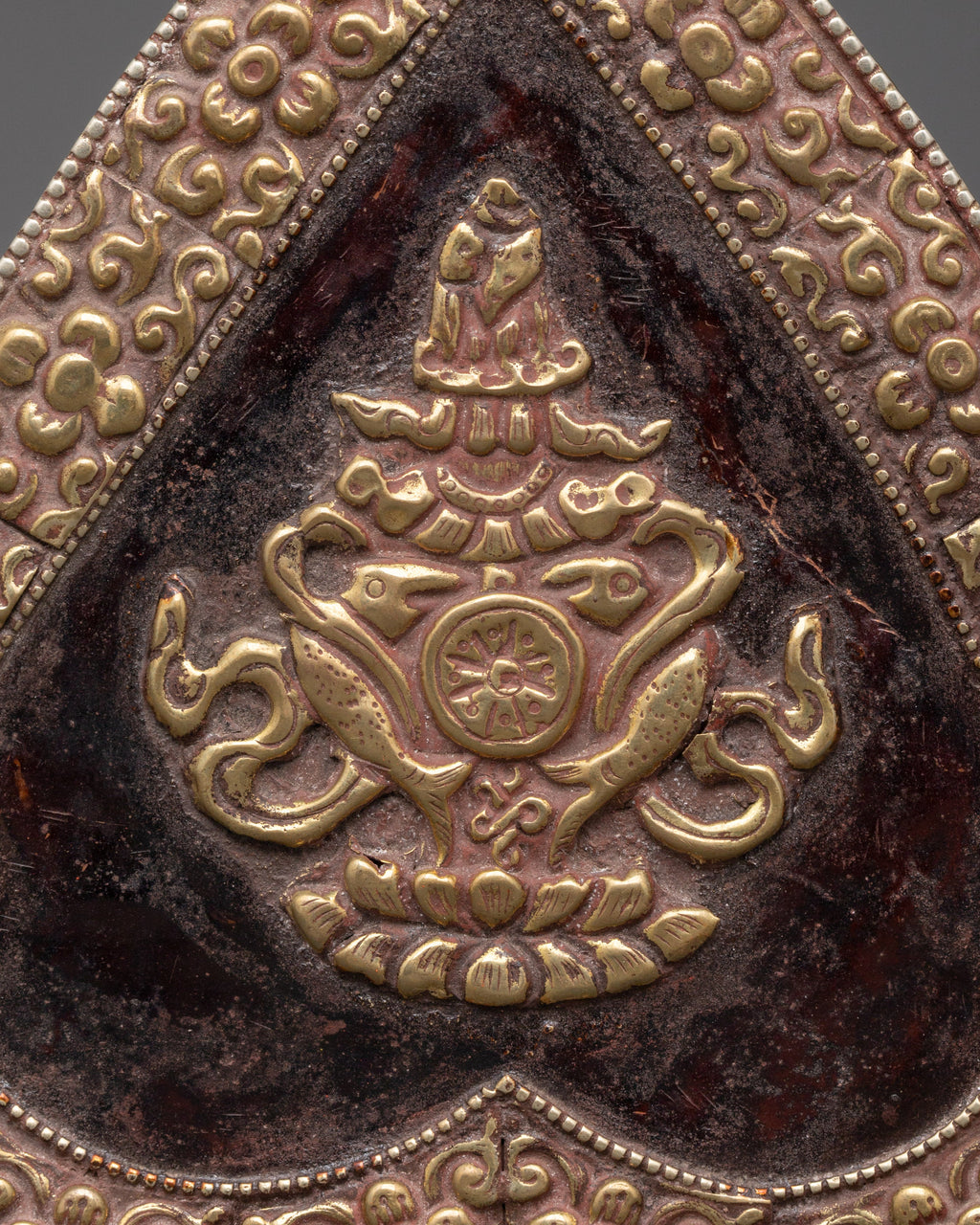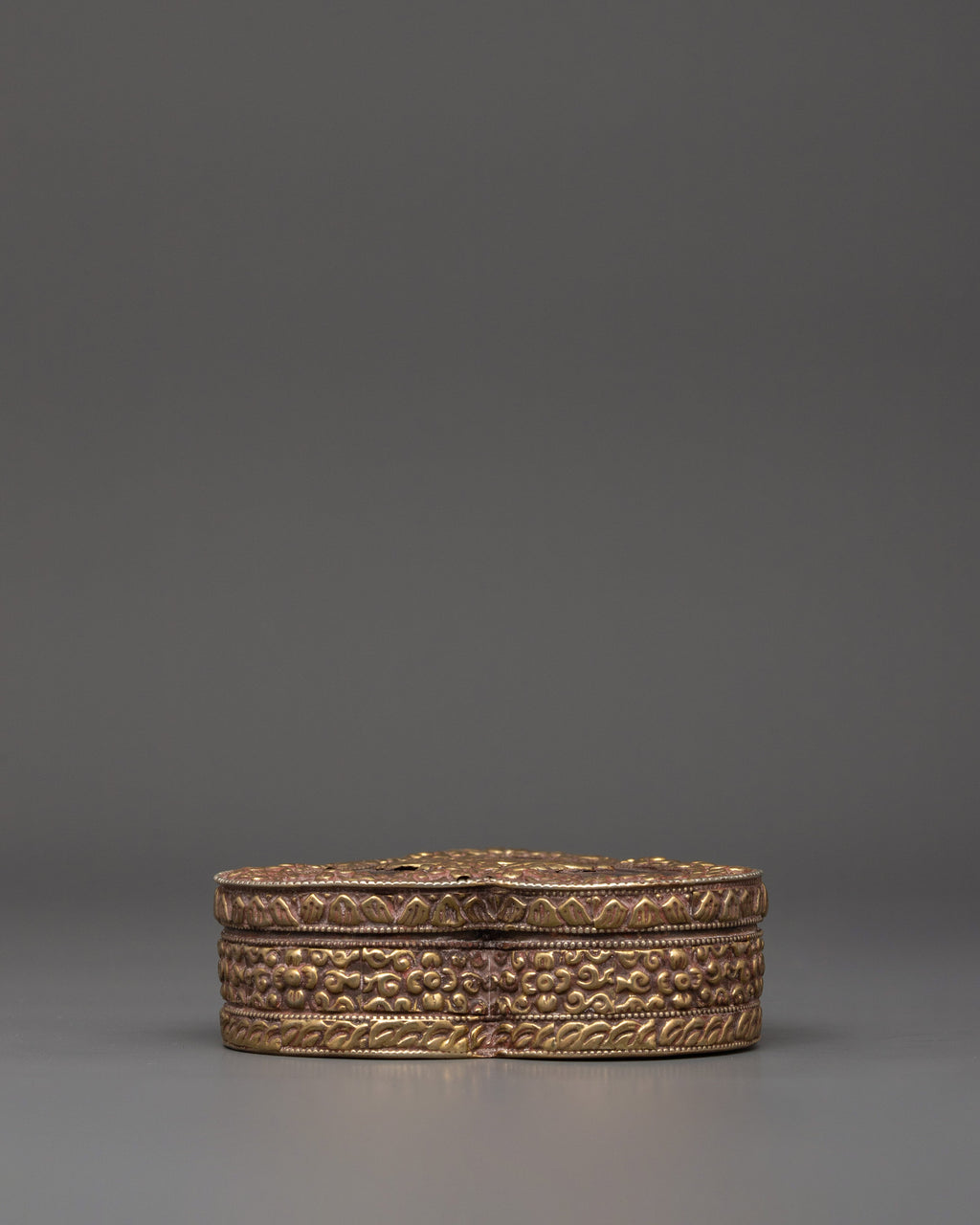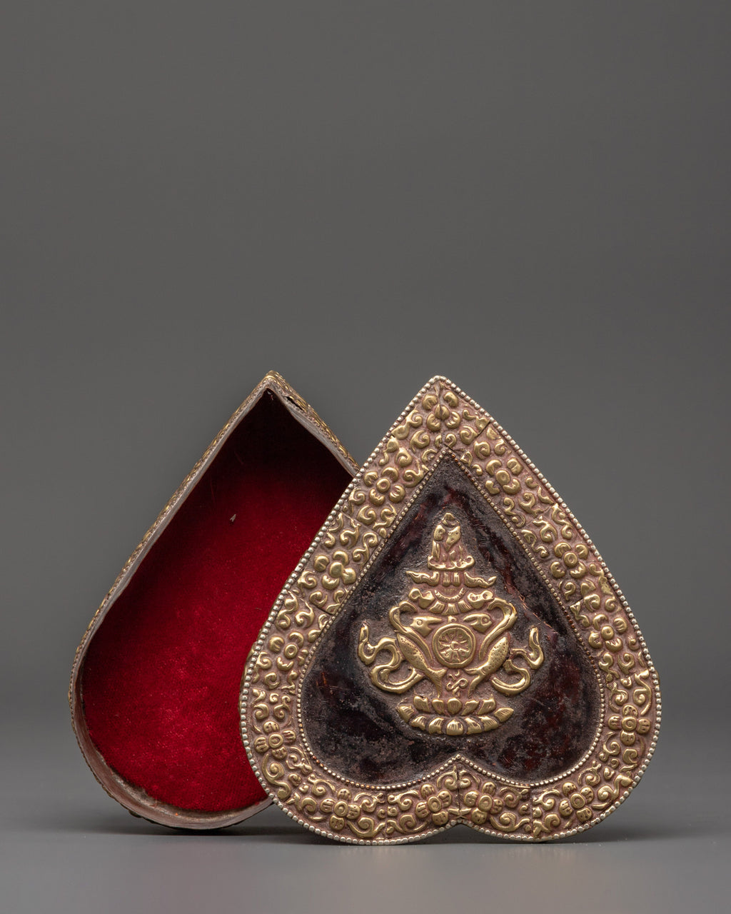 This handcrafted treasure box for decor, crafted of copper and brass, is a wonderful adornment inspired by Tibetan Buddhist art. Standing 4 cm tall with a 13 cm base and weighing 0.222 kg, it denotes abundance, knowledge, and spiritual protection. The magnificent brass craftsmanship has complex floral carvings on the outer layer, with two golden fish and lucky symbols engraved in the center.