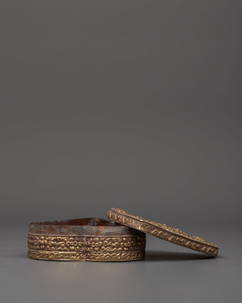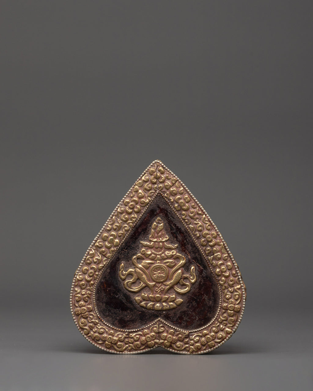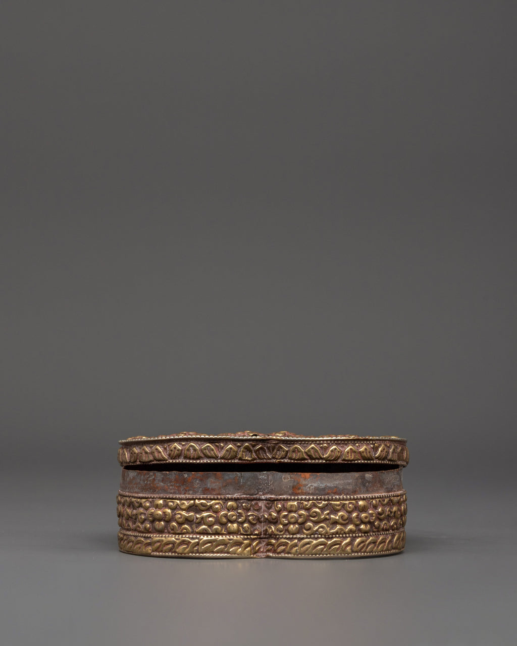 This handcrafted treasure box for decor, crafted of copper and brass, is a wonderful adornment inspired by Tibetan Buddhist art. Standing 4 cm tall with a 13 cm base and weighing 0.222 kg, it denotes abundance, knowledge, and spiritual protection. The magnificent brass craftsmanship has complex floral carvings on the outer layer, with two golden fish and lucky symbols engraved in the center.