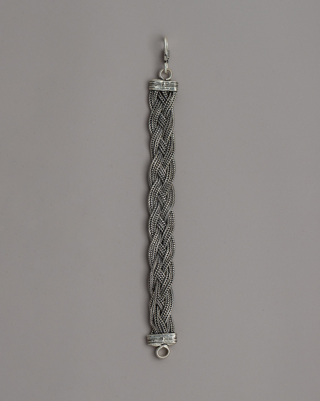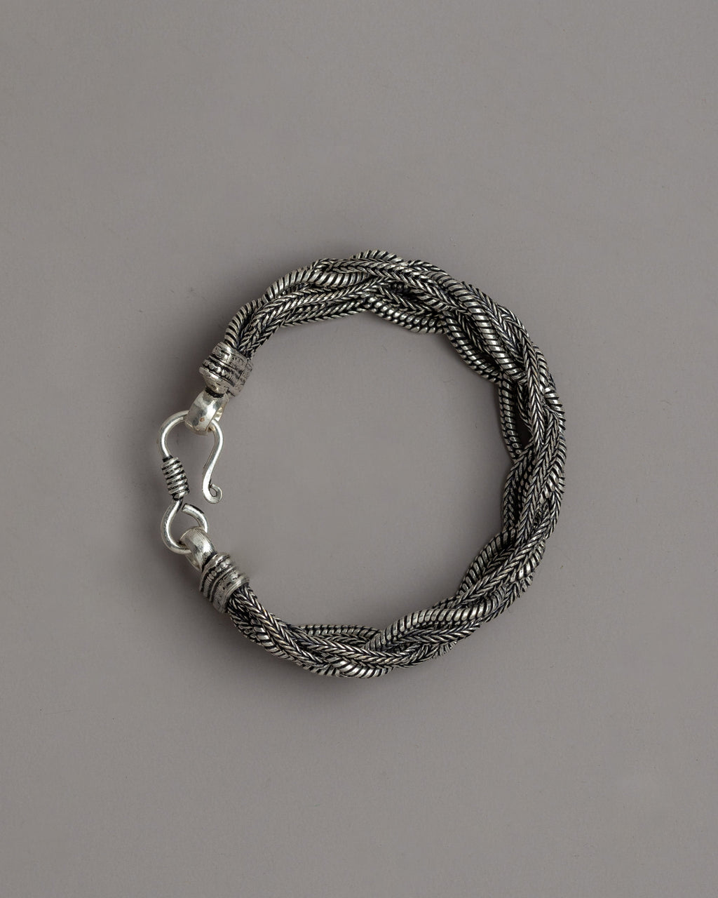 The beautiful braided design on this handcrafted White Metal Bracelet represents unity, power, and interconnectedness. The triple-layer weave adds depth and texture, resulting in a visually appealing appearance. This braided bracelet is more than an accessory; it's a statement item that combines traditional artistry and contemporary beauty. This artisanal bracelet is suitable for both men and women and can be worn casually, on formal occasions, or as a thoughtful present.