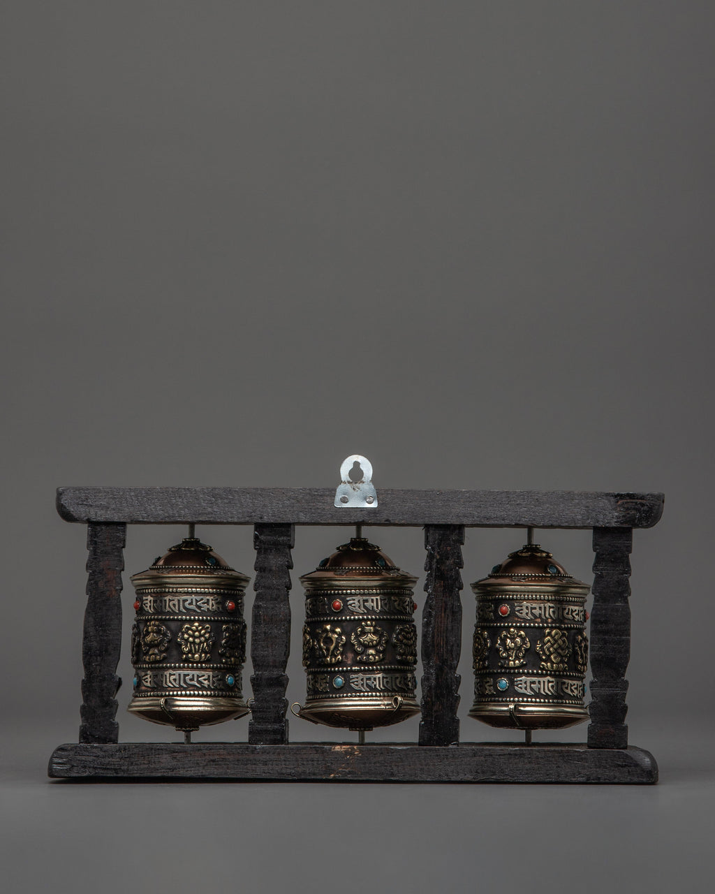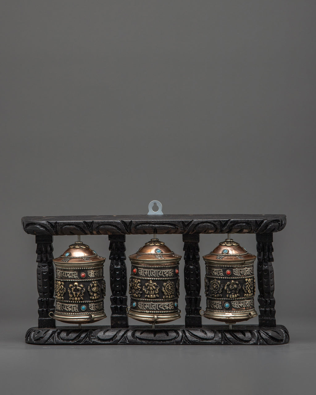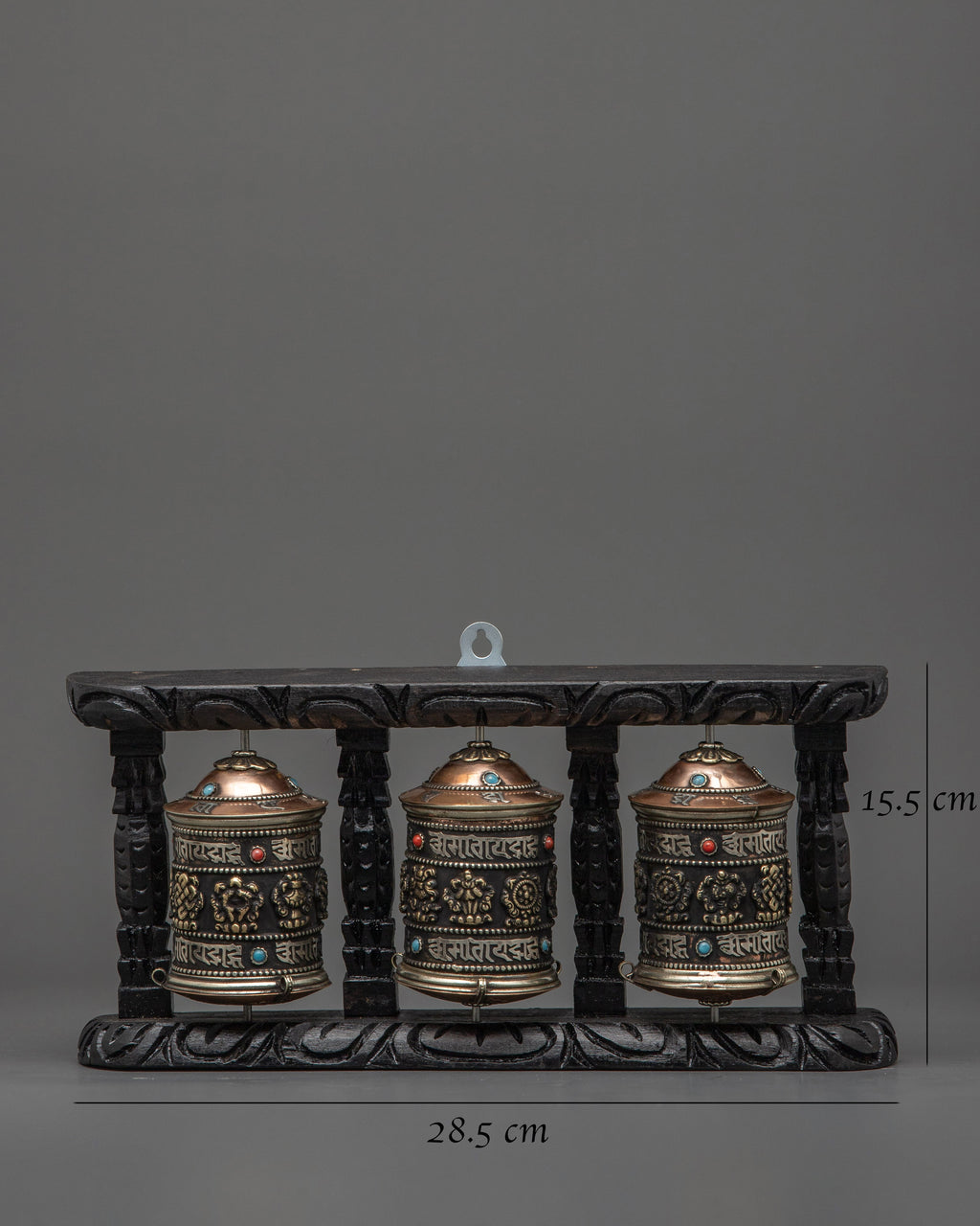 Triple Mantra Prayer Wheel Set | Buddhist Mantra Spinners in Wood Frame
