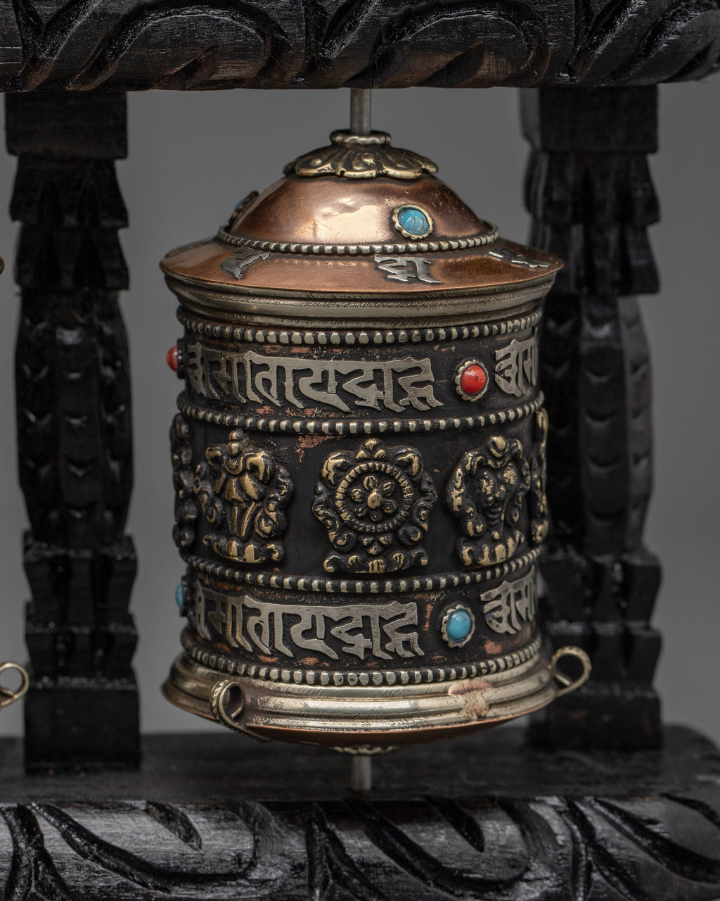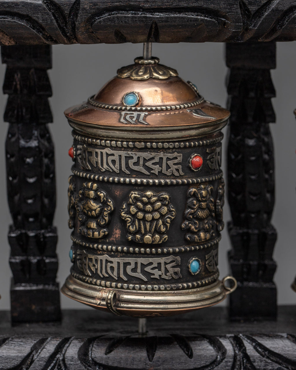 Each wheel has been engraved with the potent mantra "Om Mani Padme Hum," which is thought to evoke compassion and knowledge. Spinning these wheels represents repeating the phrase, offering blessings, and removing negative energy. The addition of artificial turquoise and coral stones adds visual depth while respecting traditional Tibetan creativity. The mix of metals and wood emits power and warmth, expressing the balance between the spiritual and material worlds.
