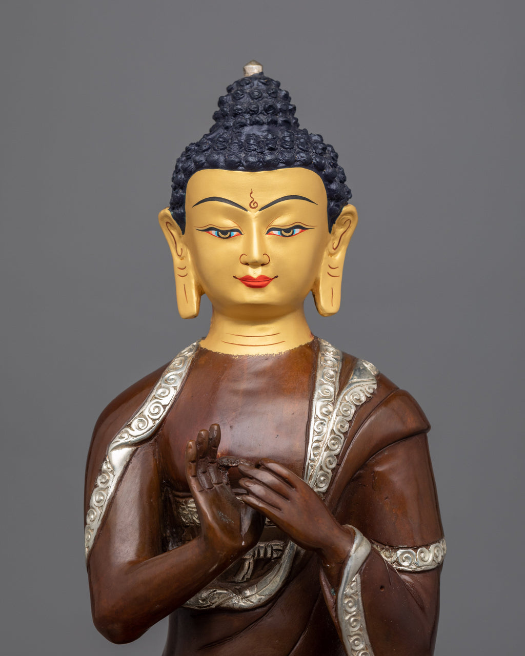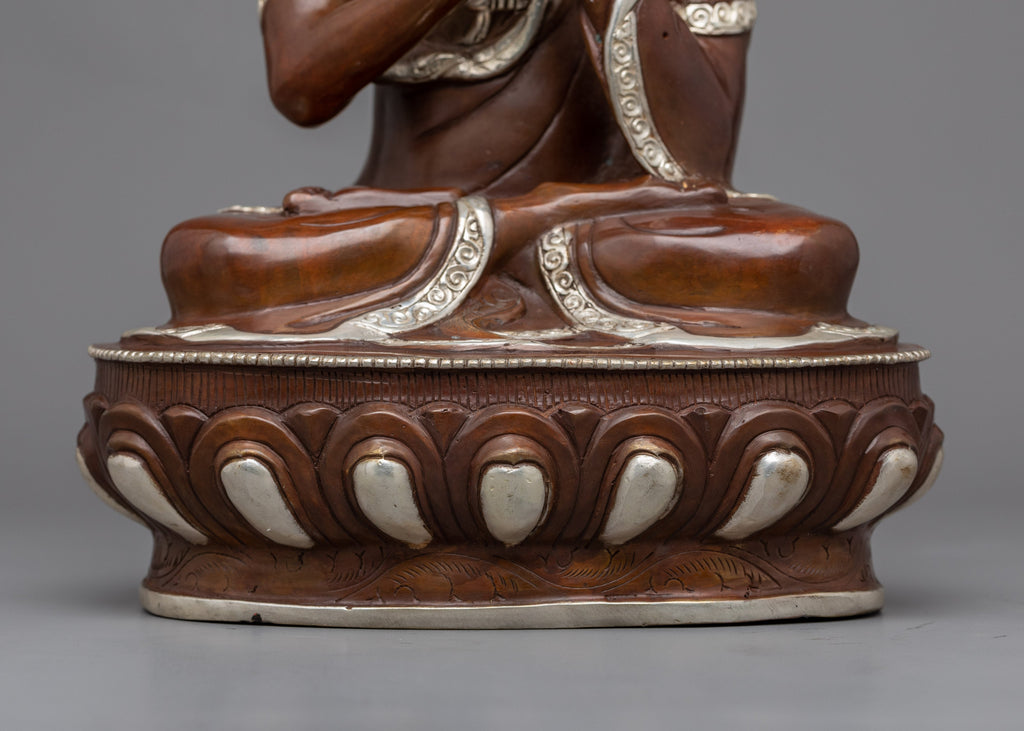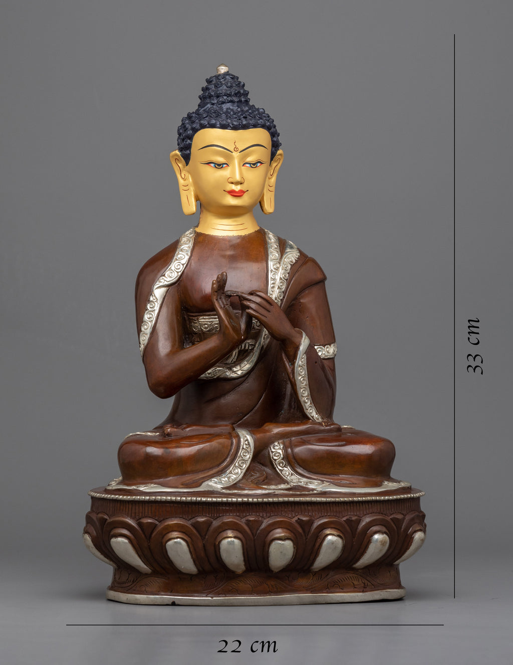 We have masterfully hand-carved the Vairocana Buddha statue in the traditional Himalayan style. The figure was hand-carved of oxidized copper and partially gilded with silver and gold. In the statue, the primordial Buddha is depicted sitting on a moon disc lotus seat, symbolizing purity and enlightenment. The Buddha performs the 'Dharmachakra mudra' with his two hands representing the teachings of the Buddha and the path to enlightenment. The statue is full of intricate patterns and motifs that our artists carved out over the course of several months and is beautifully painted with acrylic colors, enhancing its beauty.