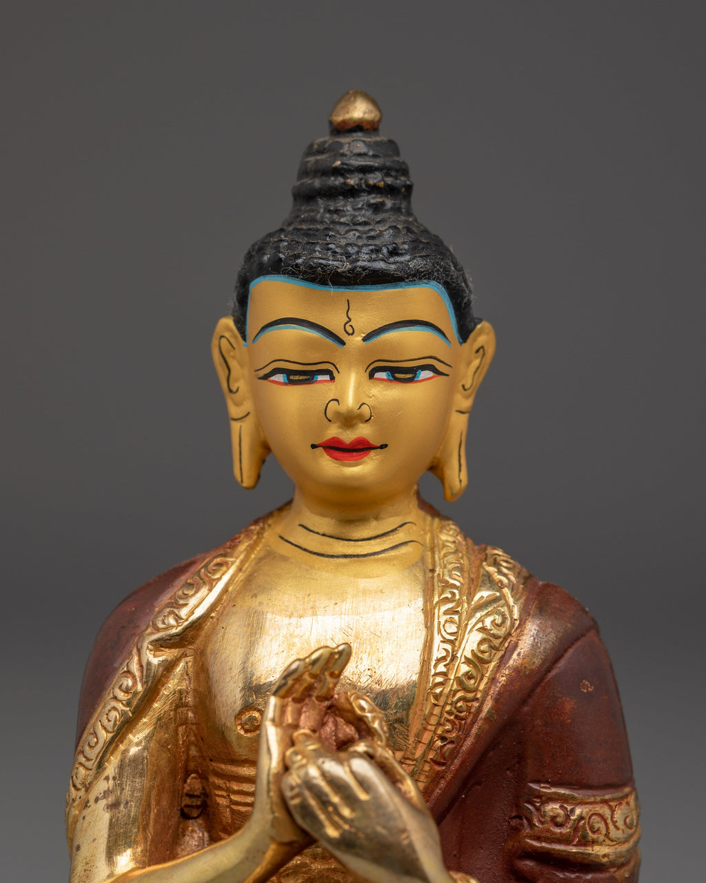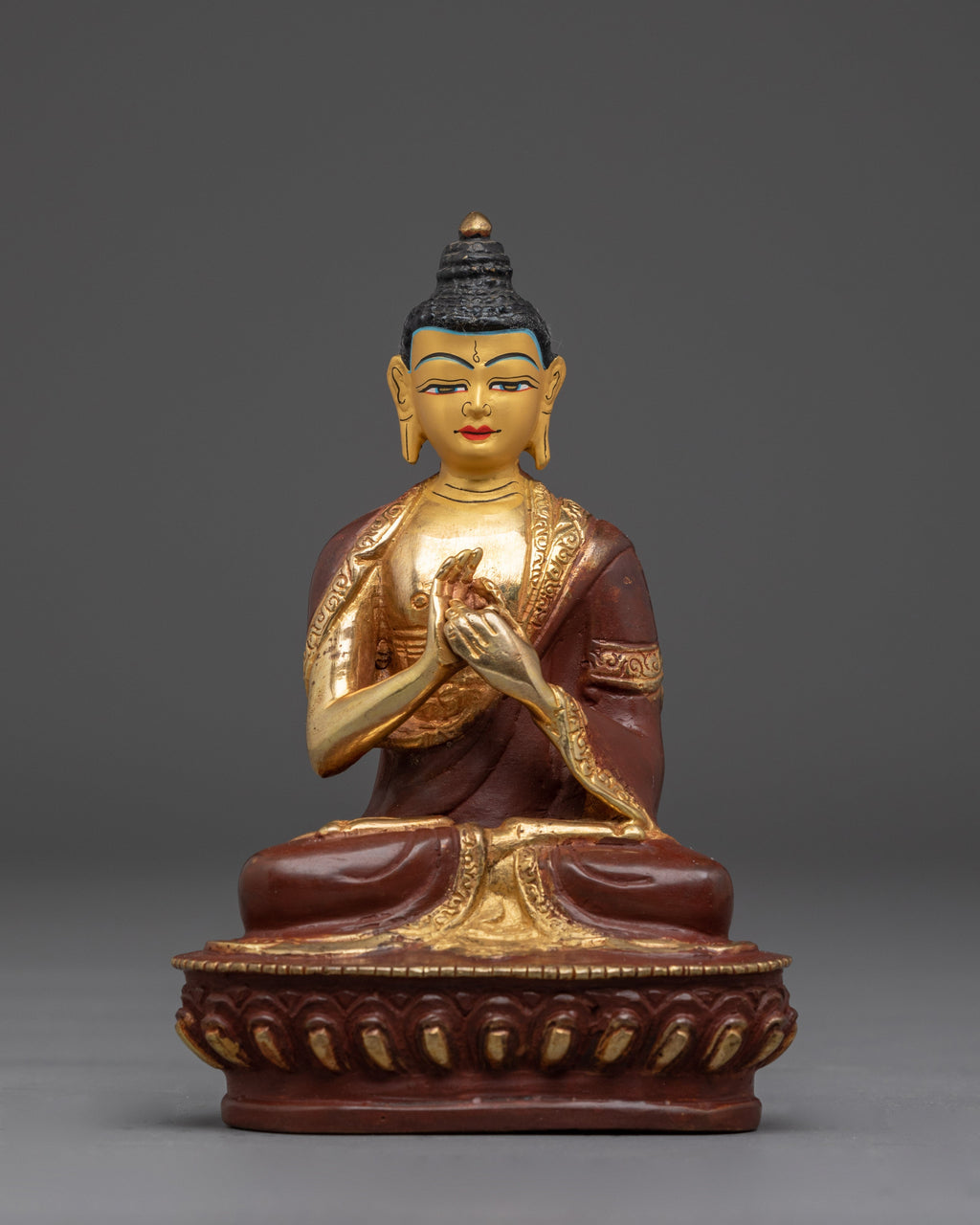 The Vairocana Statue, a symbol of the Enlightened Mind, measures 5.9”/15cm in height and 4.1”/10.5cm across the base, weighing 0.63 kg. Crafted from a copper body, it is adorned with 24K gold gilding along with gold and acrylic paintings, capturing the serene presence of the Dharmakaya Buddha with fine traditional detail.