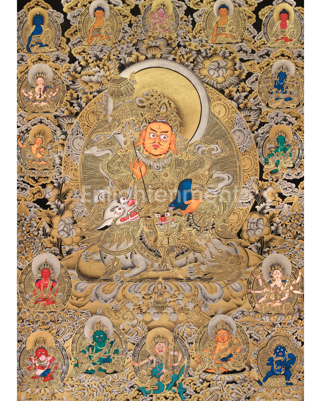 Witness the majestic might of Vaishravana, the Guardian of the North, in this exclusive Thangka skillfully rendered in gold on a black canvas. This stunning piece measures 21" wide by 30" high, creating a commanding presence that transforms any space into a realm of divine protection and abundance. Every inch of this Thangka is embellished with intricate gold details, capturing the celestial splendor of Vaishravana’s armor and the swirling motifs of the surrounding deities. The dramatic black background enhances the brilliance of the gold accents, infusing the artwork with an ethereal radiance.