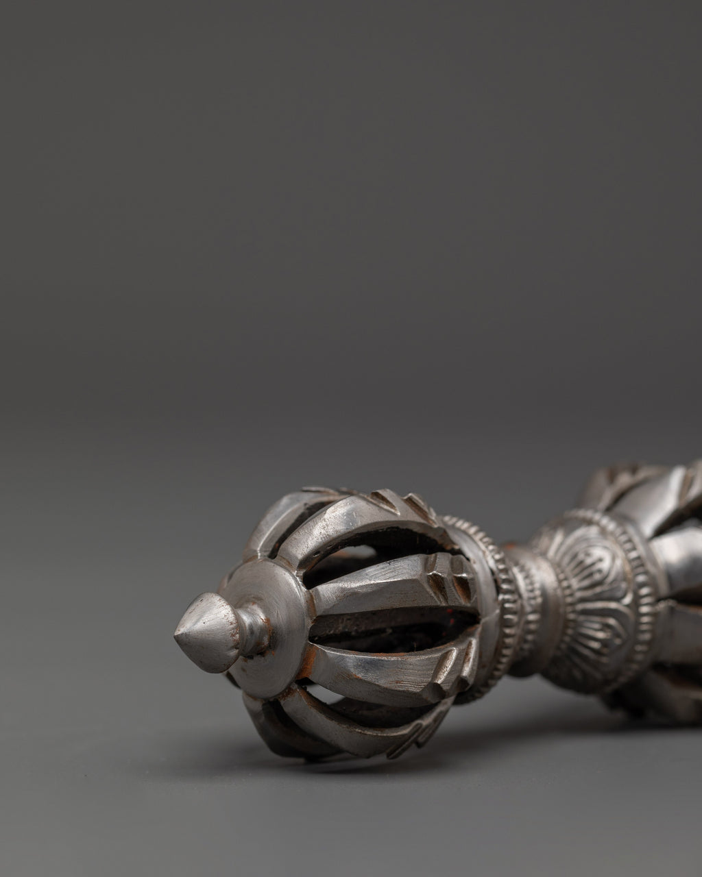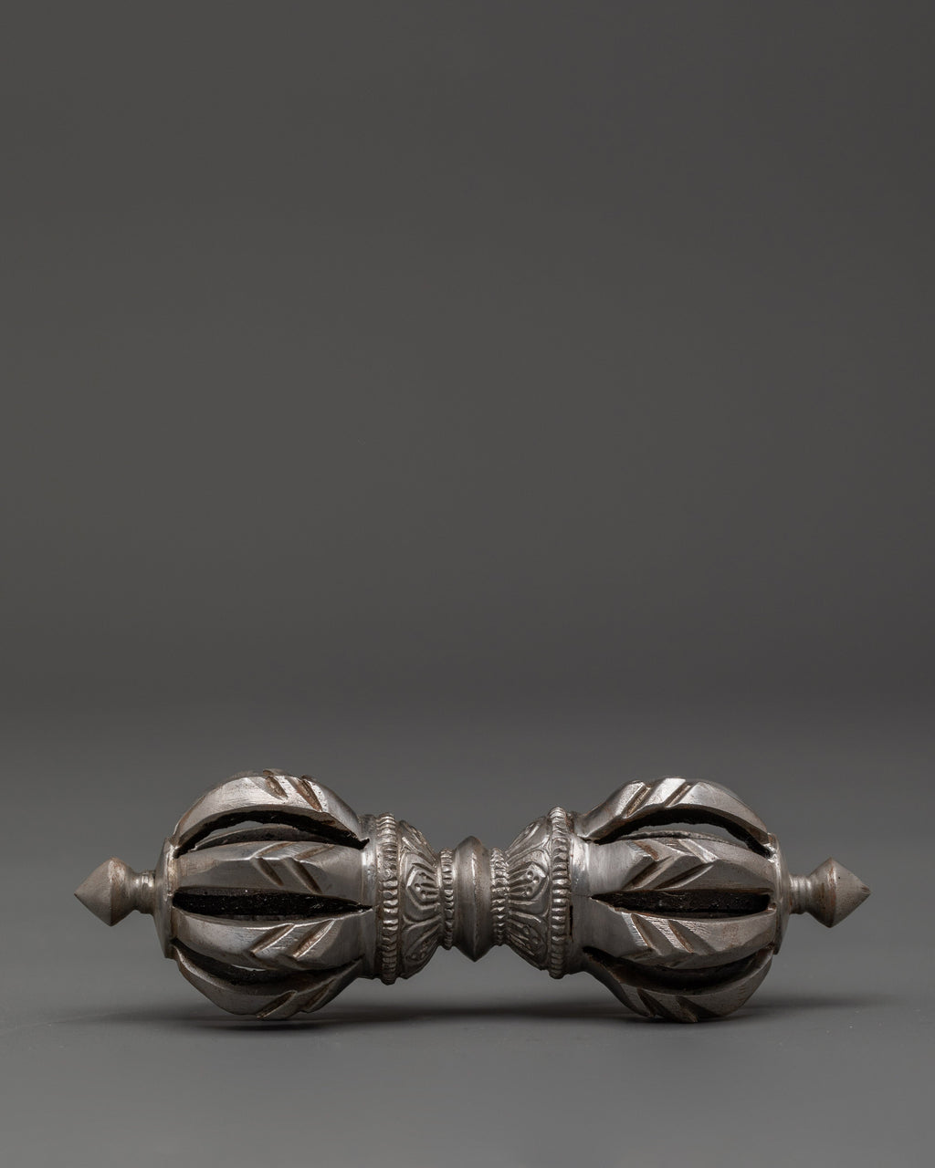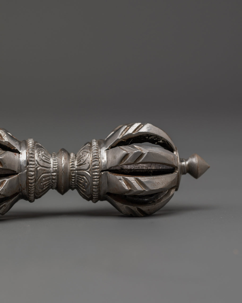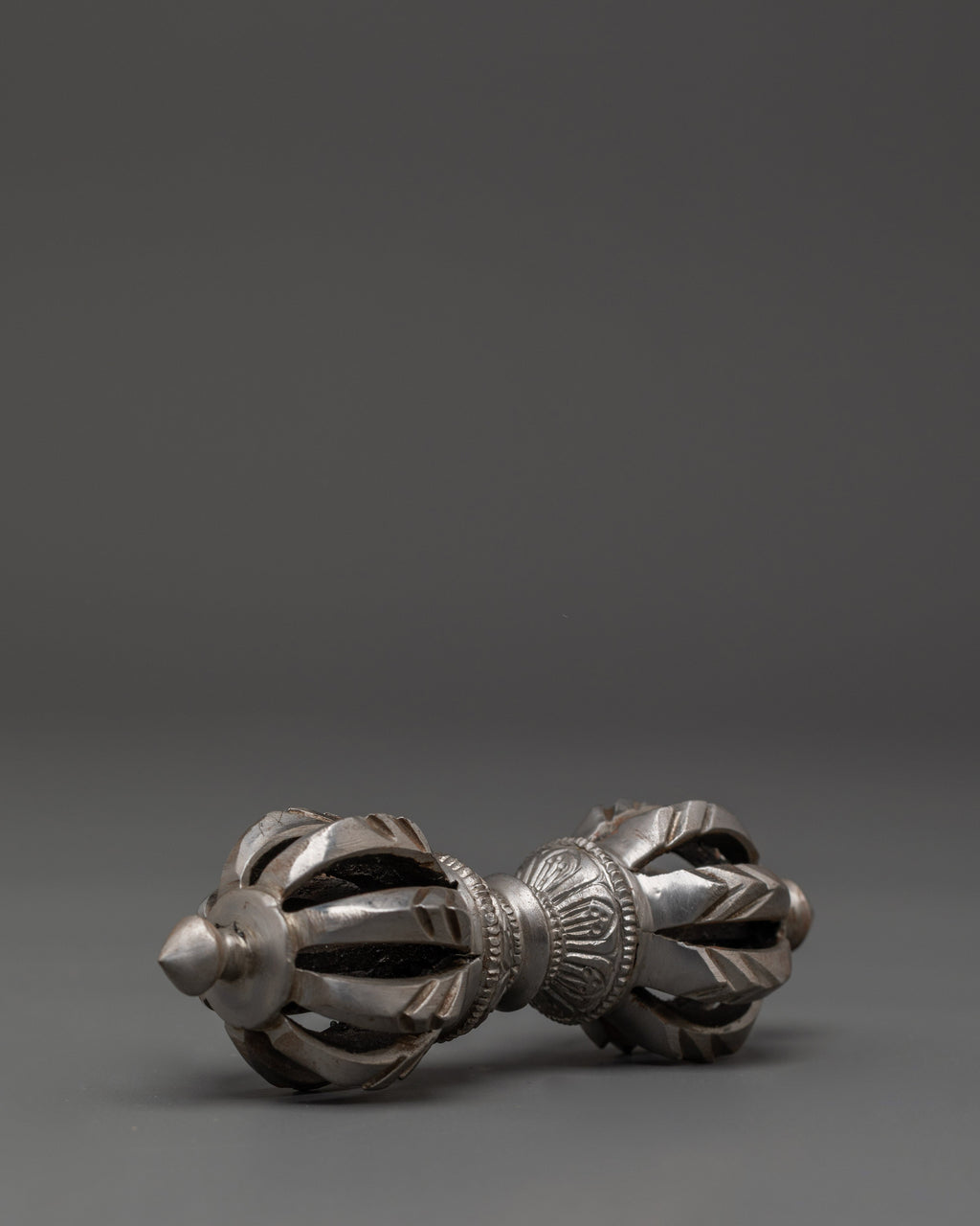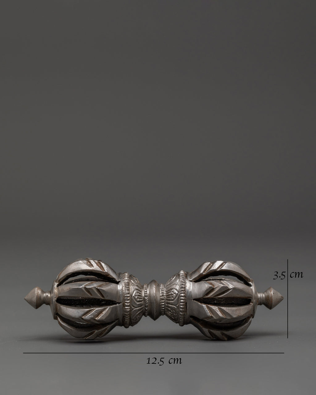 The design of the Vajra is deeply symbolic, with its multiple spokes representing the union of wisdom and compassion. The form of the Vajra is intended to cut through ignorance and attachment, embodying the strength and clarity of the Buddha's teachings. In Tibetan Buddhism, the Vajra is considered an essential ritual object, often used in ceremonies to purify energy, remove obstacles, and invoke spiritual blessings. Its iron body signifies strength and resilience, making it the perfect tool for grounding spiritual practice and enhancing inner power.