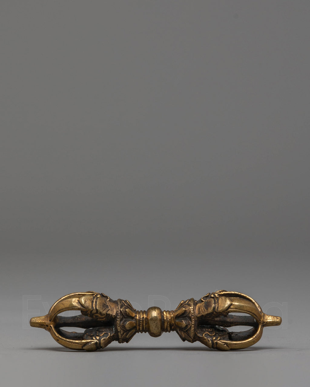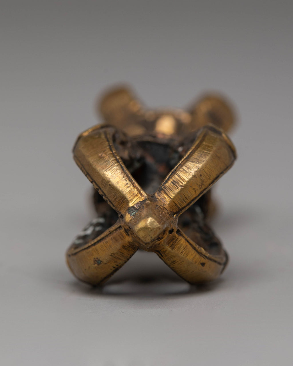 This Vajra features a double-sided, five-pronged design, symbolizing the unbreakable nature of enlightened wisdom and the power to cut through ignorance. Each set of five prongs represents the Five Wisdoms and the transformation of the five mental afflictions into awakened qualities. The central sphere unites both ends, signifying the inseparable union of wisdom and method—an essential principle in Vajrayana practice.