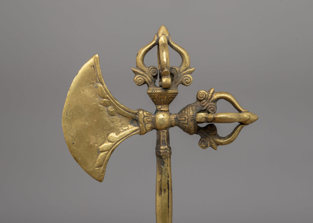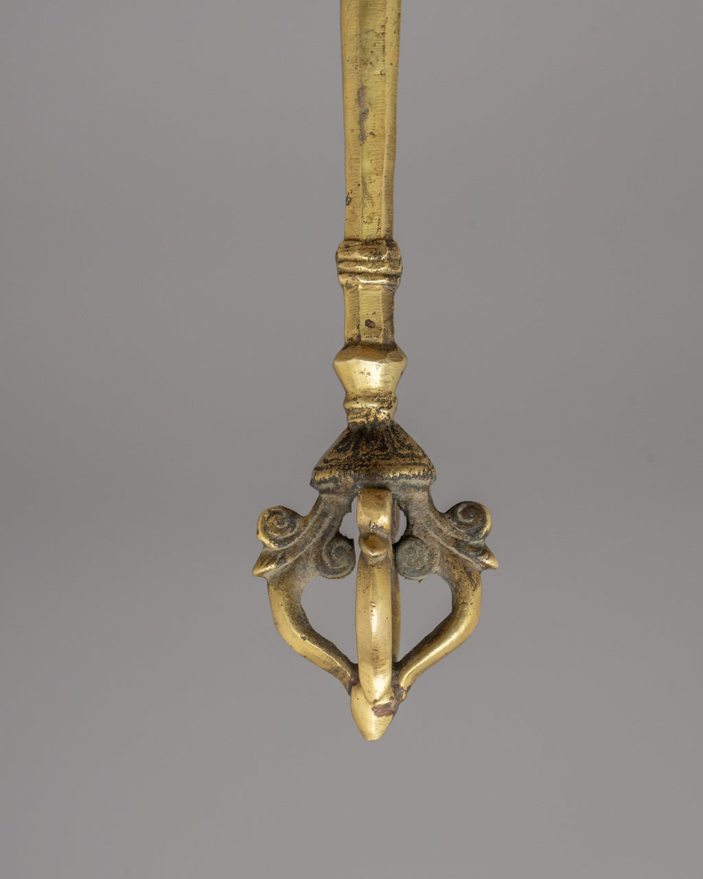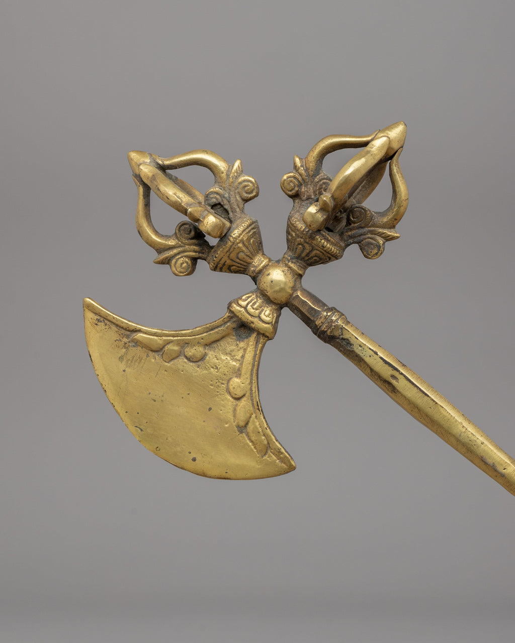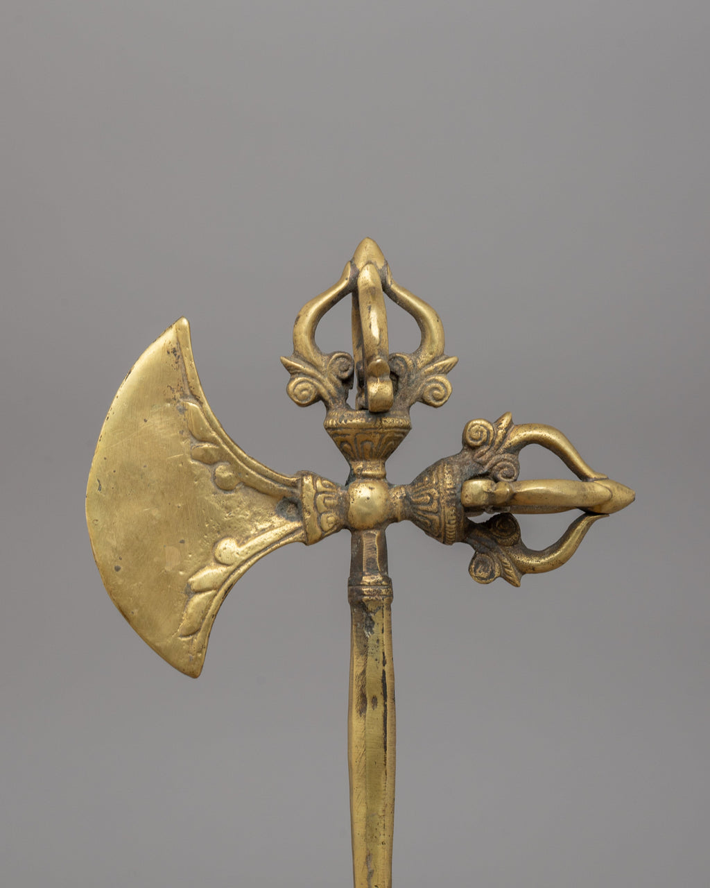 The elaborate design of the Vajra Kartika Danda incorporates a variety of symbolic aspects. The axe blade represents the removal of delusion and worldly attachments, while the Vajra (thunderbolt) at its base represents unwavering wisdom and spiritual strength. The elaborate handle is intended to be balanced, representing the Buddhist teachings' emphasis on the harmony of strength and compassion. This sacred item is ideal for meditation, rituals, or as an altar centerpiece since it boosts your space's spiritual energy while also serving as a powerful tool for contemplation and growth. The brass craftsmanship provides longevity and timeless beauty, making it an excellent addition to any practitioner's collection.