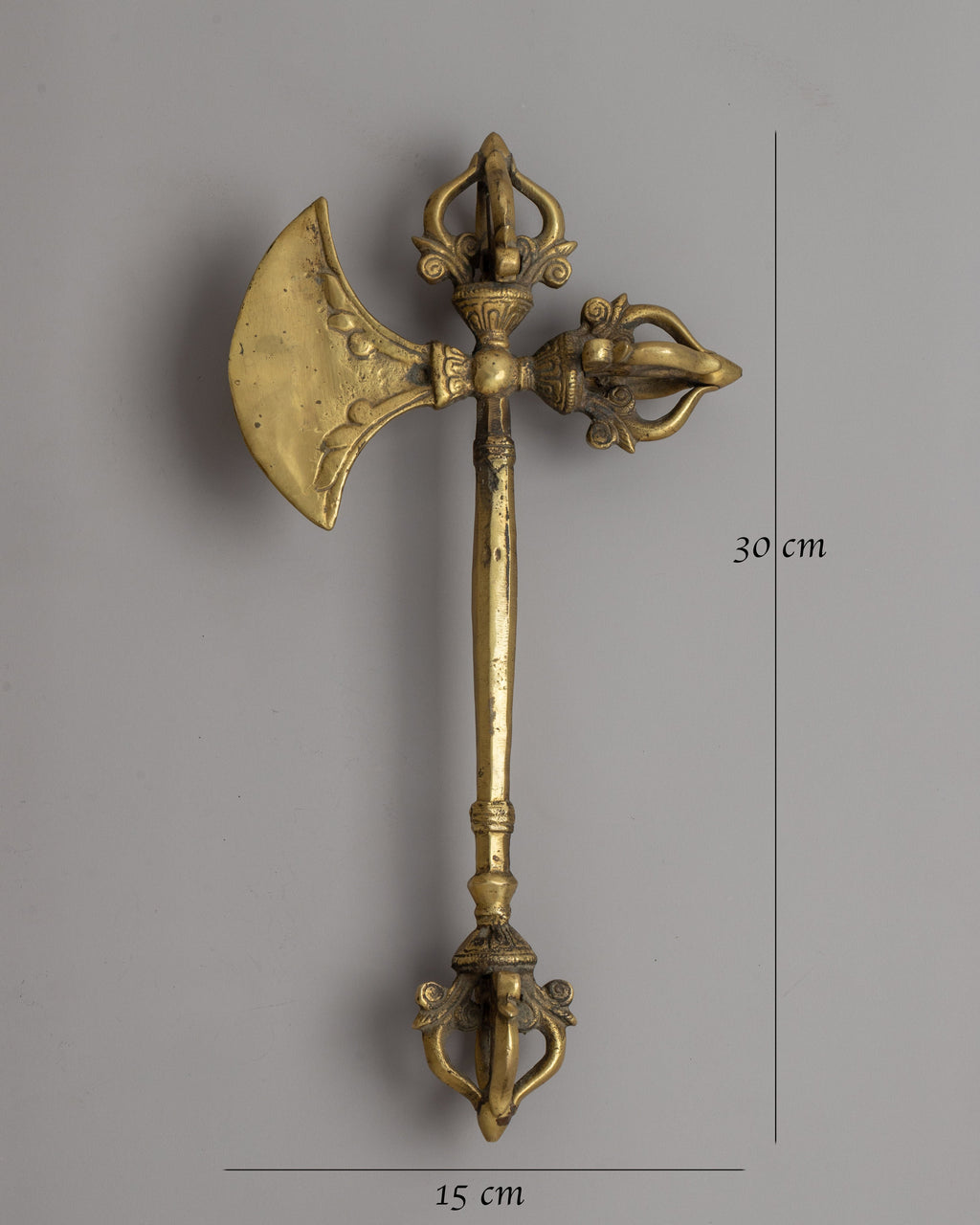 The Vajra Kartika Danda is made of brass and is 30cm in height and 15cm in width, weighing 0.59kg. It is a powerful yet elegant ceremonial relic. In Buddhist practice, this precious instrument is known as the "Ritual Axe" and represents the spiritual principles of cutting through ignorance and attachments. It has traditionally been utilized in Tantric ceremonies to represent wisdom's clarity and the force of enlightenment. This wonderfully created Vajra Kartika Danda, displayed in the heart of your Buddhist shrine, serves as a reminder of the spiritual journey to freedom and self-realization.