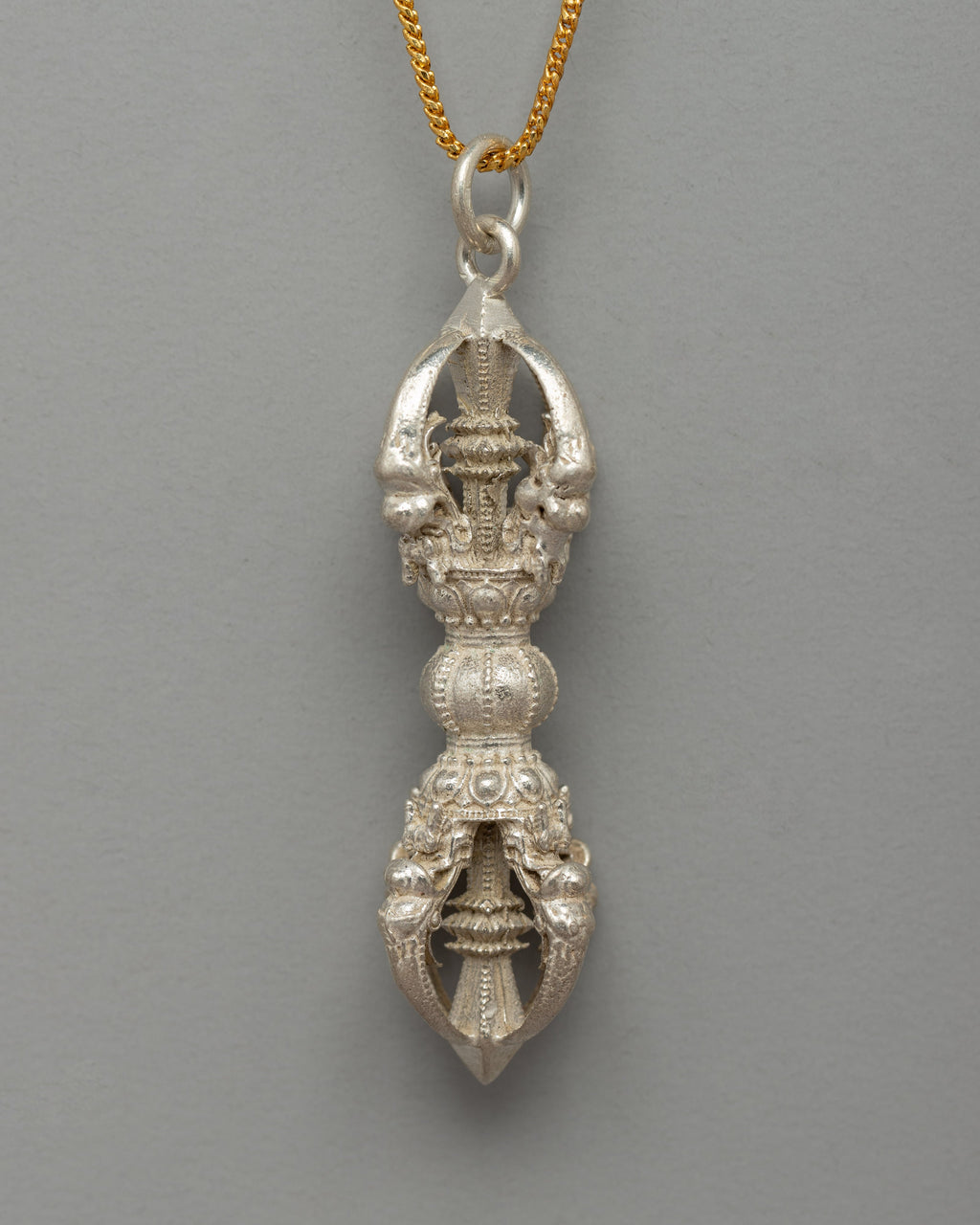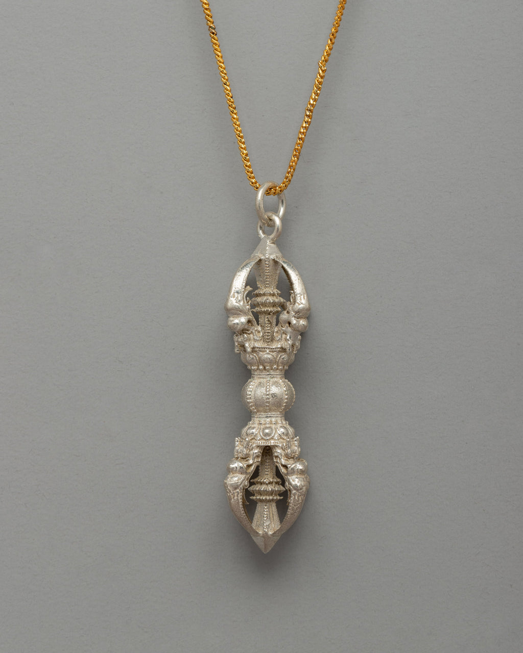 The vajra locket's design is detailed with fine engravings and delicate patterns, emphasizing its spiritual significance. The carvings are precisely crafted, especially around the Vajra's central section, which represents the essence of wisdom and compassion. The Vajra Locket's overall shape and design symbolize the wearer's dedication to enlightenment and spiritual strength.