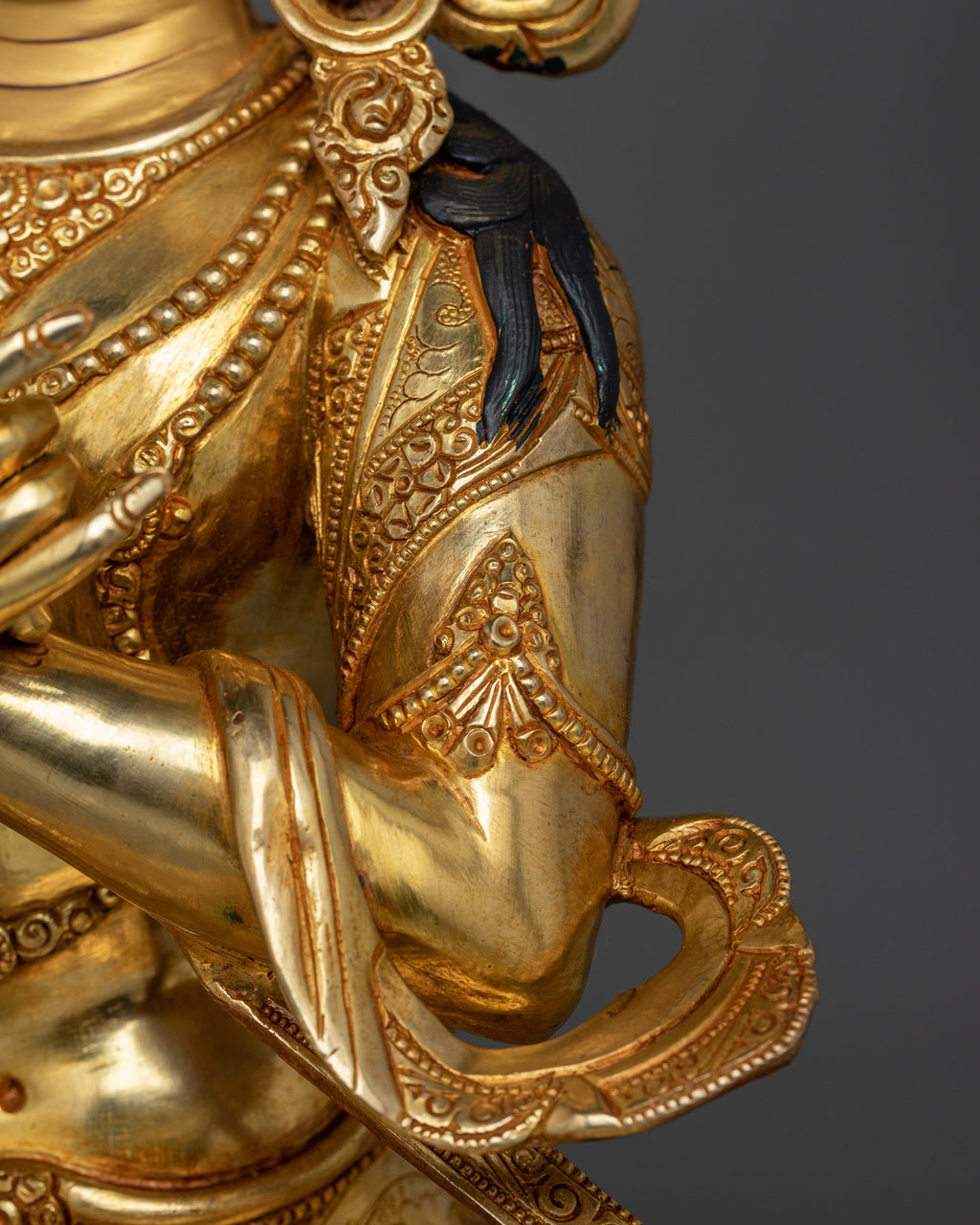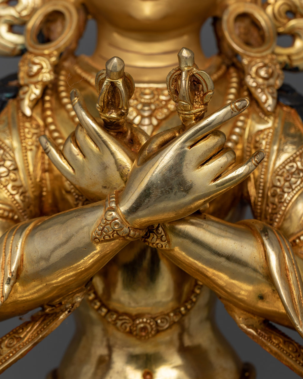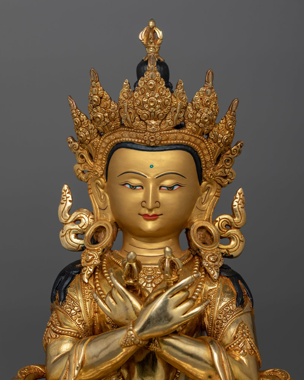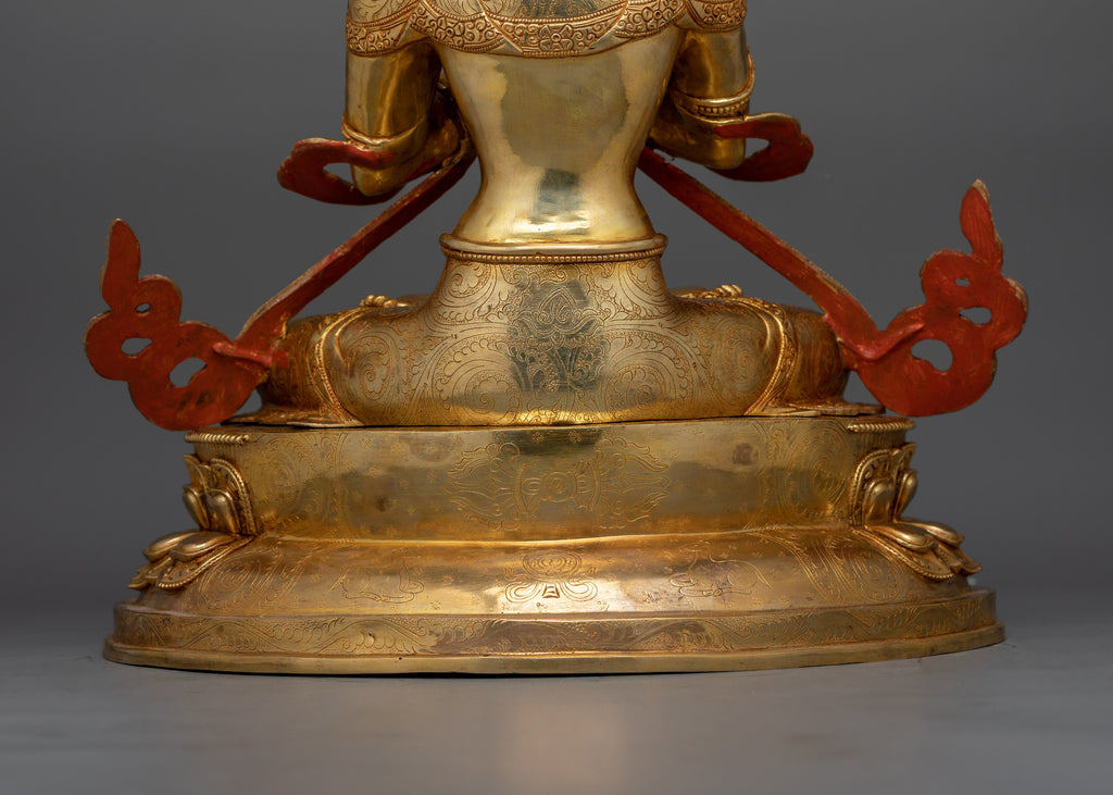 This Vajradhara "The Primordial Buddha" statue, which stands 18.3 inches tall and 14.6 inches wide, represents the wellspring of all Tantric teachings. It weighs 8.90 kg and is made of copper. It is delicately gilded with 24K gold and enriched with gold and acrylic paints. Vajradhara is in his classic form, representing the ultimate combination of wisdom and compassion, the two requirements for enlightenment in Vajrayana Buddhism.