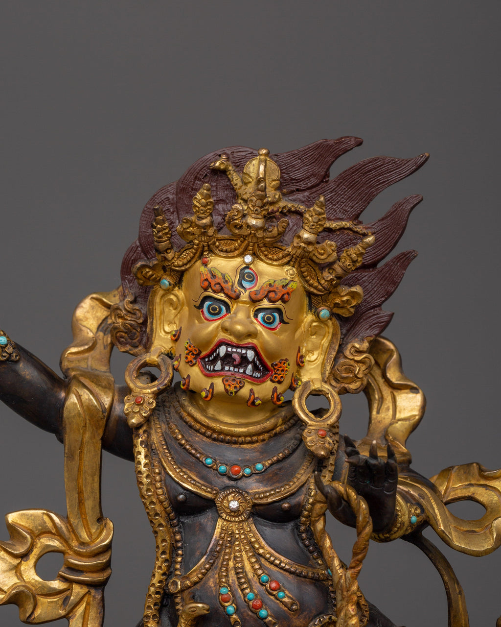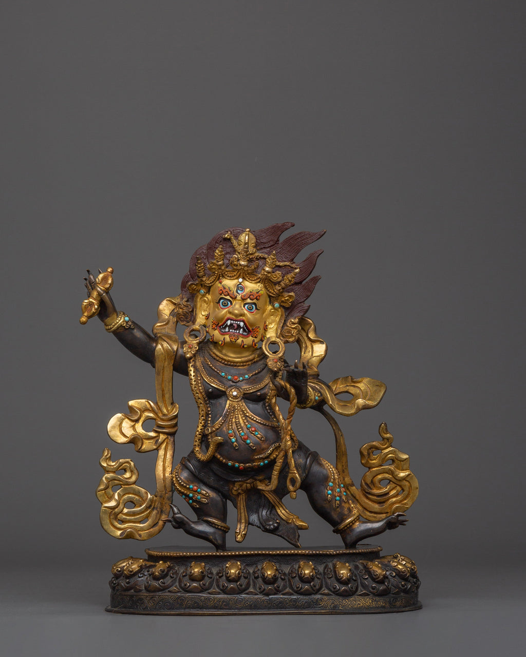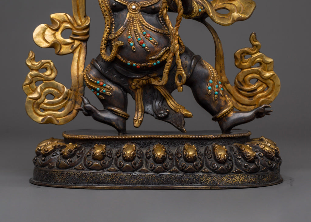 Vajrapani is revered as the embodiment of the Buddha's power and teachings. In his iconography, he holds a vajra in his right hand, symbolizing indestructible strength and the unbreakable nature of enlightened wisdom. In his left hand, he holds a lasso, representing his ability to bind and subdue negative forces. Vajrapani stands in the dynamic alidhasana posture, a powerful warrior stance that signifies readiness to protect and overcome obstacles. A halo of flames surrounds him, symbolizing the burning away of ignorance and the transformative energy of wisdom. A third eye of wisdom adorns his forehead, representing his ability to see the true nature of reality beyond ordinary perception. His fierce expression and the snake garland around his neck embody his fearless nature and mastery over poisonous emotions. Additionally, Vajrapani wears a crown of five skulls, representing the transformation of the five negative afflictions into the five wisdoms of enlightenment.