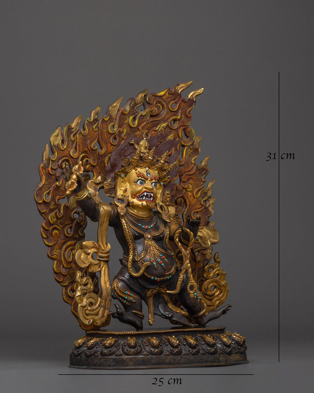 This statue of Vajrapani, also known as Chana Dorje, has a size of 12.2”/31cm in height and 9.8”/25cm in base width, weighing 3.76 kg. It is crafted from gold and acrylic paintings, gemstones, mercury gold plate, and oxidized copper body. Designed by talented Nepalese artisans, this detailed sculpture is ideal for altars, meditation areas, or as a meaningful decor item for individuals seeking strength and protection in their spiritual practice.