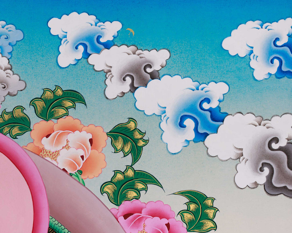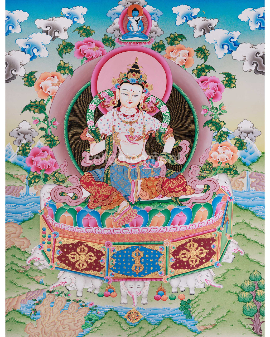 Vajrasattva holds a central place in Vajrayana Buddhism as the Buddha of purification, associated with cleansing negative karma, restoring vows, and revealing innate clarity. In this thangka, he is depicted seated serenely on an ornate lotus throne, holding the vajra and bell, symbols of the inseparable union of wisdom and compassion. Above him appears Samantabhadra, the primordial Buddha, emphasizing Vajrasattva’s source in original enlightenment and timeless awareness. The harmonious landscape, floral motifs, and balanced composition reinforce the painting's sacred meaning and traditional iconography. This thangka is an ideal addition to a meditation space or personal shrine—invite its purifying presence into your life and deepen your spiritual journey today.