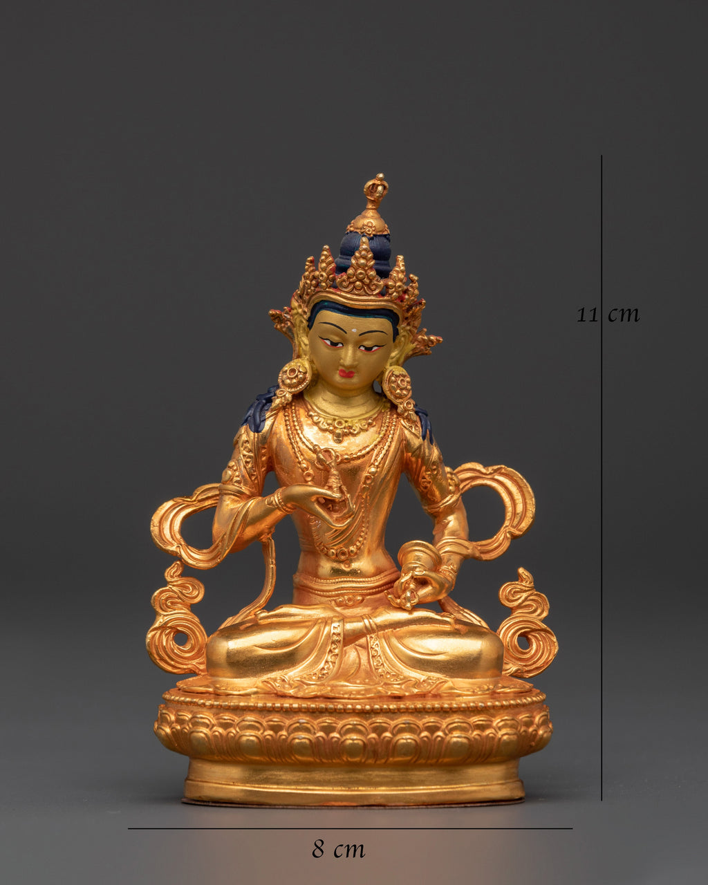This skillfully carved Vajrasattva Copper Sculpture depicts the deity of purification in Tibetan Buddhism. Made of gold-plated copper, the statue is 11cm by 8cm and weighs 0.21kg, making it ideal for altars, personal shrines, or meditation nooks. Vajrasattva carries a vajra and a bell, representing the unification of wisdom and compassion.