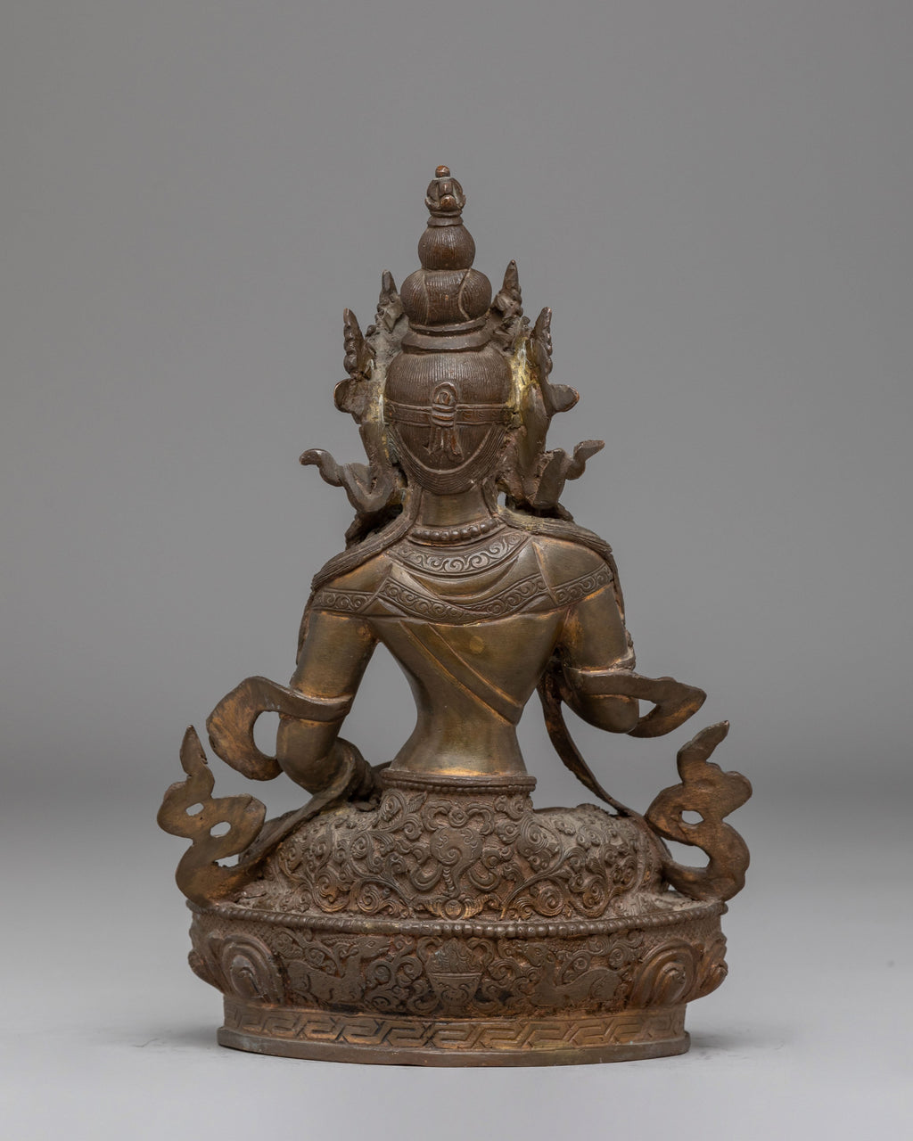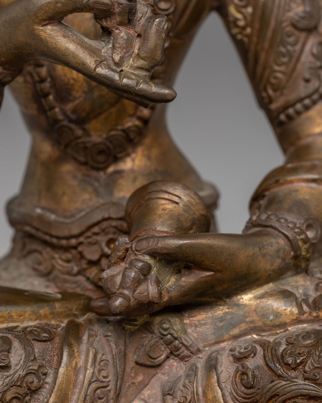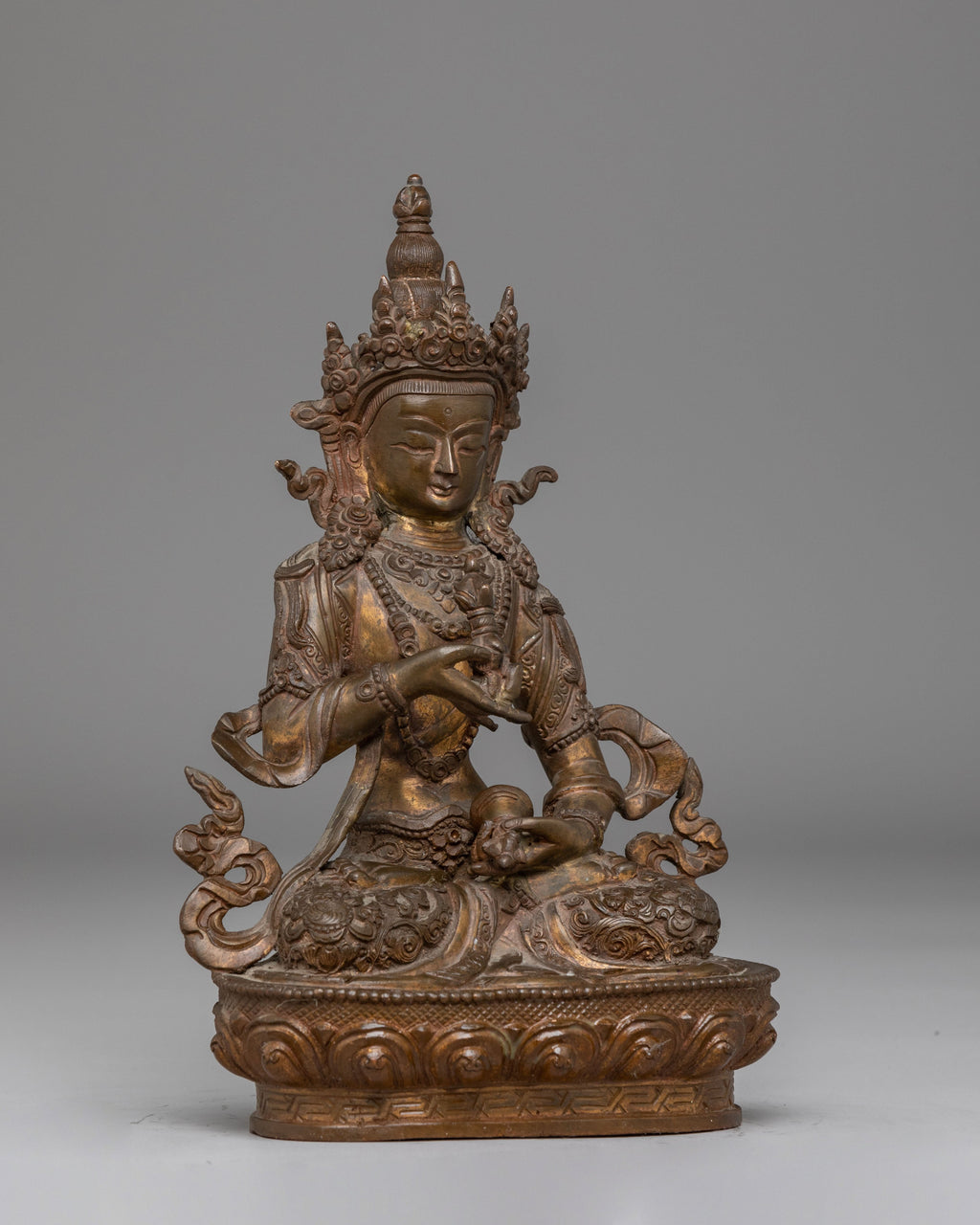Intricate motifs can be seen throughout the statue, from the finely engraved robes to the meticulously shaped lotus seat and ornamental crown. Vajrasattva is depicted holding the vajra close to his heart, symbolizing purity and unshakable clarity, while the bell rests gracefully at his side, representing wisdom and compassionate awareness. The artisan’s craftsmanship offers rich texture, balanced contours, and spiritually meaningful detailing that elevate the statue into a true Himalayan masterpiece.