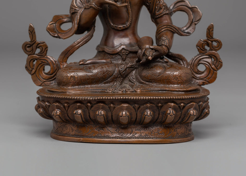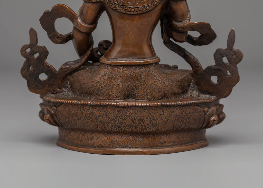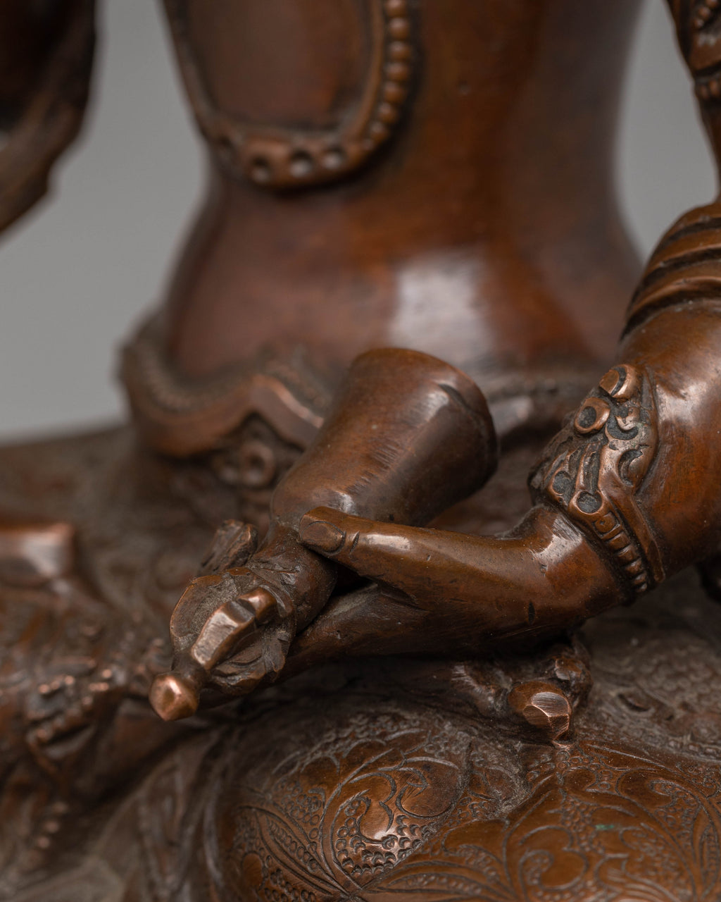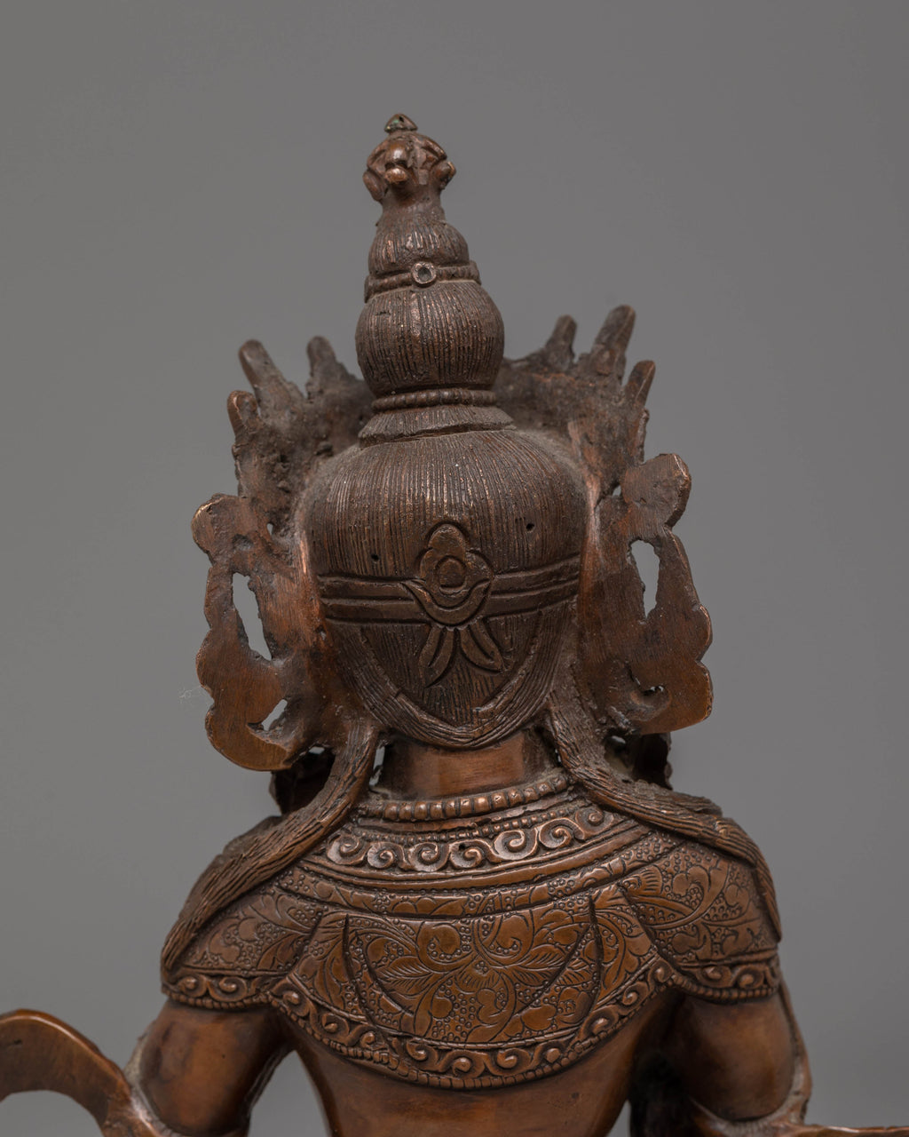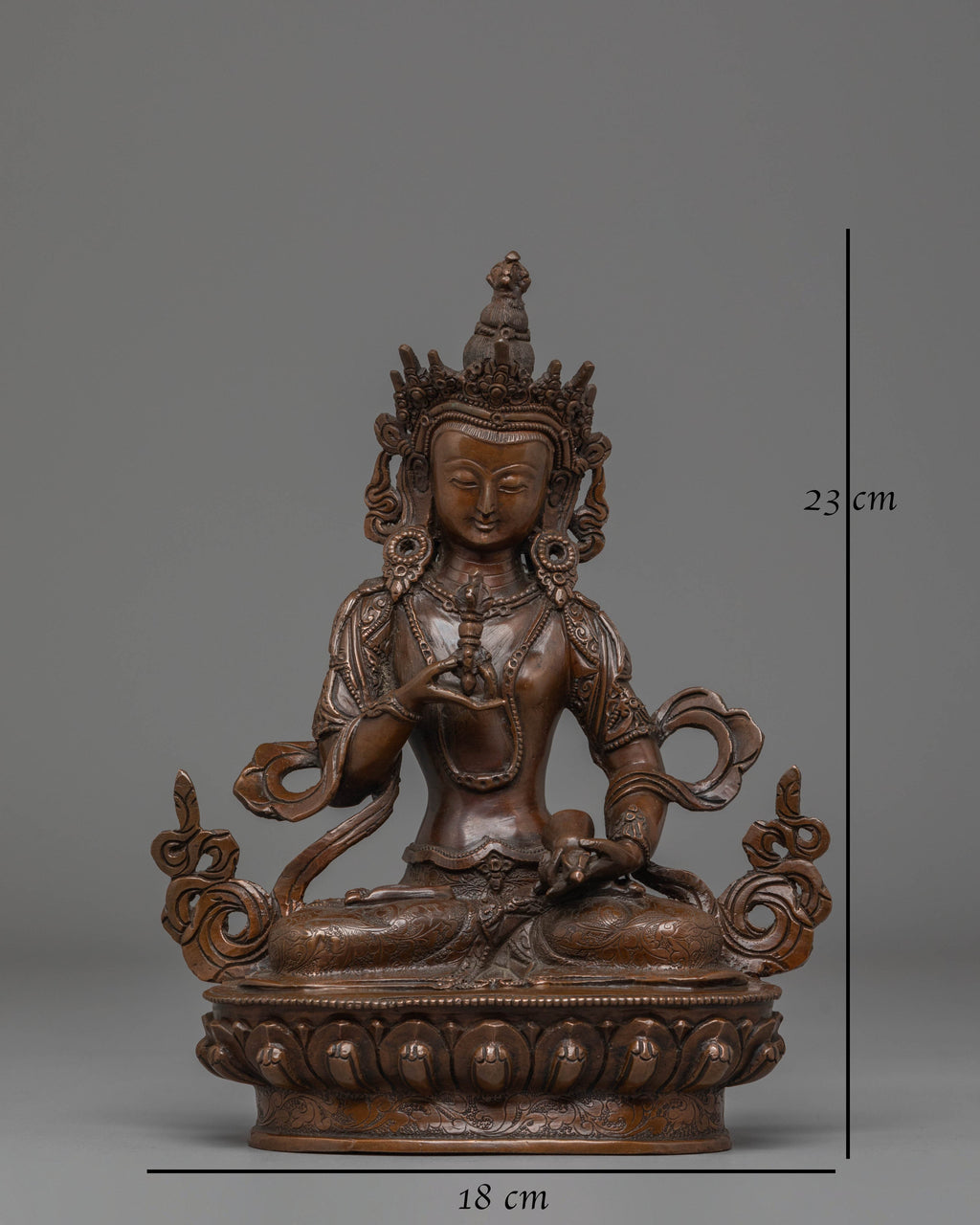 Introducing our Vajrasattva Handmade statue, carved with care in Patan, Nepal, using oxidized copper. This sculpture is a perfect example of Nepalese metalwork, depicting Vajrasattva in a calm, meditative pose that signifies enlightenment and purity. Great artisan talent is showcased through intricate details and a serene expression, and the oxidized finish lends an ageless, spiritual depth.