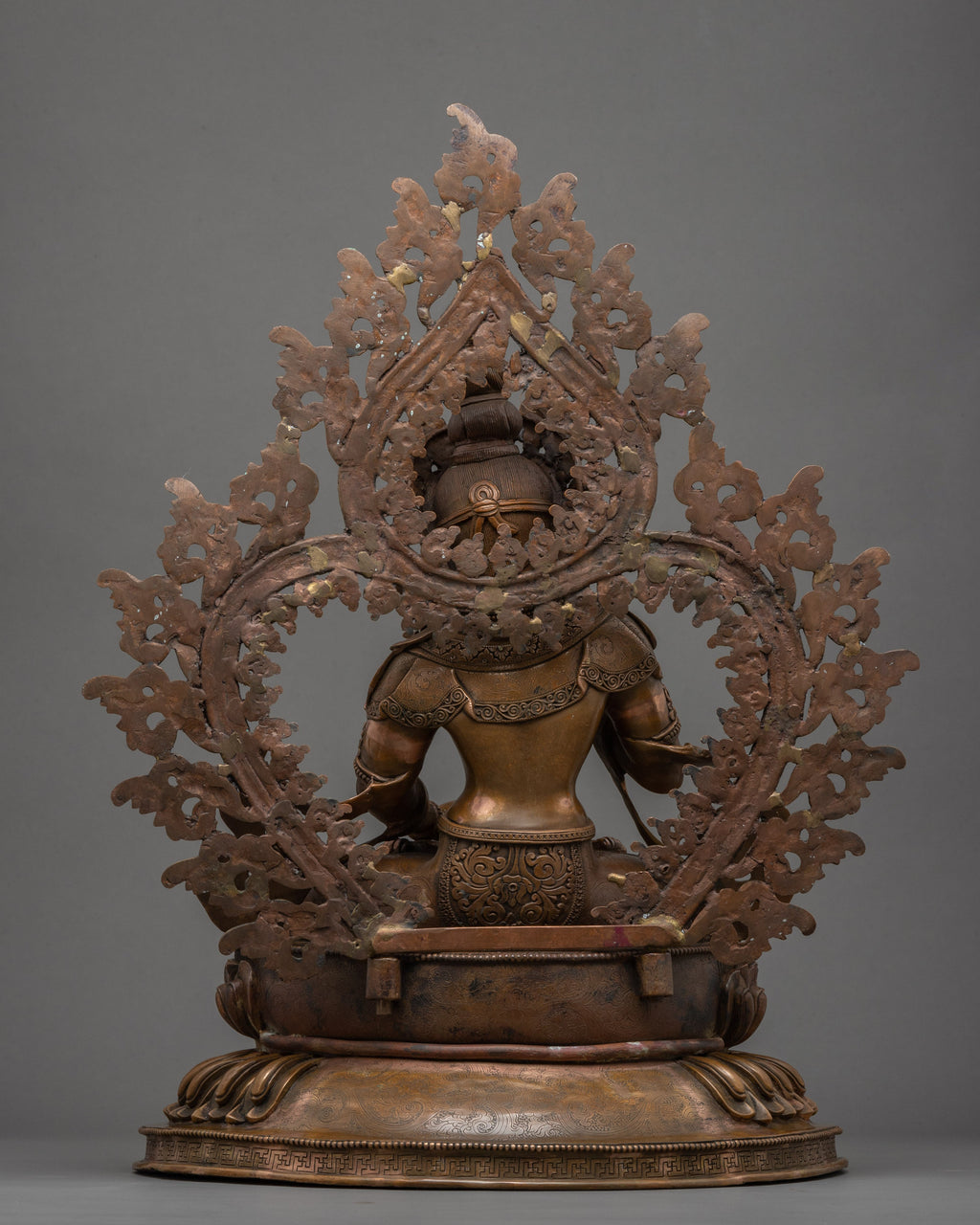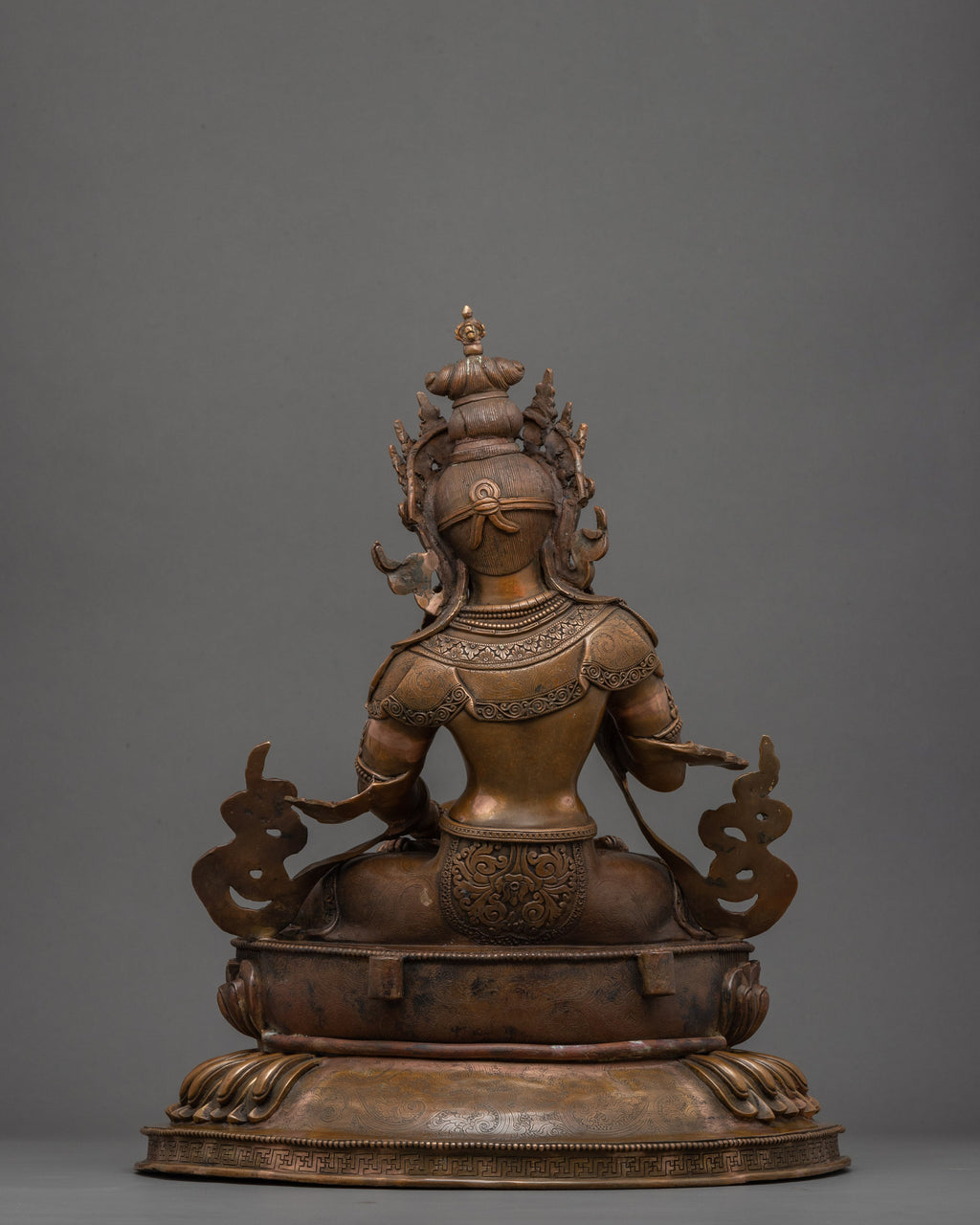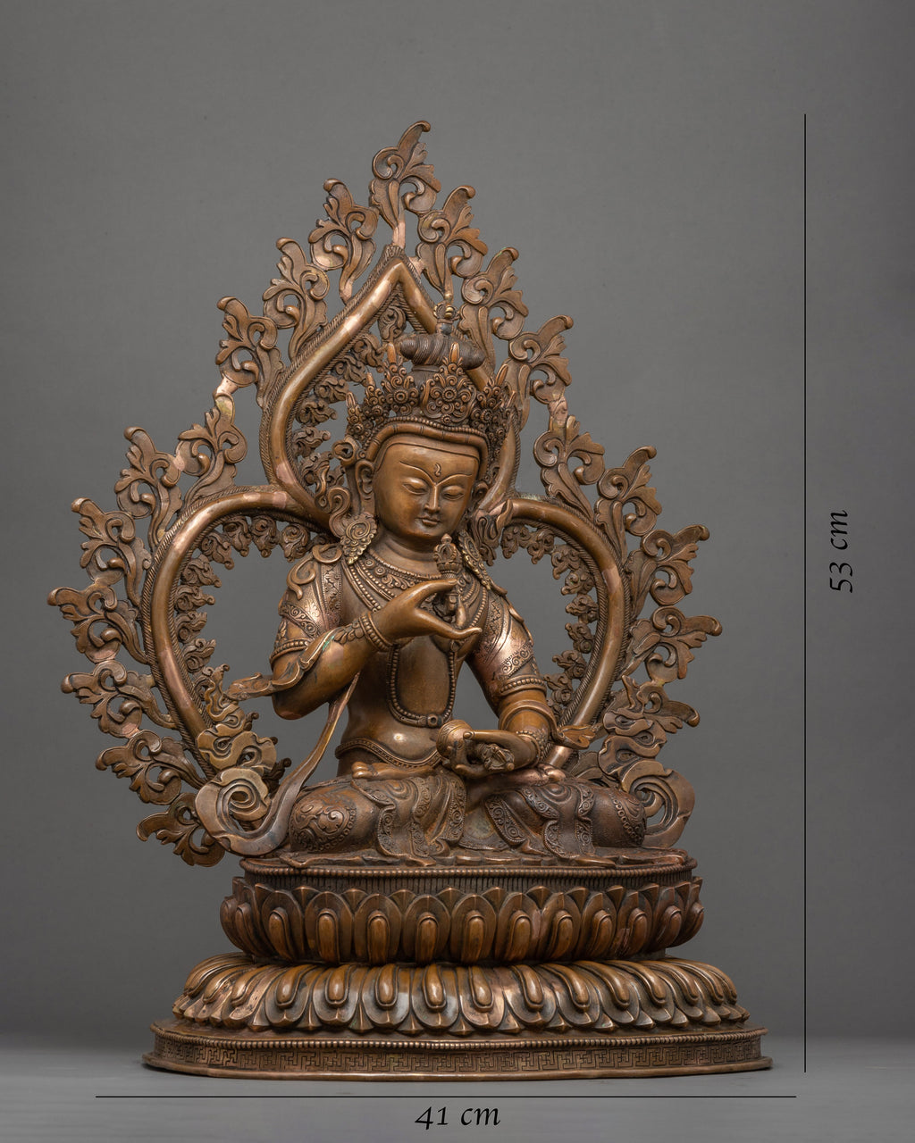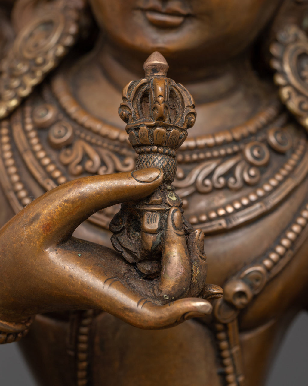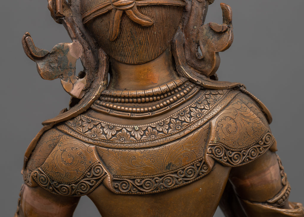 We have exclusively hand-crafted the Vajrasattva Practice Sculpture in traditional Himalayan Art. We have depicted a deity seated on top of a moon disc lotus throne with a calm expression, carrying a vajra in his right hand while a bell in his left hand. The design of the throne, sculpted in a Tibetan manner, and crafted in an oxidized copper body, is magnificently mesmerizing. You can use this art for multiple purposes, like in your regular meditational or yoga activities, in different Vajrayana rituals, and even for home decor. The deity is decorated with multiple body ornaments. All of these are hand-carved using a hammer and chisels. It took us months and months of hard work and devotion to complete the figurine. This statue weighs about 11.88 kg.