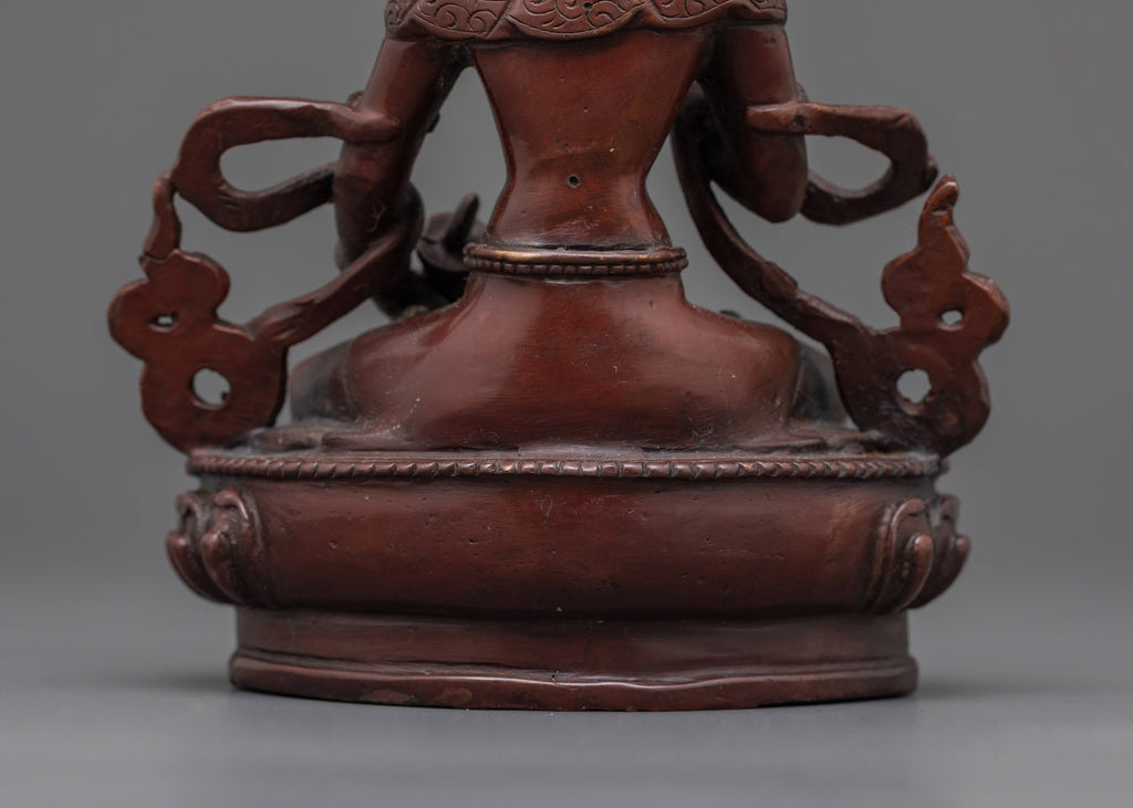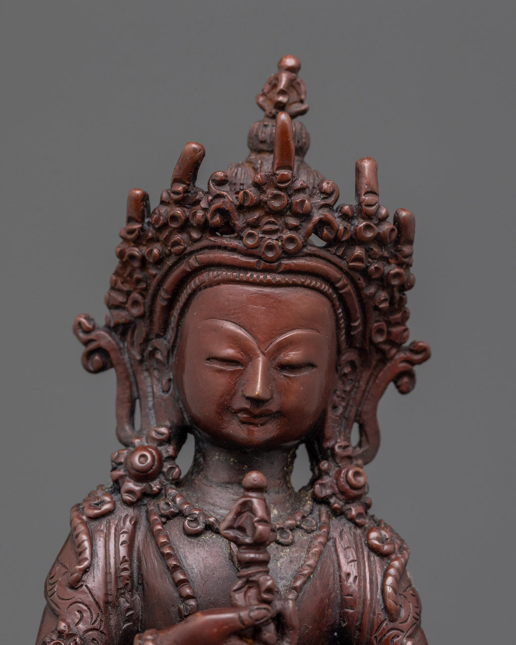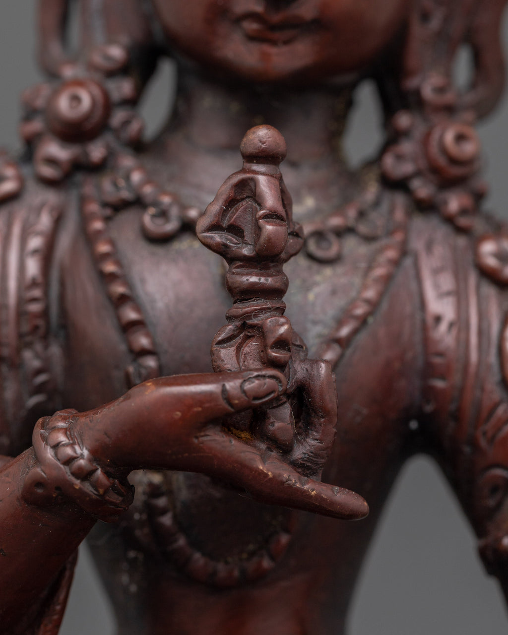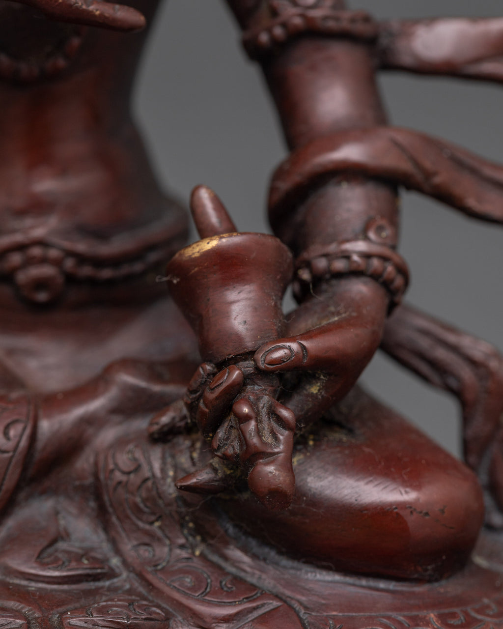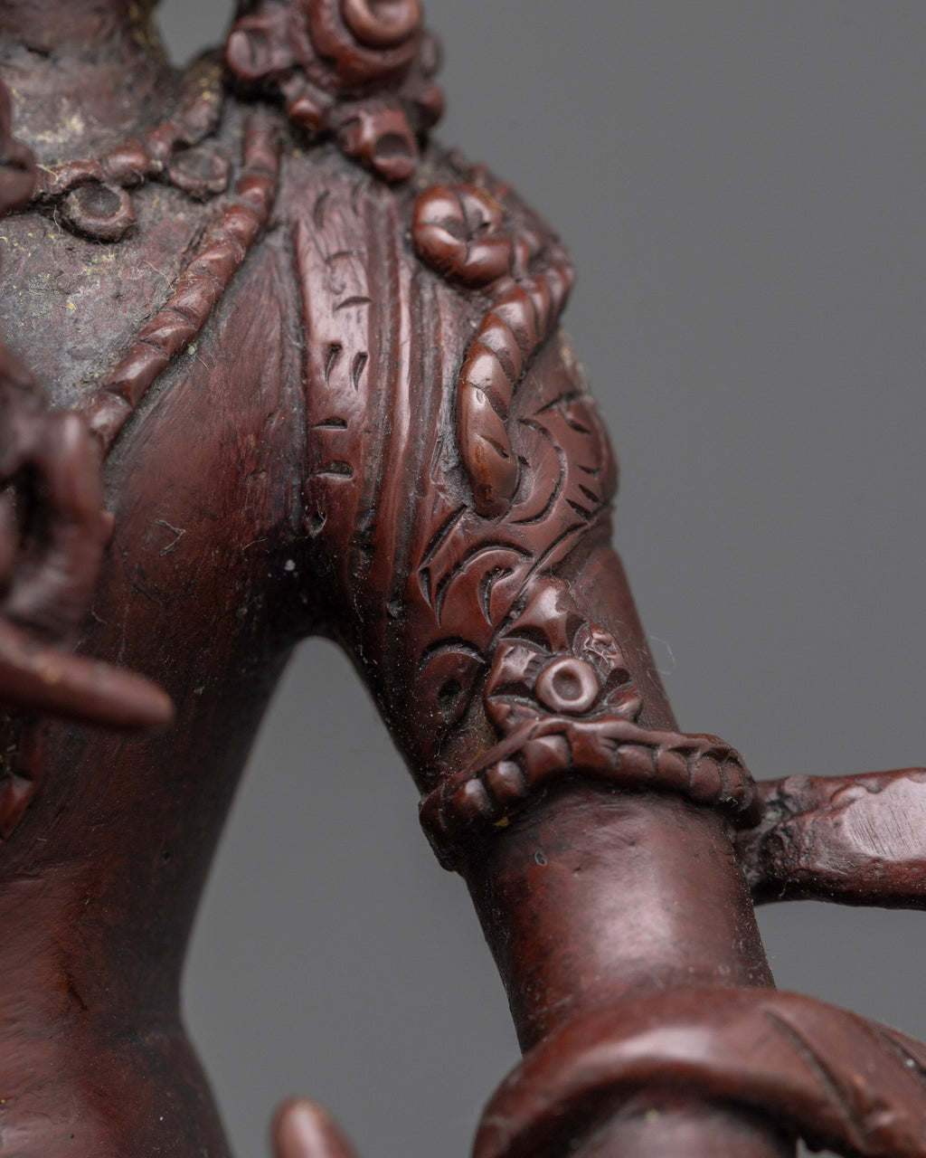 Introducing our Vajrasattva Small Handmade statue, carved with care in Patan, Nepal, using high-quality oxidized copper. This sculpture is a perfect example of Nepalese metalwork; it shows Vajrasattva in a calm, meditative pose, signifying enlightenment and purity. Great artisan talent is highlighted by intricate details and a serene expression, and the oxidized finish adds ageless spiritual depth.