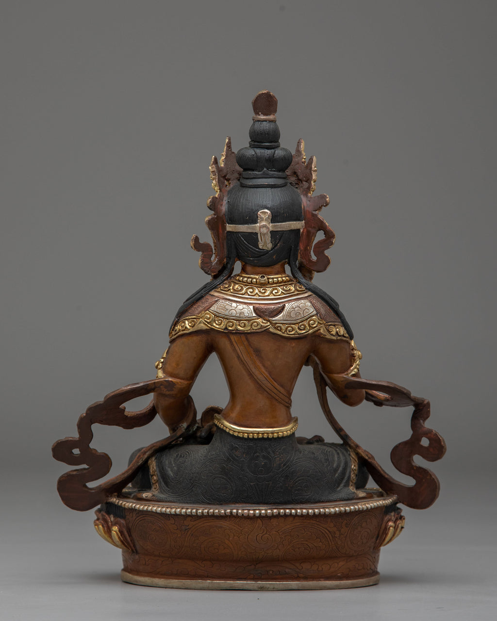 Vajrasattva, holding the vajra and bell, symbolises the diamond-like purity of the enlightened mind and the wisdom of emptiness. This meditation statue serves as a powerful tool for purification, helping to cleanse negative karma and obscurations. It encourages practitioners to develop unwavering compassion and wisdom on their path to enlightenment.