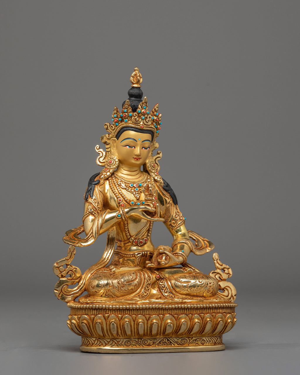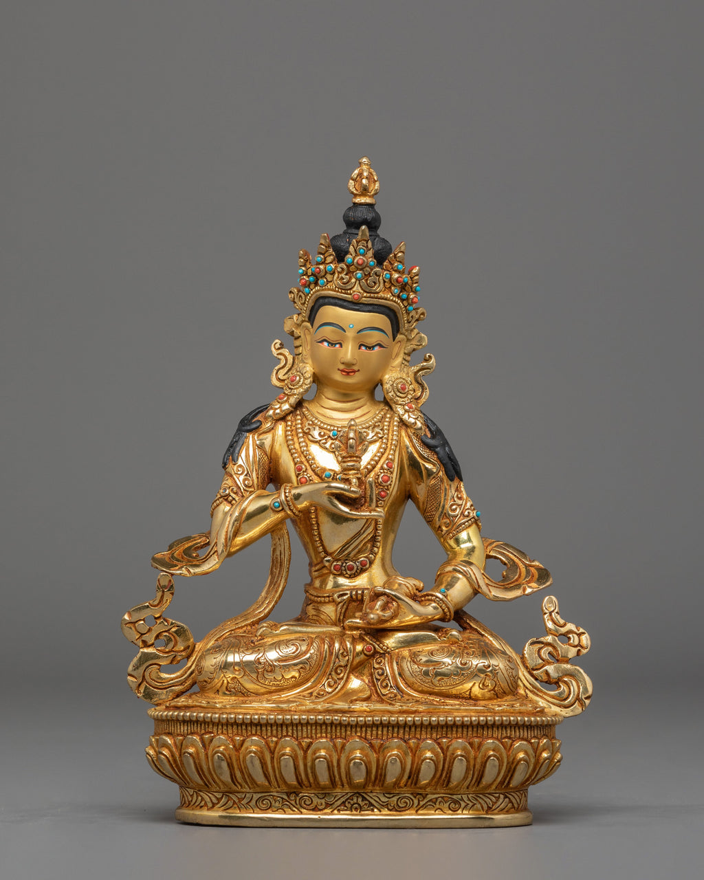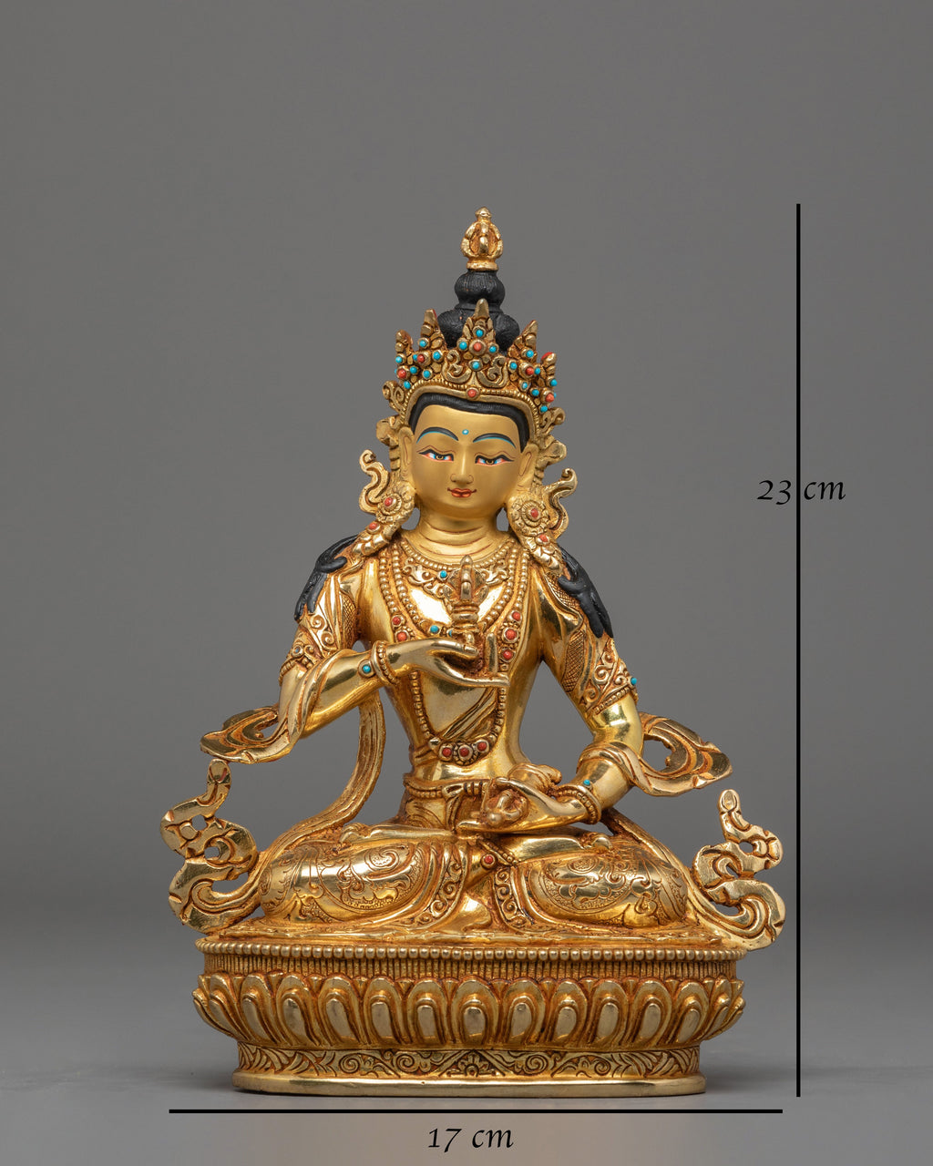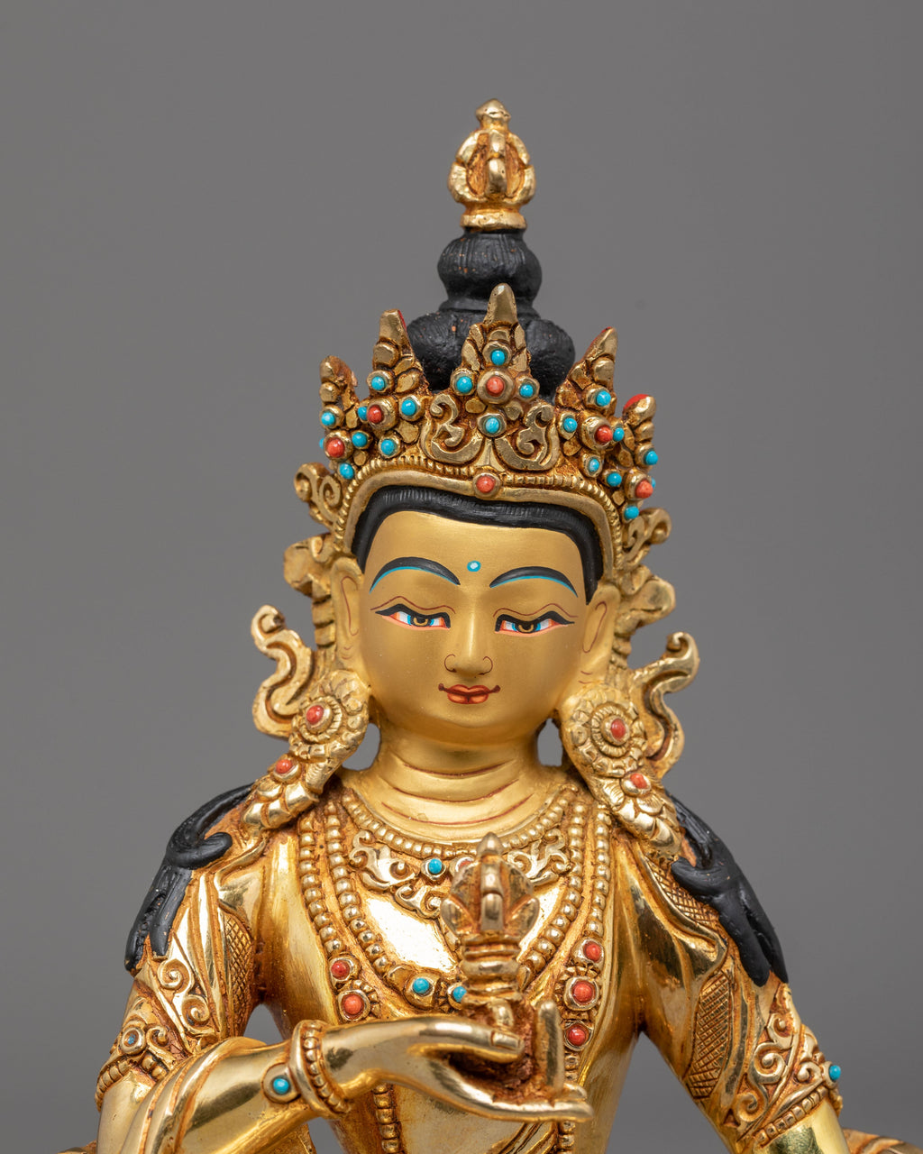 Crafted with meticulous gold plating, the statue features exquisite detailing, highlighting Vajrasattva’s serene and compassionate expression. He is depicted seated in a meditative pose, holding the vajra (diamond scepter), symbolizing the indestructible nature of truth and the power of purification. The artificial stone accents of coral and turquoise add further spiritual significance—coral for protection and turquoise for health and vitality. The detailed design, with its rich symbolism and intricate craftsmanship, makes this statue not only a work of art but a spiritual tool for cleansing the mind and spirit.