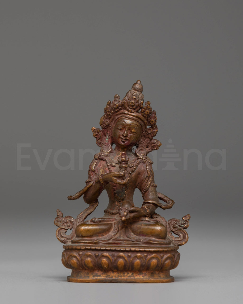 This Vajrasattva Statue for Purification is a finely crafted representation of the deity associated with cleansing negativity, renewing inner clarity, and restoring spiritual harmony. Made from oxidized copper, the statue carries a rich, antique finish that brings depth and expression to every contour. Vajrasattva is shown seated in a calm meditative posture, holding the vajra and bell—symbols of awakened wisdom and compassionate action.