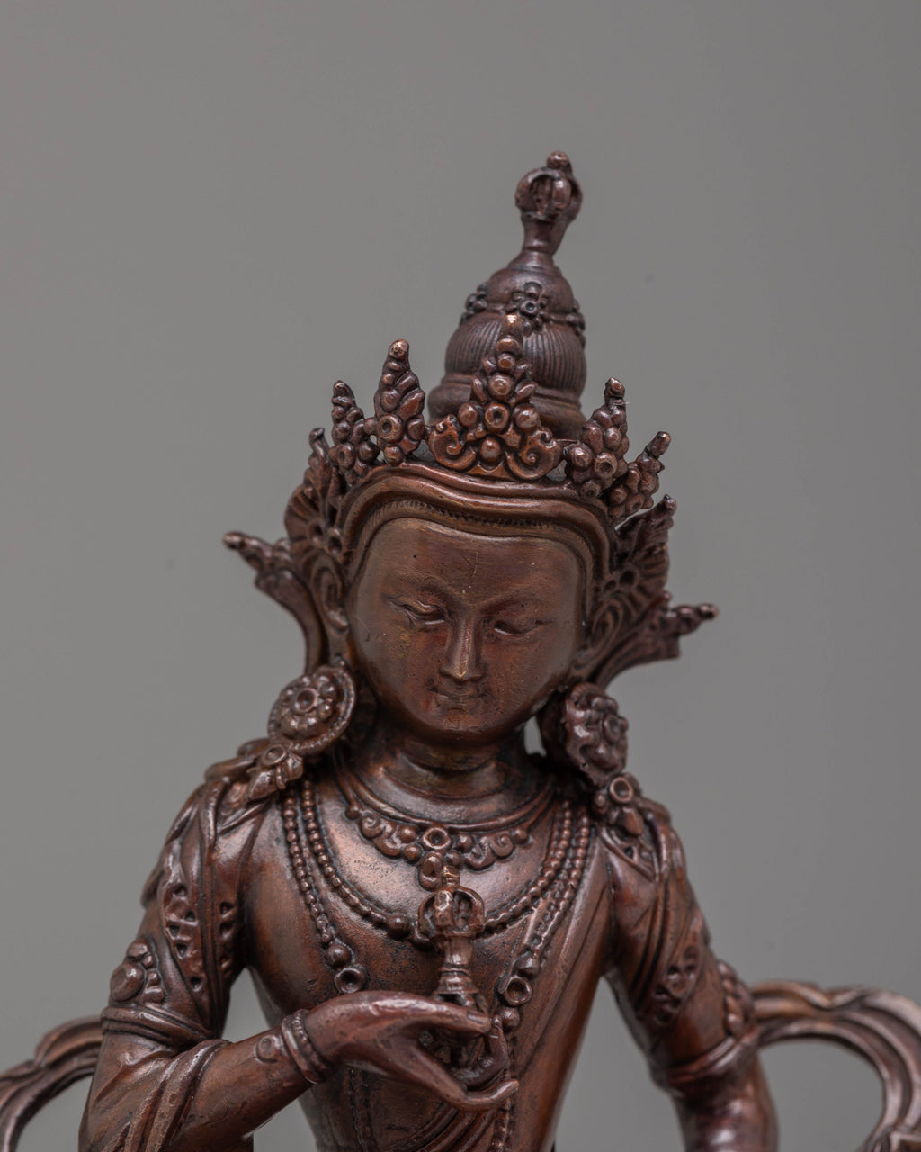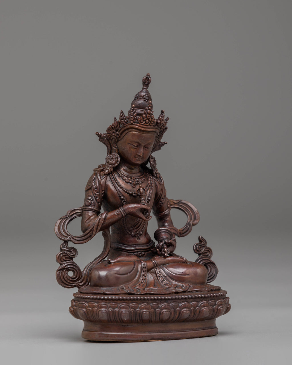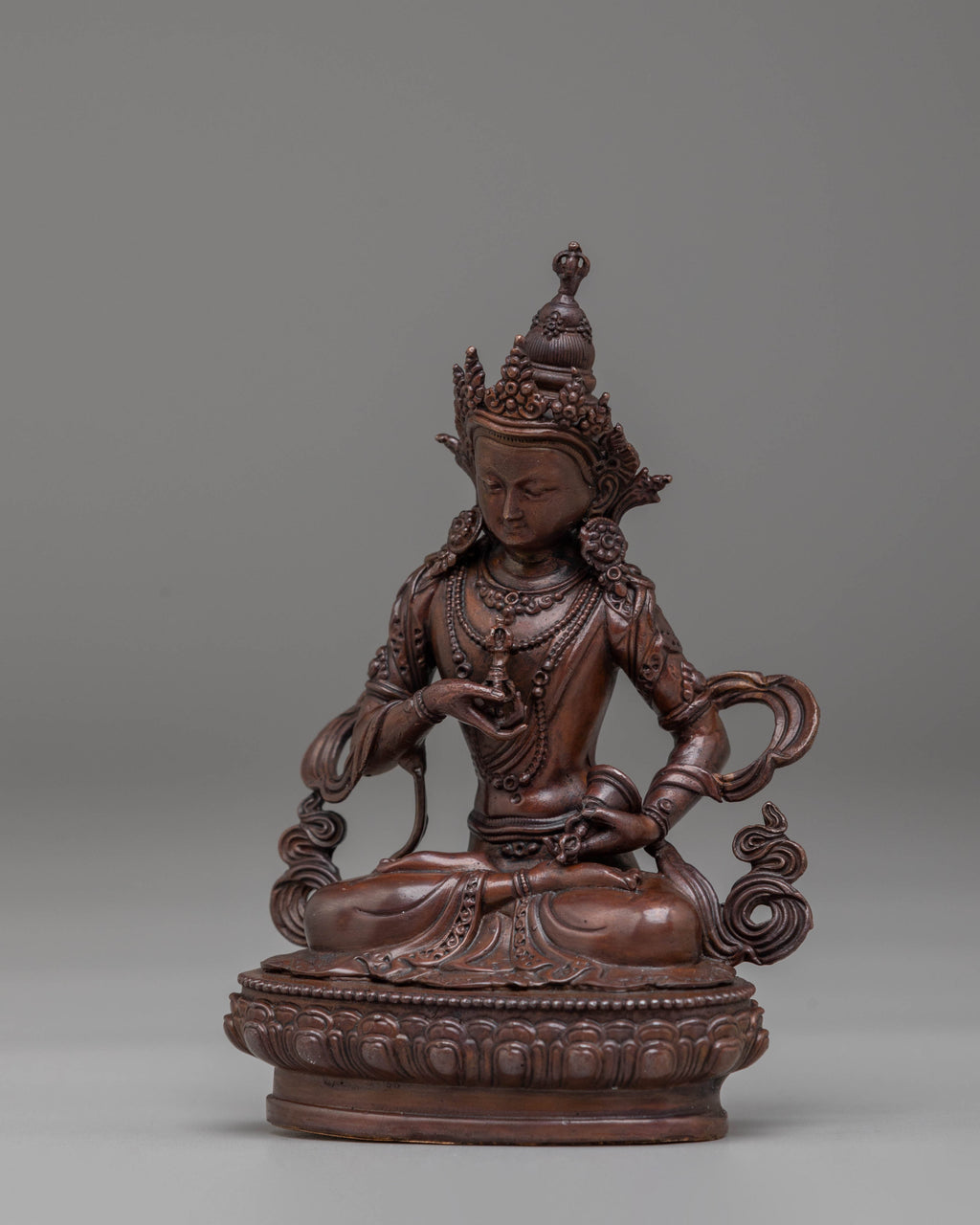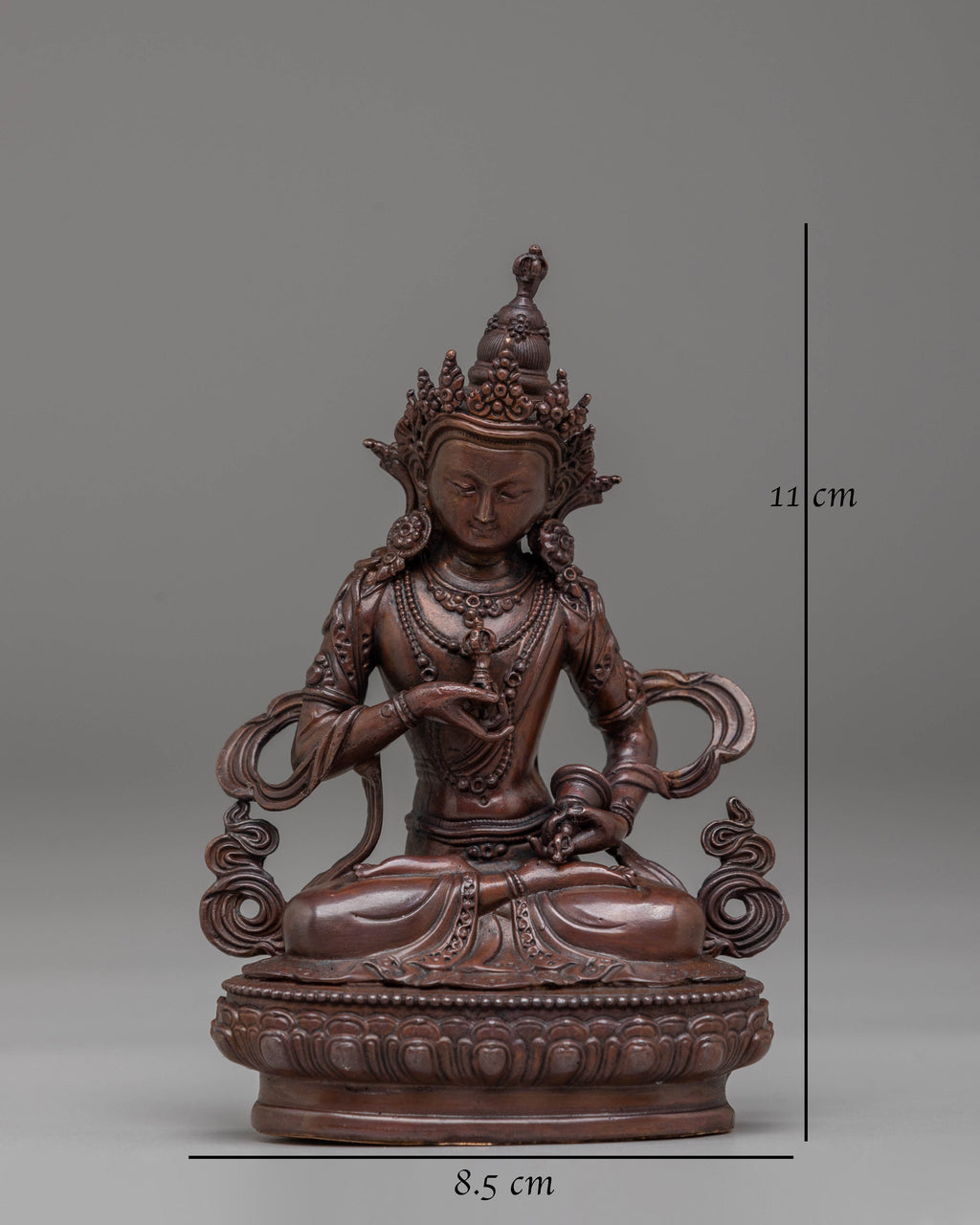 This handcrafted Vajrasattva statue embodies the essence of purification and spiritual cleansing in Tibetan Buddhism. Standing at 11 cm tall, it depicts Vajrasattva holding the vajra and bell, symbols of compassion and wisdom. Crafted from oxidized copper, the statue features a beautiful finish that enhances its spiritual presence. It serves as a powerful tool for meditation, mantra recitation, and rituals to purify negative karma and obstacles.