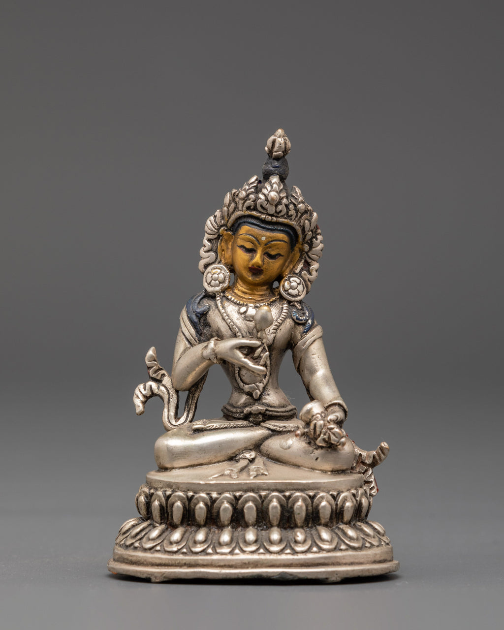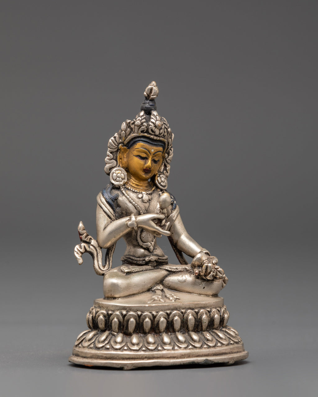 This Vajrasattva Tibetan Deity Statue is a stunning work of Himalayan art, handcrafted from copper and finished with bright silver plating. This sacred sculpture, measuring 10.5cm in height by 7.5cm in breadth and weighing 0.28kg, is compact yet detailed with superb craftsmanship, making it perfect for meditation rooms, altars, or Buddhist temples. The silver plating not only improves its beauty, but also represents spiritual clarity and purity, making this statue an important focal point in any religious area.