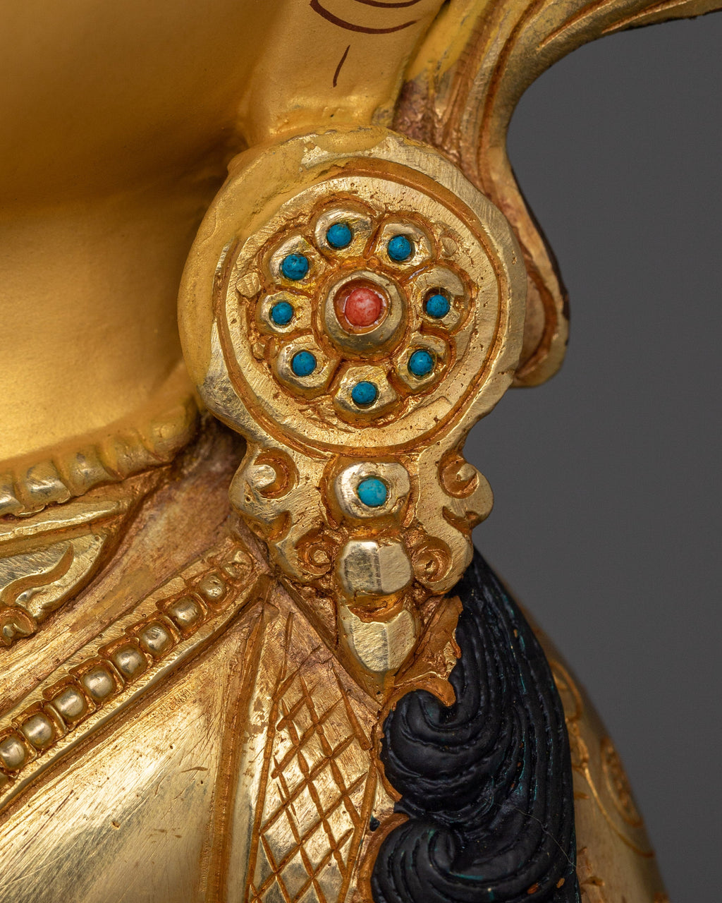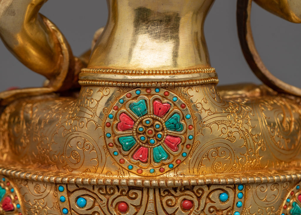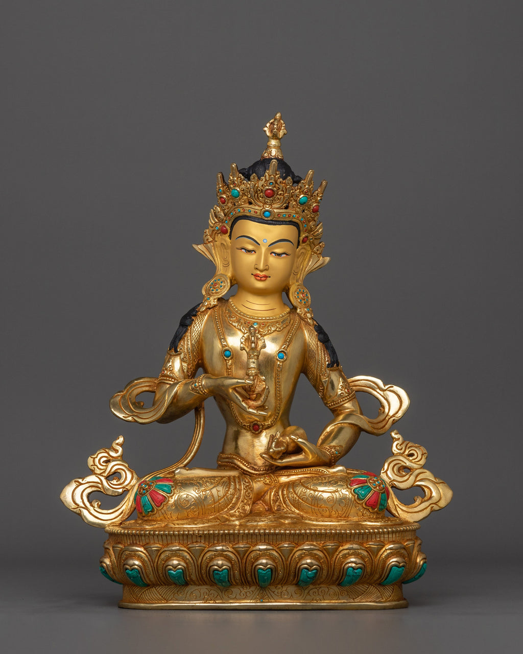 This golden statue of Vajrasattva, also known as the Lord of Purification, measures 13.2”/33.5cm in height and 11.4”/29cm at the base, with a weight of 3.27 kg. Crafted from a copper body, it is adorned with 24K gold gilding, detailed gold and acrylic paintings, and hand-carved gemstones. Carefully made by skilled artisans, this piece is well-suited for meditation spaces, altars, or as a meaningful addition to your home decor.