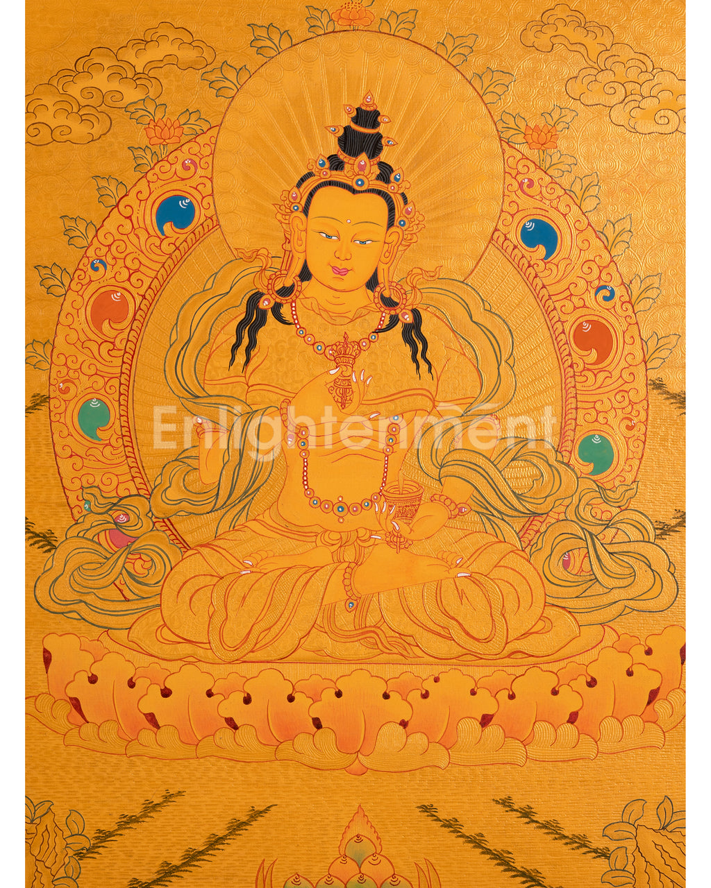 In this thangka, Vajrasattva, embodying purity and transformation, is seated on a lotus throne. His white body symbolizes clarity and purification of karma, with a tranquil expression that conveys compassion and wisdom. He holds a vajra near his heart, symbolizing truth, and a bell on his thigh, representing wisdom and emptiness. Golden tones show his divine energy, while lotus petals and a halo emphasize his purity. This sacred thangka functions as a meditation aid and a visual of spiritual cleansing, inviting peace, forgiveness, and transformation.