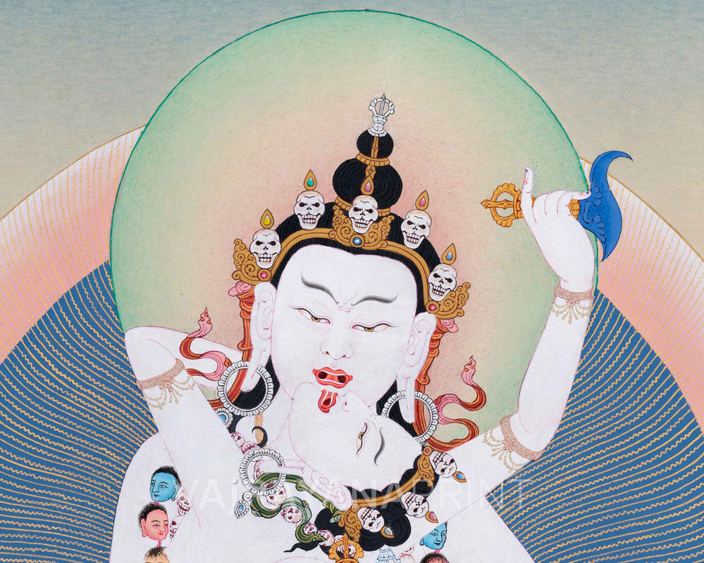 The Vajrasattva with Consort Canvas Print is a high-quality reproduction of a thangka, retaining the sacred details, vivid colors, and symbolic richness of the original. Printed on sturdy canvas and available in customizable sizes, this piece portrays the divine presence of Vajrasattva and his consort. It makes an ideal addition to meditation rooms, altars, or spiritual collections. Beyond its decorative value, this canvas serves as a spiritual aid for purification, meditation, and devotion.