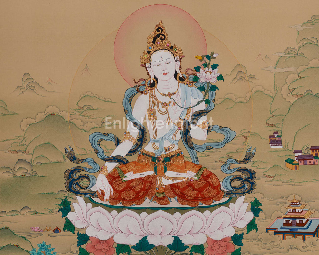 Divine Vajrayana Deity White Tara Thangka | Symbol of Compassion and Longevity