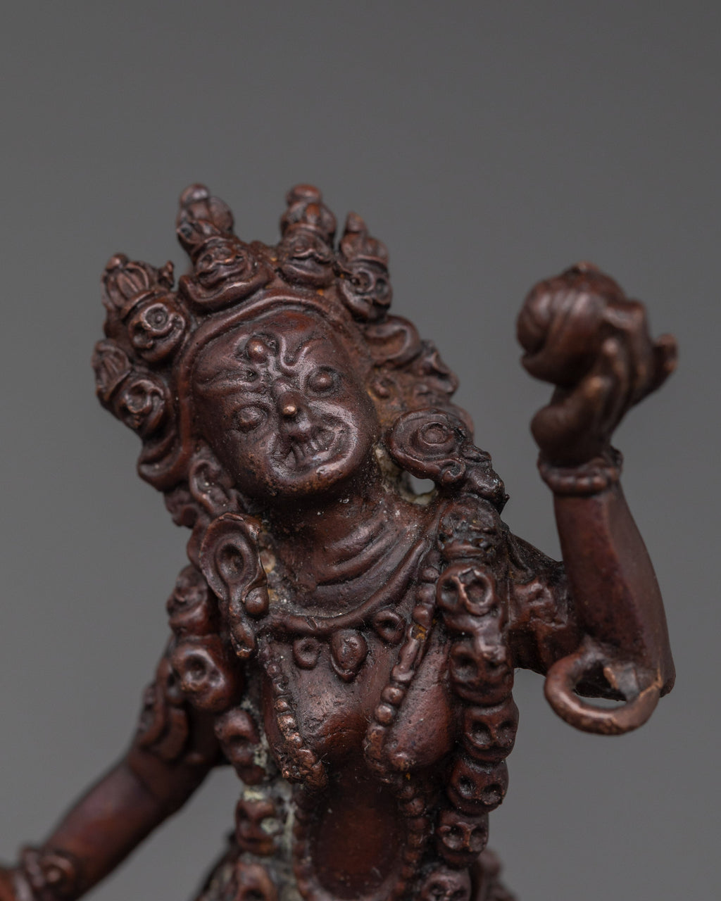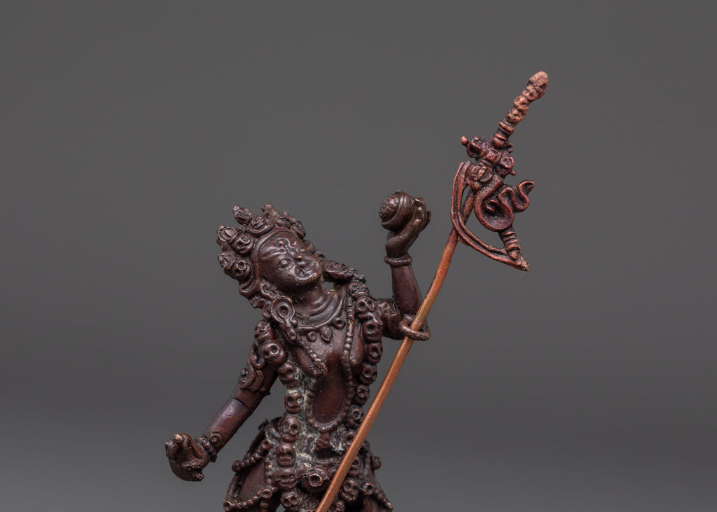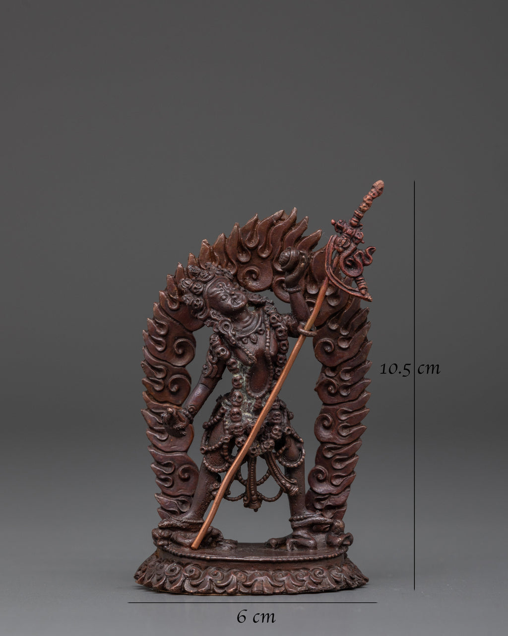 Standing 10.5 cm tall and 6 cm wide, this magnificent Vajrayogini Buddhist Dakini Statue is meticulously handcrafted from oxidized copper to display a sacred tantric goddess. This small but strong figure, weighing only 0.14 kg, is ideal for your home altar, meditation area, or holy shrine. The fiery tantric goddess Vajrayogini is revered for her transformative power and ability to aid devotees in overcoming challenges on their spiritual path.