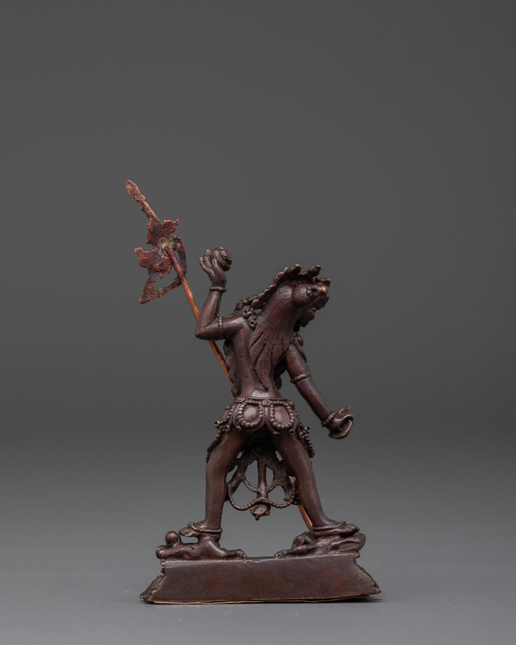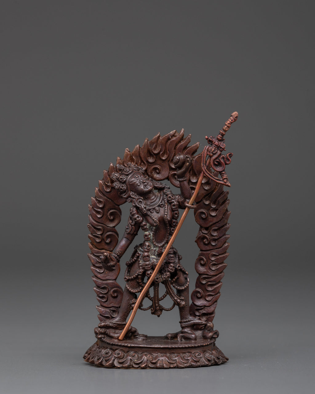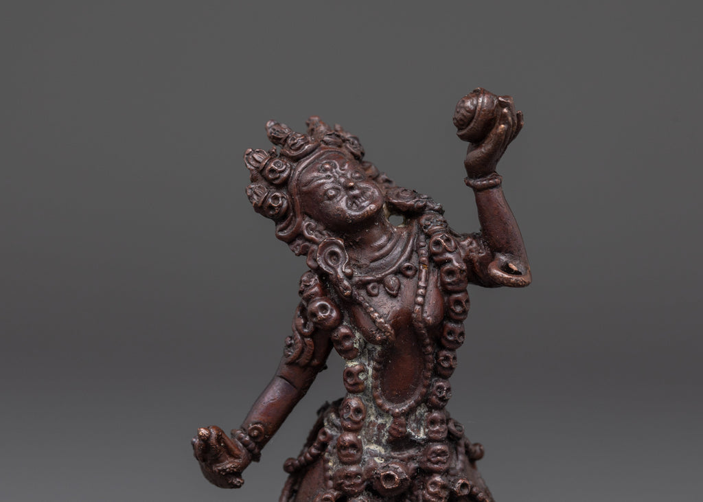 Standing 10.5 cm tall and 6 cm wide, this magnificent Vajrayogini Buddhist Dakini Statue is meticulously handcrafted from oxidized copper to display a sacred tantric goddess. This small but strong figure, weighing only 0.14 kg, is ideal for your home altar, meditation area, or holy shrine. The fiery tantric goddess Vajrayogini is revered for her transformative power and ability to aid devotees in overcoming challenges on their spiritual path.