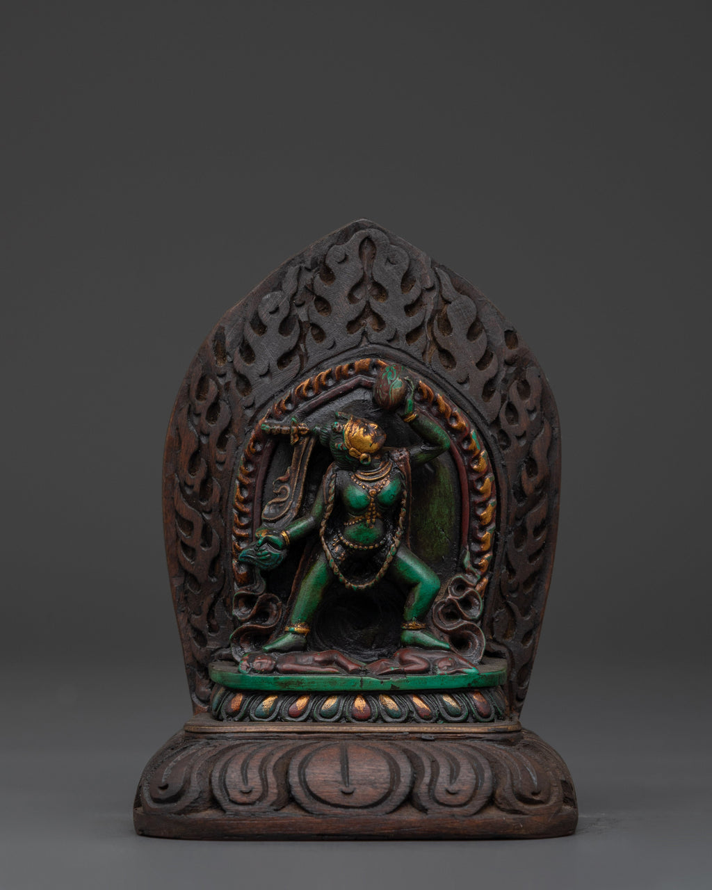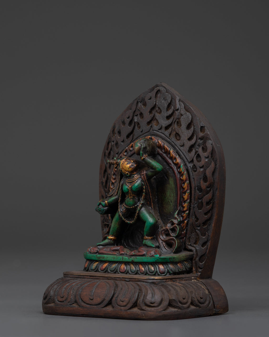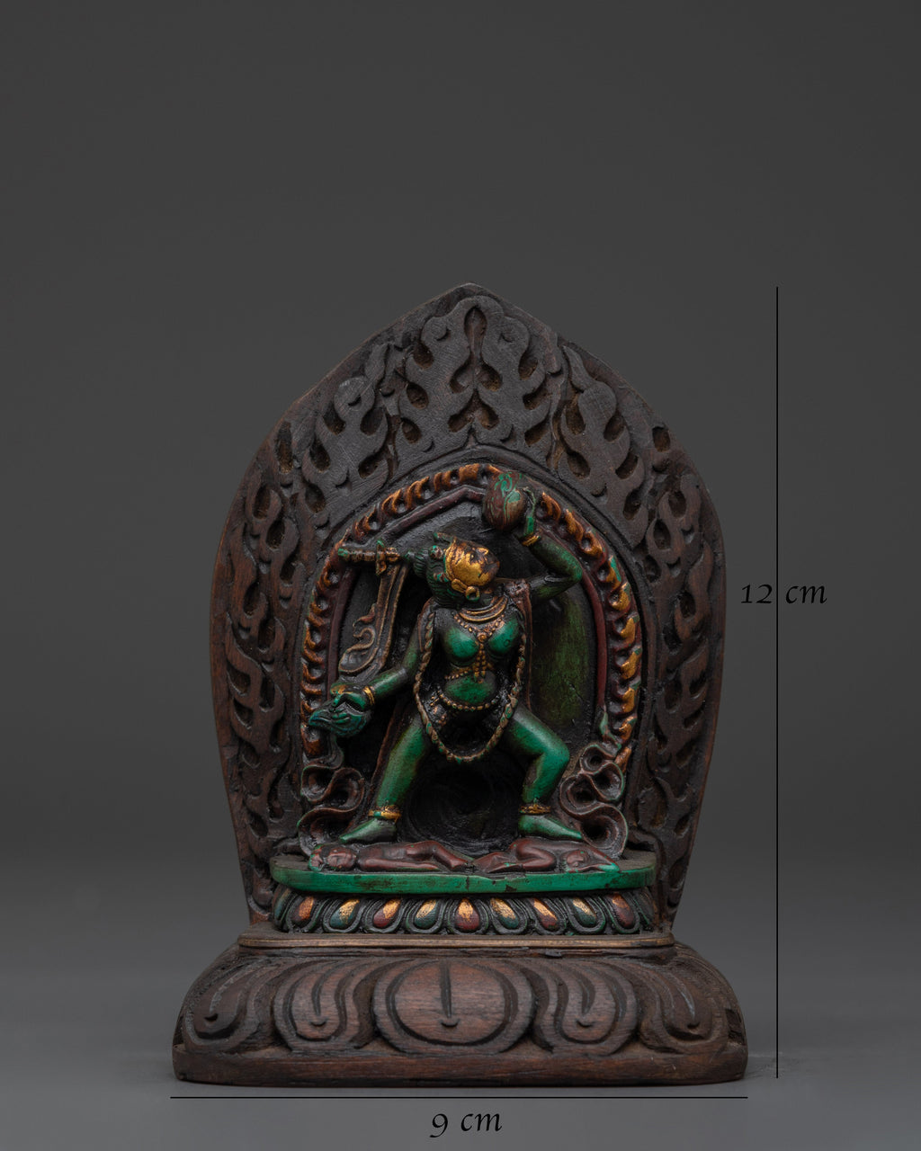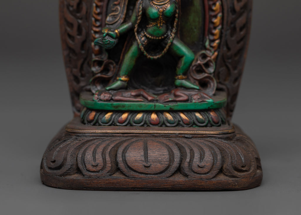 Bring the heavenly aura of Vajrayogini, the Goddess of Wisdom, into your house with this gorgeous carved wooden statue. Standing 12 cm tall, this complex sculpture depicts the goddess's strength, wisdom, and beauty. The figure, painted in vivid green acrylic colors, represents spiritual clarity and provides advice to individuals seeking enlightenment. This revered figure, whether displayed on an altar or used in meditation areas, serves as a reminder of Vajrayogini's ability to overcome obstacles and attain wisdom. This statue is both a spiritual item and a stunning work of art, thanks to its superb wood carving and rich acrylic colors.