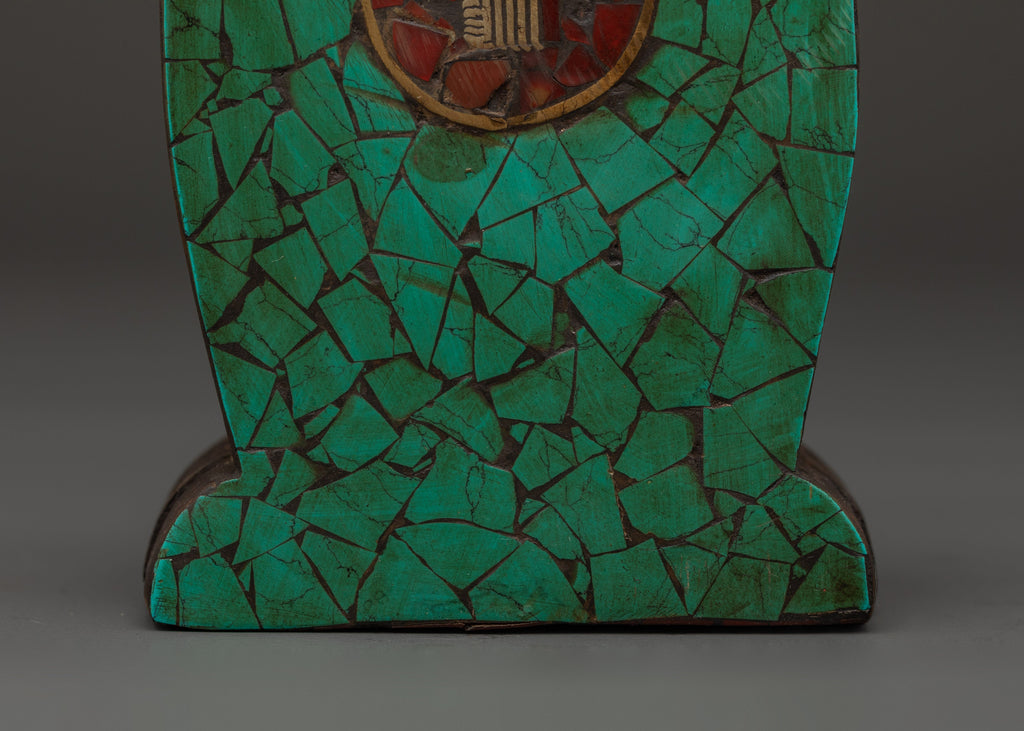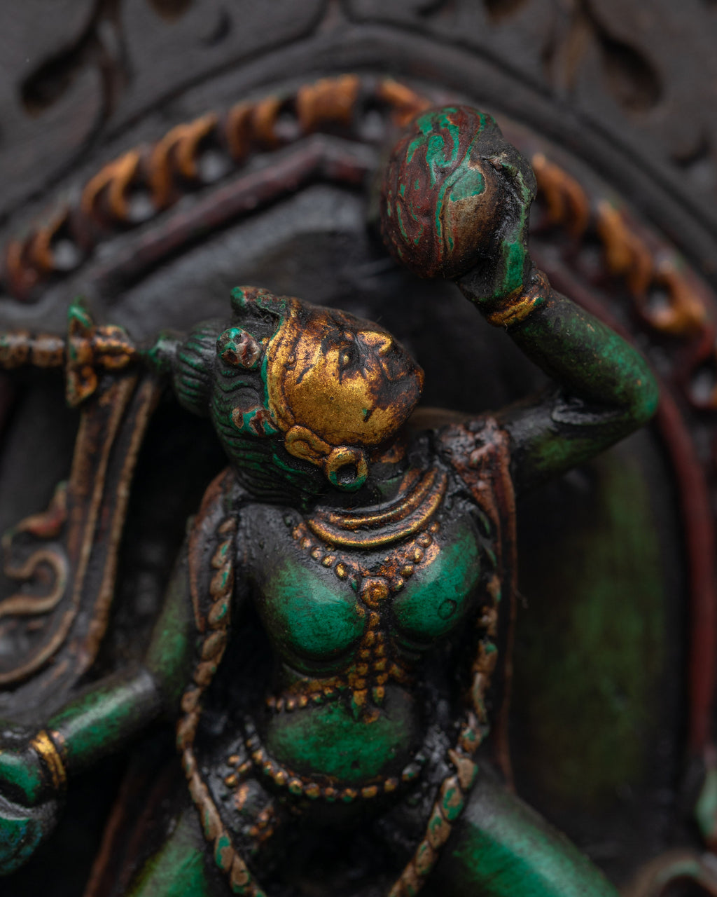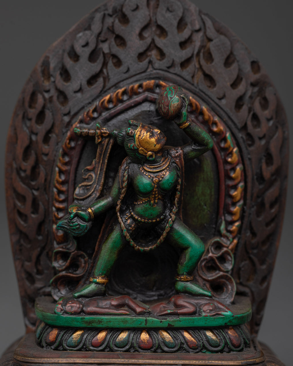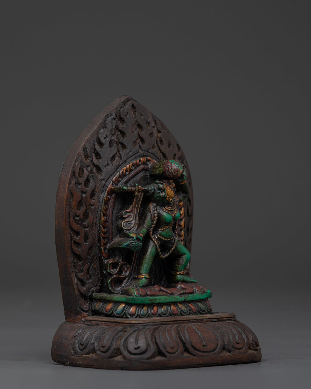 Bring the heavenly aura of Vajrayogini, the Goddess of Wisdom, into your house with this gorgeous carved wooden statue. Standing 12 cm tall, this complex sculpture depicts the goddess's strength, wisdom, and beauty. The figure, painted in vivid green acrylic colors, represents spiritual clarity and provides advice to individuals seeking enlightenment. This revered figure, whether displayed on an altar or used in meditation areas, serves as a reminder of Vajrayogini's ability to overcome obstacles and attain wisdom. This statue is both a spiritual item and a stunning work of art, thanks to its superb wood carving and rich acrylic colors.